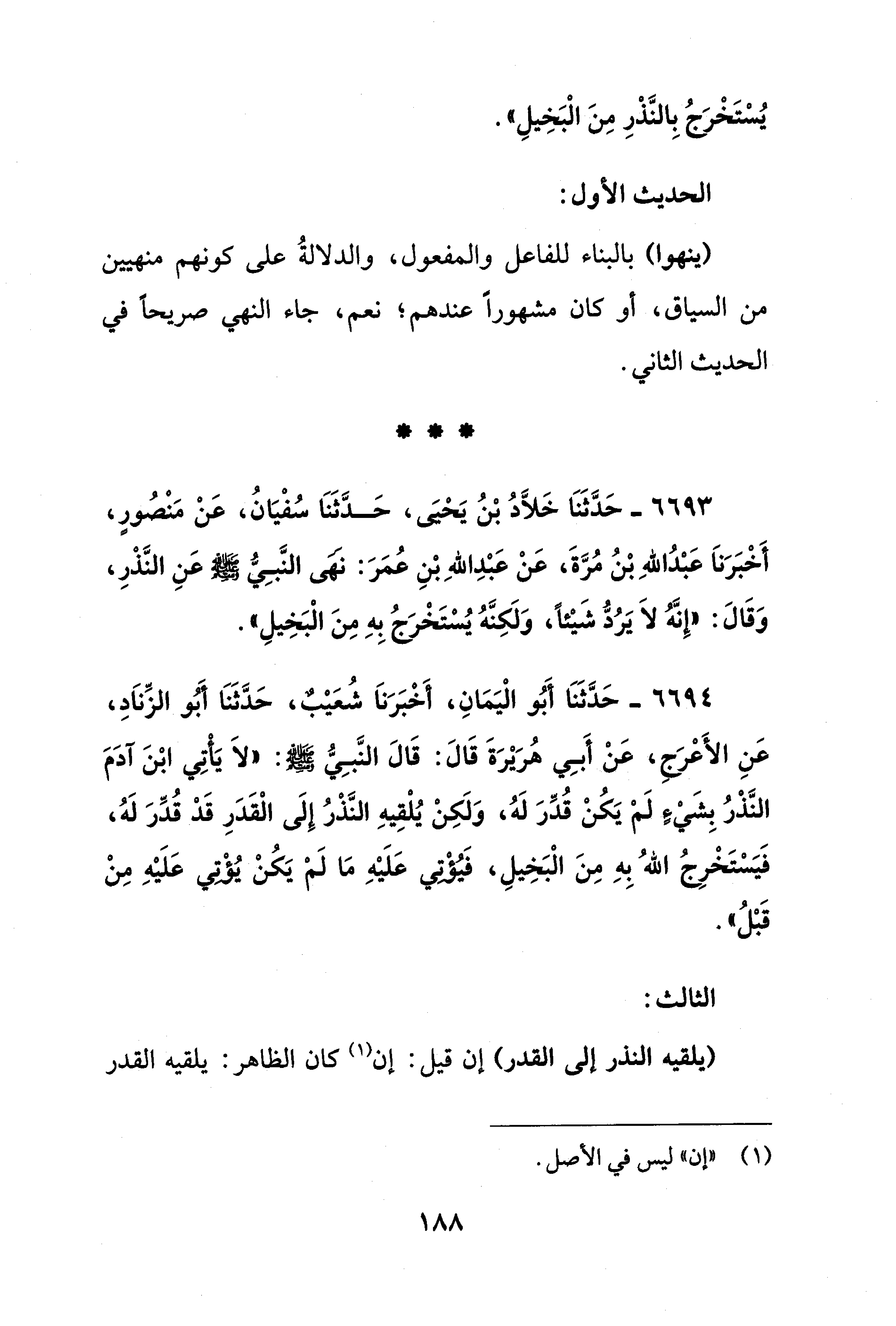 6693 - حَدَّثَنَا خَلَّادُ بنُ يَحْيَى، حَدَّثَنَا سُفْيَانُ، عَنْ مَنْصُورٍ، أَخْبَرَنَا عَبْدُ اللهِ بِنُ مُرَّةَ، عَنْ عَبْدِ اللهِ بنِ عُمَرَ: نَهَى النَّبِيُّ - صلى الله عليه وسلم - عَنِ النَّذْرِ، وَقَالَ: "إِنَّهُ لَا يَرُدُّ شَيْئًا، وَلَكِنَّهُ يُسْتَخْرَجُ بِهِ مِنَ الْبَخِيلِ".