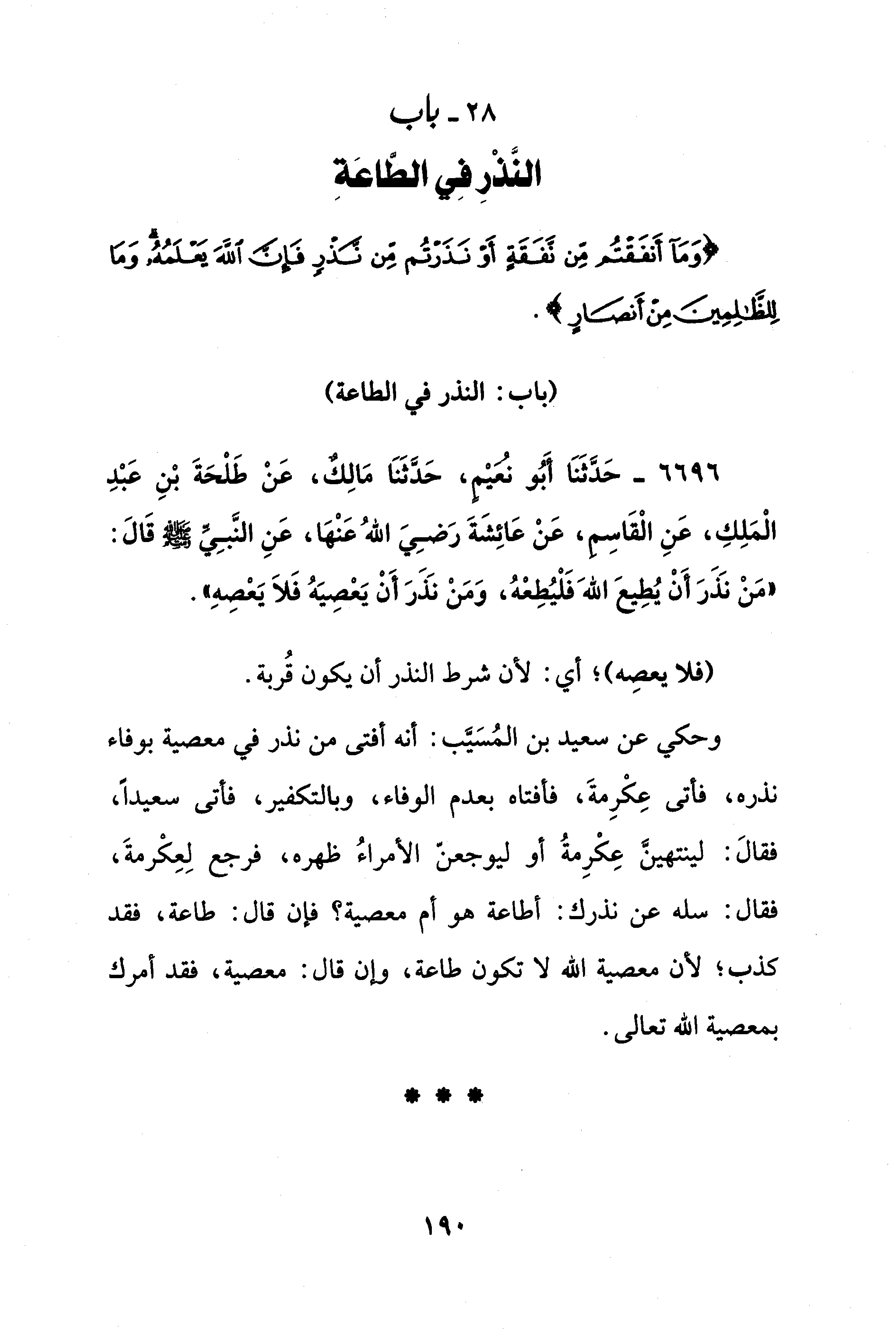 6696 - حَدَّثَنَا أَبُو نُعَيْمٍ، حَدَّثَنَا مَالِكٌ، عَنْ طَلْحَةَ بْنِ عَبْدِ الْمَلِكِ، عَنِ الْقَاسِمِ، عَنْ عَائِشَةَ رَضِيَ اللهُ عَنْهَا، عَنِ النَّبِيِّ - صلى الله عليه وسلم - قَالَ: "مَنْ نَذَرَ أَنْ يُطِيعَ اللهَ فَلْيُطِعْهُ، وَمَنْ نَذَرَ أَنْ يَعْصِيَهُ فَلَا يَعْصِهِ".