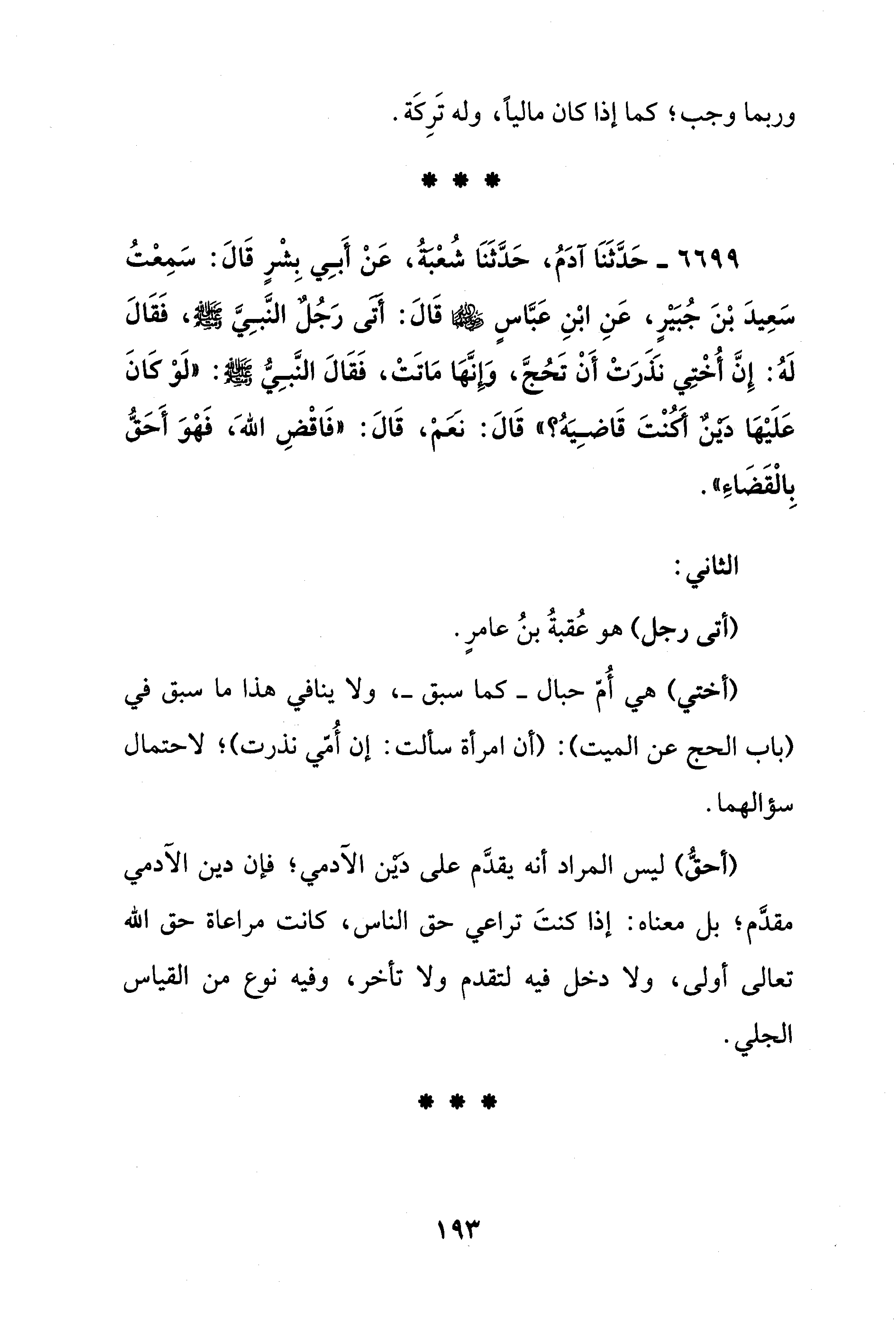 6699 - حَدَّثَنَا آدَمُ، حَدَّثَنَا شُعْبَةُ، عَنْ أَبِي بِشْرٍ قَالَ: سَمِعْتُ سَعِيدَ بْنَ جُبَيْرٍ، عَنِ ابْنِ عَبَّاسٍ - رضي الله عنهما - قَالَ: أَتَى رَجُلٌ النَّبِيَّ - صلى الله عليه وسلم -، فَقَالَ لَهُ: إِنَّ أُخْتِي نَذَرَتْ أَنْ تَحُجَّ، وَإِنَّهَا مَاتَتْ، فَقَالَ النَّبِيُّ - صلى الله عليه وسلم -: "لَوْ كَانَ عَلَيْهَا دَيْنٌ أَكُنْتَ قَاضِيَهُ؟ " قَالَ: نعمْ، قَالَ: "فَاقْضِ الله، فَهْوَ أَحَقُّ بِالْقَضَاءِ".