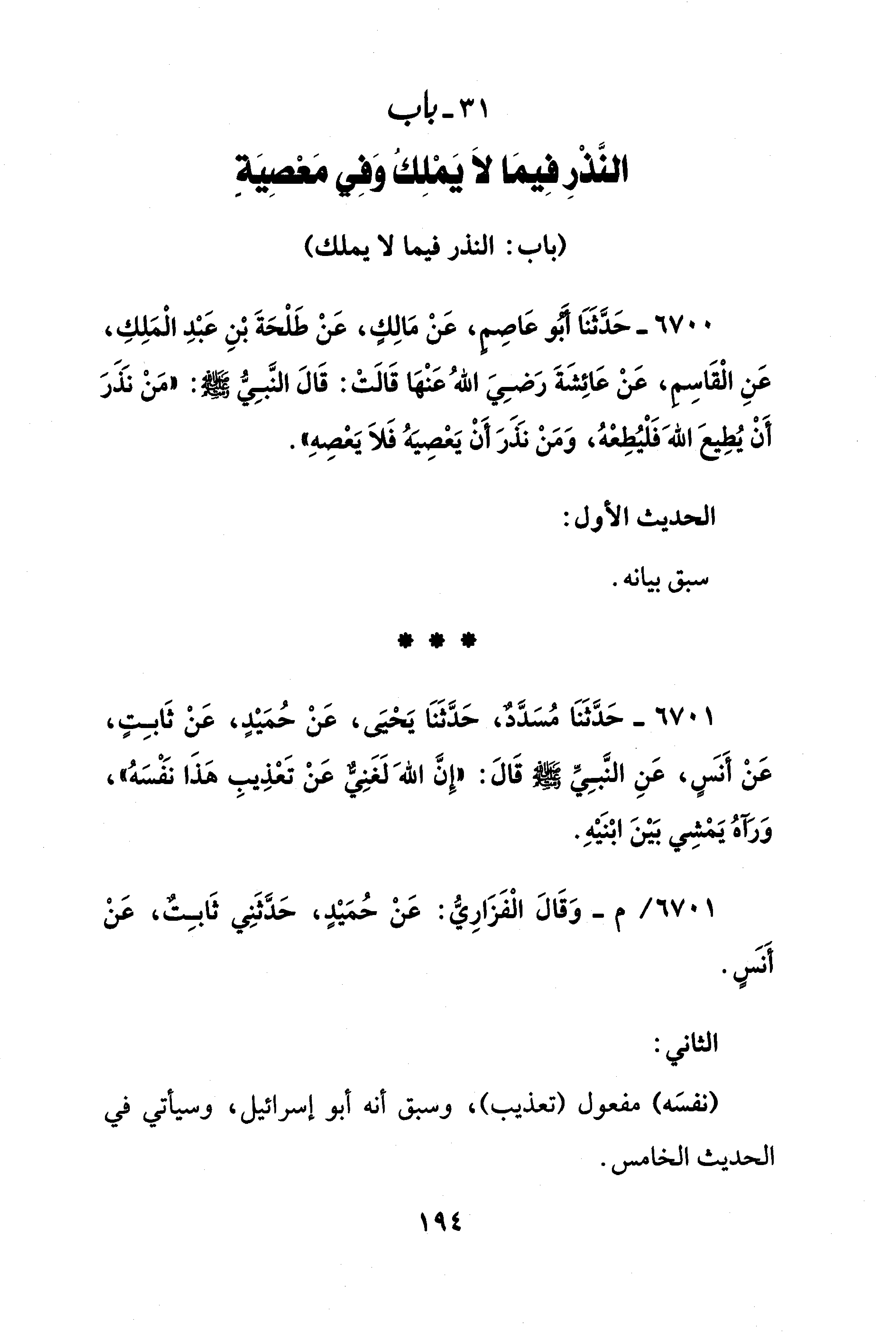 31 - باب النَّذْرِ فِيمَا لَا يَمْلِكُ وَفِي مَعْصِيَة