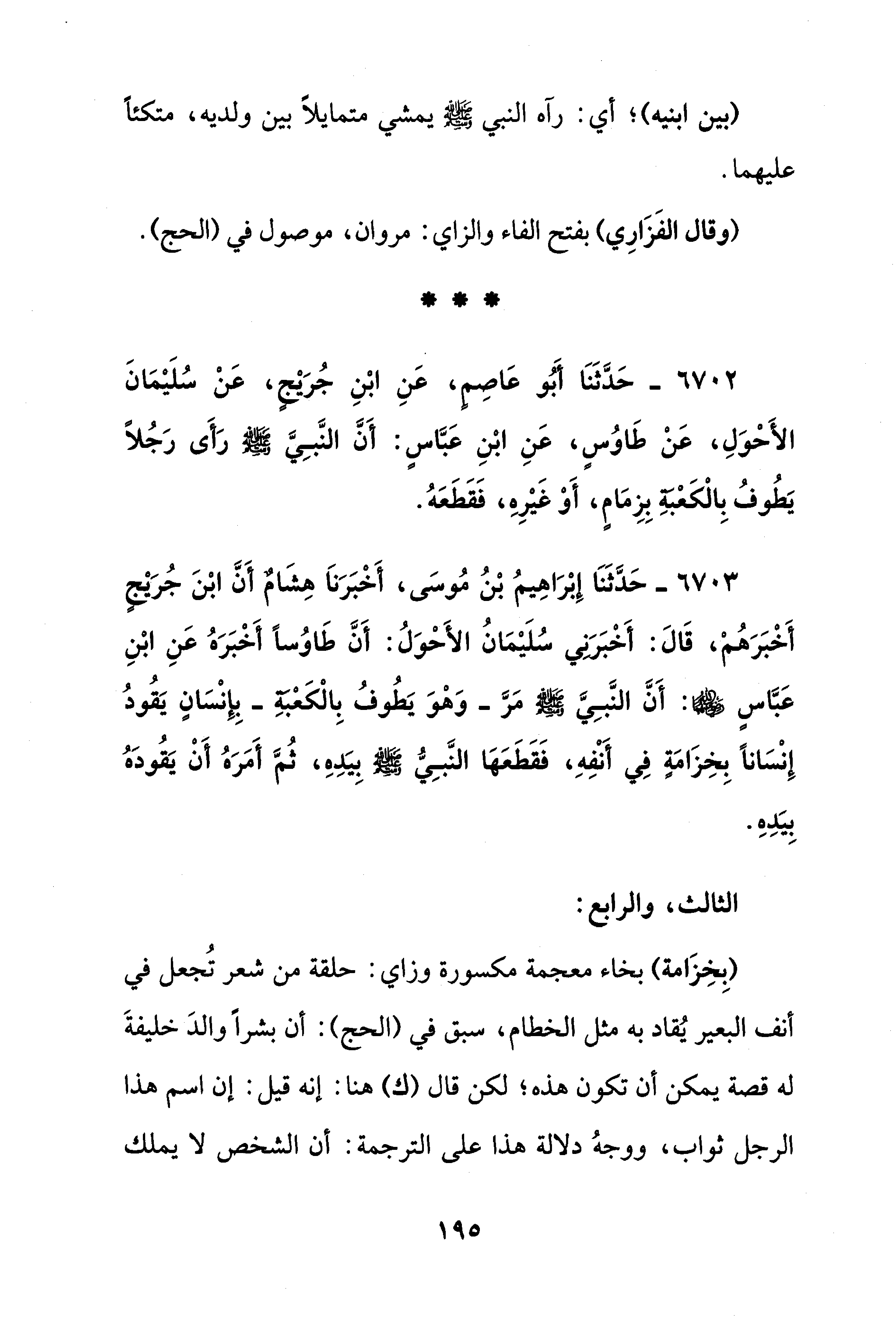 6702 - حَدَّثَنَا أَبُو عَاصِمٍ، عَنِ ابْنِ جُرَيْجٍ، عَنْ سُلَيْمَانَ الأَحْوَلِ، عَنْ طَاوُسٍ، عَنِ ابْنِ عَبَّاسٍ: أَنَّ النَّبِيَّ - صلى الله عليه وسلم - رَأَى رَجُلًا يَطُوفُ بِالْكَعْبَةِ بِزِمَامٍ، أَوْ غَيْرِهِ، فَقَطَعَهُ.