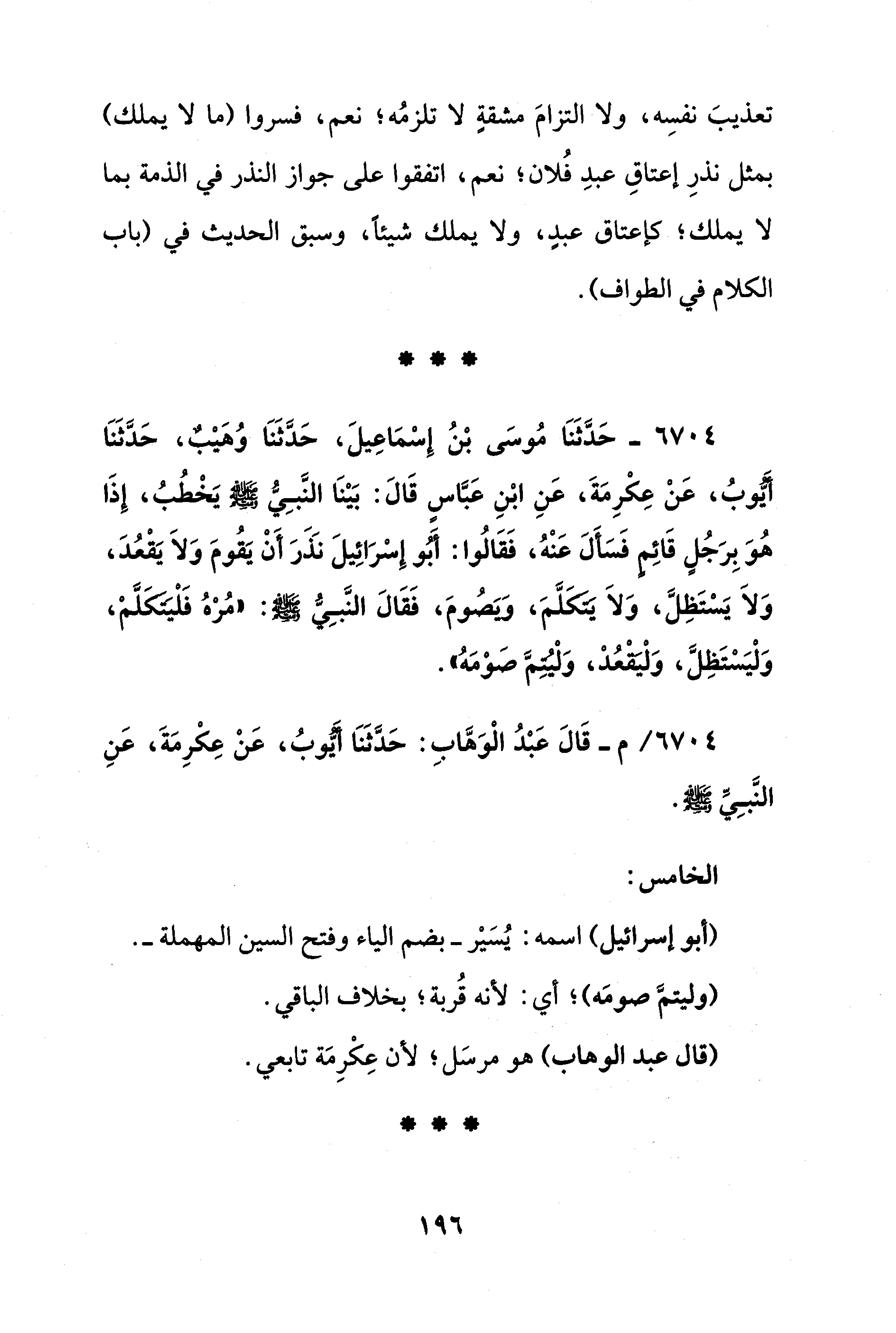 6704 - حَدَّثَنَا مُوسَى بْنُ إِسْمَاعِيلَ، حَدَّثَنَا وُهَيْبٌ، حَدَّثَنَا أَيُّوبُ، عَنْ عِكْرِمَةَ، عَنِ ابْنِ عَبَّاسٍ قَالَ: بَيْنَا النَّبِيُّ - صلى الله عليه وسلم - يَخْطُبُ، إِذَا هُوَ بِرَجُلٍ قَائِمٍ فَسَأَلَ عَنْهُ، فَقَالُوا: أَبُو إِسْرَائِيلَ نَذَرَ أَنْ يَقُومَ وَلَا يَقْعُدَ، وَلَا يَسْتَظِلَّ، وَلَا يَتَكَلَّمَ، وَيَصُومَ، فَقَالَ النَّبِيُّ - صلى الله عليه وسلم -: "مُرْهُ فَلْيَتَكَلَّمْ، وَلْيَسْتَظِلَّ، وَلْتقْعُدْ، وَلْيُتِمَّ صَوْمَهُ".