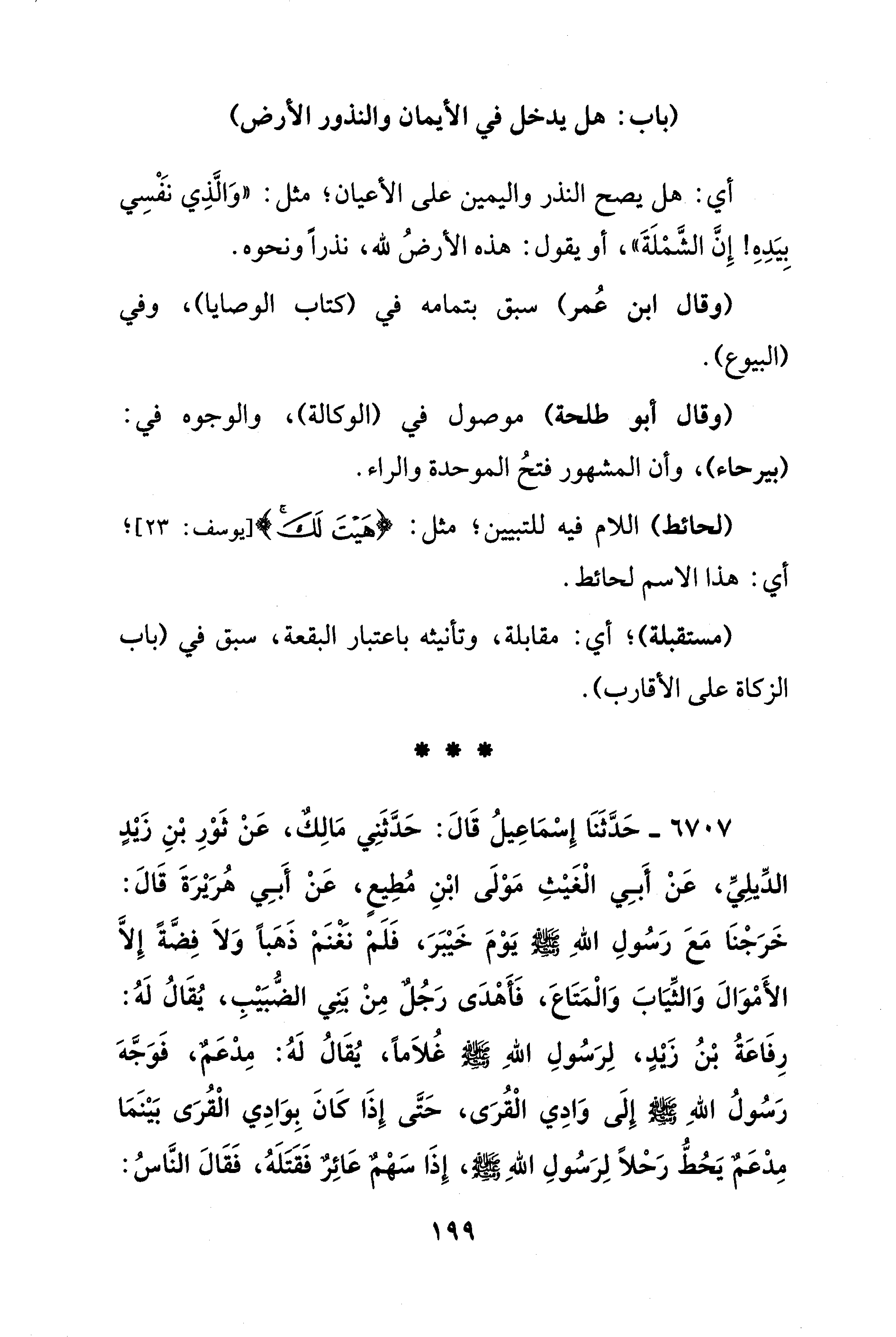6707 - حَدَّثَنَا إِسْمَاعِيلُ قَالَ: حَدَّثَنِي مَالِكٌ، عَنْ ثَوْرِ بْنِ زيدٍ الدِّيلِيِّ، عَنْ أَبِي الْغَيْثِ مَوْلَى ابْنِ مُطِيعٍ، عَنْ أَبِي هُرَيْرَةَ قَالَ: خَرَجْنَا مَعَ رَسُولِ اللهِ - صلى الله عليه وسلم - يَوْمَ خَيْبَرَ، فَلَمْ نَغْنَمْ ذَهَبًا وَلَا فِضَّةً إلا الأَمْوَالَ وَالثِّيَابَ وَالْمَتَاعَ، فَأهْدَى رَجُلٌ مِنْ بَنِي الضُّبَيْبِ، يُقَالُ لَهُ: رِفَاعَةُ بِنُ زيدٍ، لِرَسُولِ اللهِ - صلى الله عليه وسلم - غُلَامًا، يُقَالُ لَهُ: مِدْعَمٌ، فَوَجَّهَ رَسُولُ اللهِ - صلى الله عليه وسلم - إِلَى وَادِي الْقُرَى، حَتَّى إِذَا كَانَ بِوَادِي الْقُرَى بَيْنَمَا مِدْعَمٌ يَحُطُّ رَحْلًا لِرَسُولِ اللهِ - صلى الله عليه وسلم -، إِذَا سَهْمٌ عَائِرٌ فَقَتَلَهُ، فَقَالَ النَّاسُ: