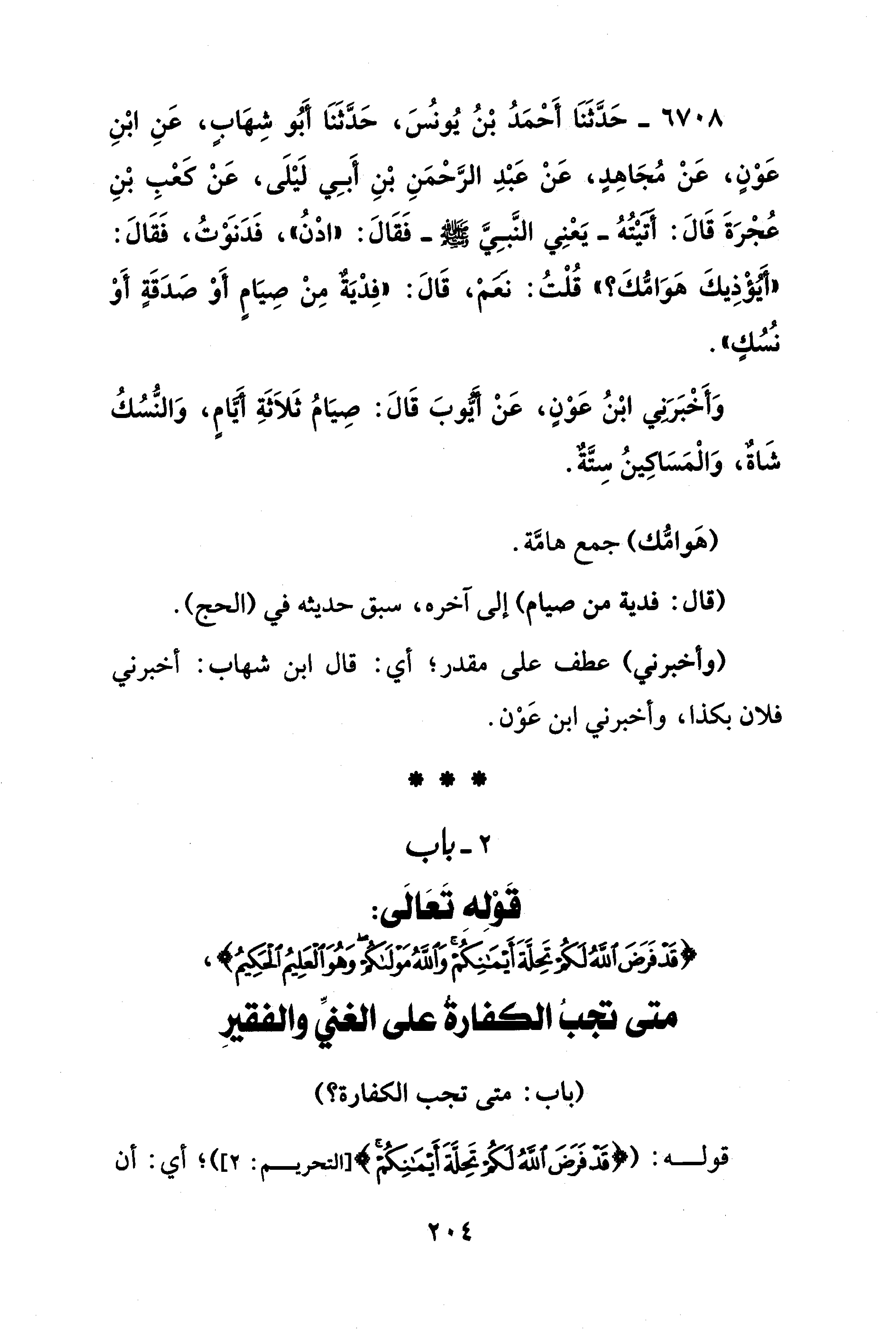 6708 - حَدَّثَنَا أَحْمَدُ بْنُ يُونس، حَدَّثَنَا أَبُو شِهَابٍ، عَنِ ابْنِ عَوْنٍ، عَنْ مُجَاهِدٍ، عَنْ عَبْدِ الرَّحْمَنِ بْنِ أَبِي لَيْلَى، عَنْ كعْبِ بْنِ عُجْرَةَ قَالَ: أَتَيْتُهُ -يَعْنِي النَّبِيَّ - صلى الله عليه وسلم - فَقَالَ: "ادْنُ"، فَدَنَوْتُ، فَقَالَ: "أَيُؤْذِيكَ هَوَامُّكَ؟ " قُلْتُ: نعمْ، قَالَ: "فِدْيَةٌ مِنْ صِيَامٍ أَوْ صدَقَةٍ أَوْ نُسُكٍ".