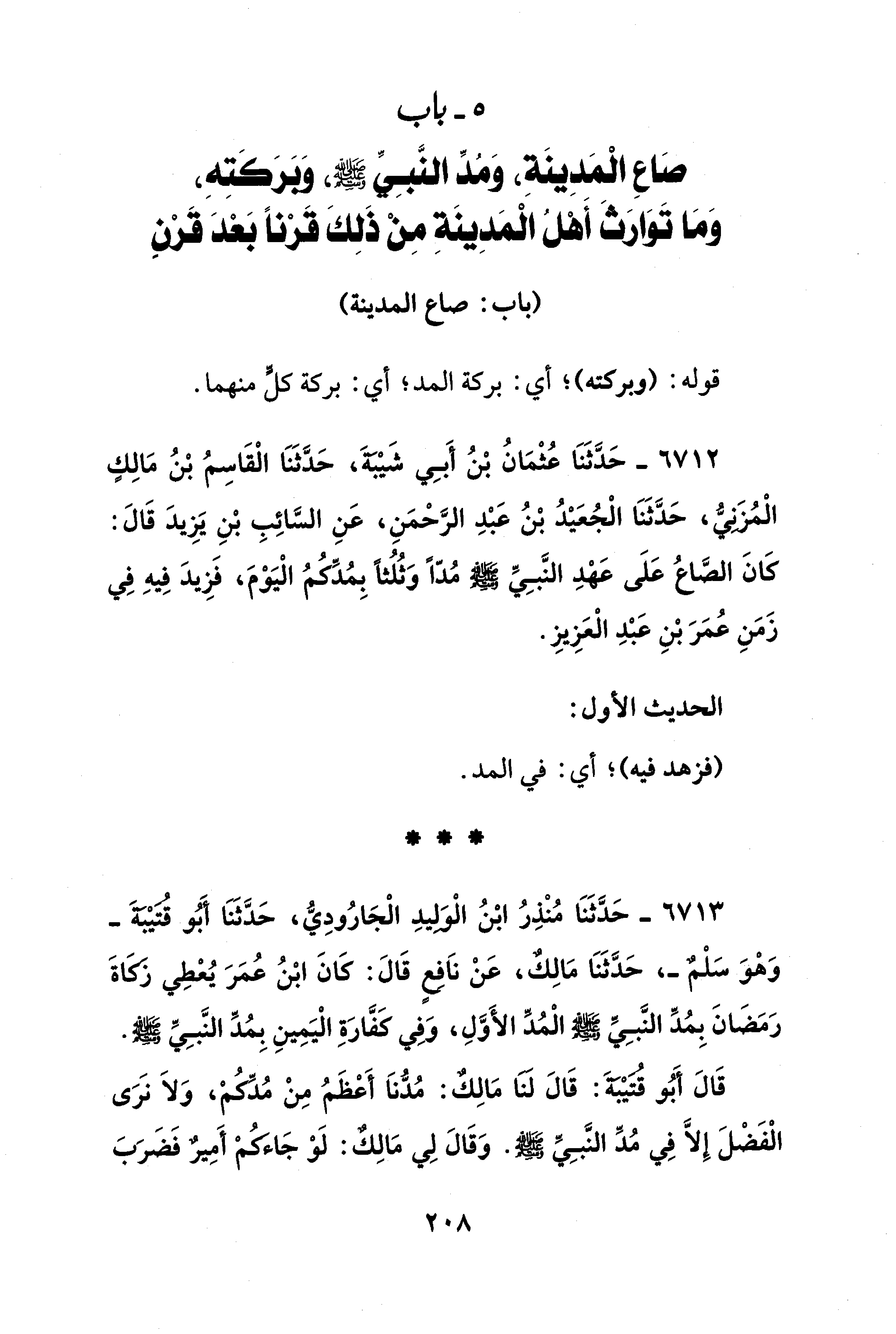 5 - باب صَاعِ الْمَدِينَةِ، وَمُدِّ النَّبِيِّ - صلى الله عليه وسلم -، وَبَرَكَتِهِ، وَمَا تَوَارَثَ أَهْلُ الْمَدِينَةِ مِنْ ذَلِكَ قَرْنًا بَعْدَ قَرْنٍ
