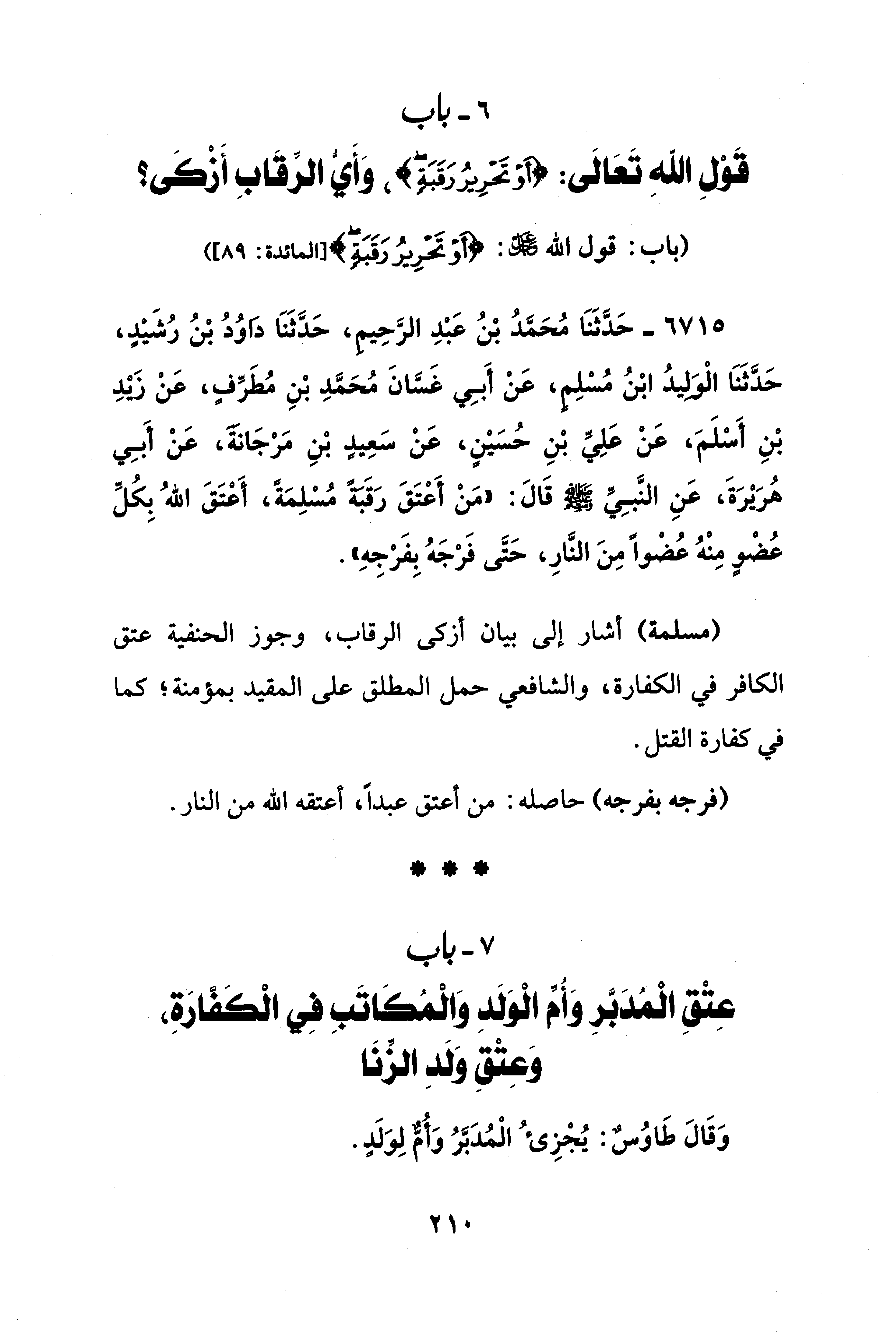 6 - باب قَوْلِ اللهِ تَعَالَى: {أَوْ تَحْرِيرُ رَقَبَةٍ}، وَأيُّ الرِّقَابِ أَزْكَى؟