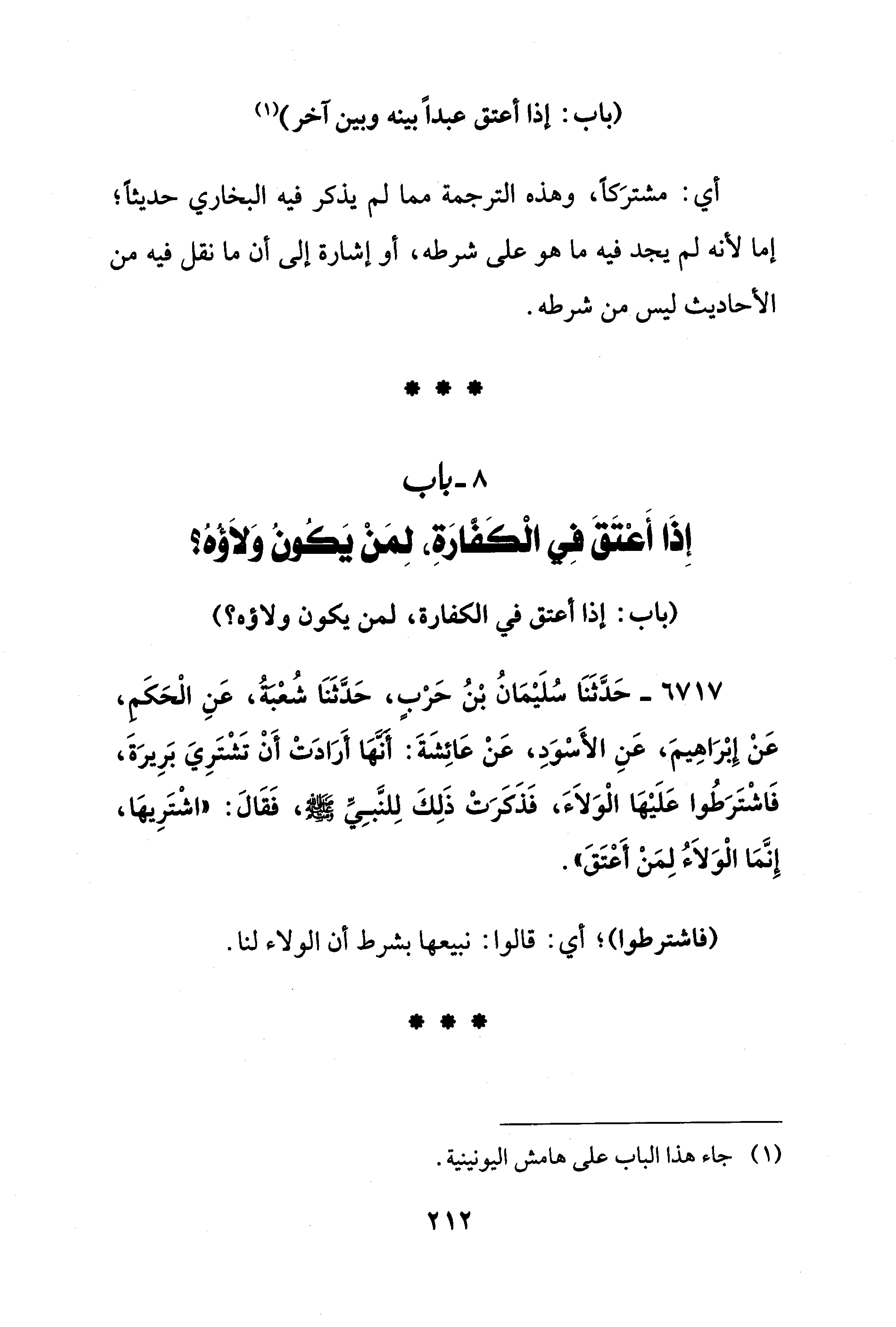 6717 - حَدَّثَنَا سُلَيْمَانُ بْنُ حَرْبٍ، حَدَّثَنَا شُعْبَةُ، عَنِ الْحَكَمِ، عَنْ إِبْرَاهِيمَ، عَنِ الأَسْوَدِ، عَنْ عَائِشَةَ: أَنَّهَا أَرَادَتْ أَنْ تَشْتَرِيَ بَرِيرَةَ، فَاشْتَرَطُوا عَلَيَهَا الْوَلَاءَ، فَذَكَرَتْ ذَلِكَ لِلنَّبِيِّ - صلى الله عليه وسلم -، فَقَالَ: "اشْتَرِيهَا، إِنَّمَا الْوَلَاءُ لِمَنْ أَعْتَقَ".