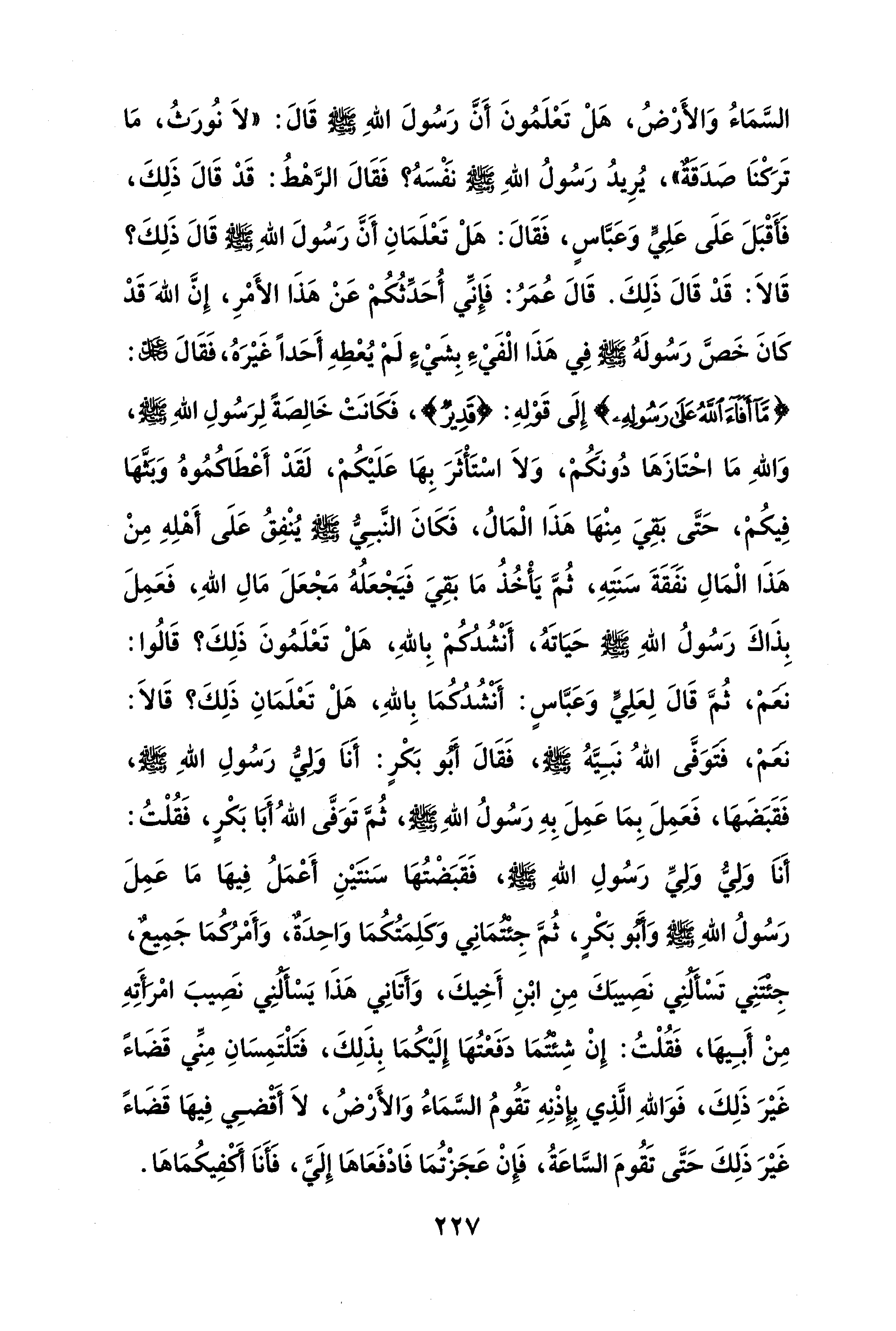 السَّمَاءُ وَالأَرْضُ، هَلْ تَعْلَمُونَ أَنَّ رَسُولَ اللهِ - صلى الله عليه وسلم - قَالَ: "لَا نُورَثُ، مَا تَرَكْنَا صَدَقَةٌ، يُرِيدُ رَسُولُ اللهِ - صلى الله عليه وسلم - نَفْسَهُ؟ فَقَالَ الرَّهْطُ: قَدْ قَالَ ذَلِكَ، فَأَقْبَلَ عَلَى عَلِيٍّ وَعَبَّاسٍ، فَقَالَ: هَلْ تَعْلَمَانِ أَنَّ رَسُولَ اللهِ - صلى الله عليه وسلم - قَالَ ذَلِكَ؟ قَالَا: قَدْ قَالَ ذَلِكَ. قَالَ عُمَرُ: فإنِّي أُحَدِّثُكُمْ عَنْ هَذَا الأَمْرِ، إِنَّ اللهَ قَدْ كَانَ خَصَّ رَسُولَهُ - صلى الله عليه وسلم - فِي هَذَا الْفَيْءِ بِشَيْءٍ لَمْ يُعْطِهِ أَحَدًا غَيْرَهُ، فَقَالَ -عَزَّ وَجَلَّ-: {مَا أَفَاءَ اللَّهُ عَلَى رَسُولِهِ} إِلَى قَوْلهِ: {قَدِيرٌ}، فَكَانَتْ خَالِصَةً لِرَسُولِ اللهِ - صلى الله عليه وسلم -، وَاللهِ مَا احْتَازَهَا دُونَكُمْ، وَلَا اسْتَأْثَرَ بِهَا عَلَيْكُمْ، لَقَدْ أَعْطَاكُمُوهُ وَبَثَّهَا فِيكُمْ، حَىَّ بَقِيَ مِنْهَا هَذَا الْمَالُ، فَكَانَ النَّبِيُّ - صلى الله عليه وسلم - يُنْفِقُ عَلَى أَهْلِهِ مِنْ هَذَا الْمَالِ نَفَقَةَ سَنَتِهِ، ثُمَّ يَأْخُذُ مَا بَقِيَ فَيَجْعَلُهُ مَجْعَلَ مَالِ اللهِ، فَعَمِلَ بِذَاكَ رَسُولُ اللهِ - صلى الله عليه وسلم - حَيَاتَهُ، أَنْشُدُكُم بِاللهِ، هَلْ تَعْلَمُونَ ذَلِكَ؟ قَالُوا: نَعَمْ، ثُمَّ قَالَ لِعَلِيٍّ وَعَبَّاسٍ: أَنْشُدُكُم بِاللهِ، هَلْ تَعْلَمُونَ ذَلِكَ؟ قَالَا: نعمْ، فَتَوَفَّى اللهُ نبَيَّهُ - صلى الله عليه وسلم -، فَقَالَ أَبُو بَكْرٍ: أَنَا وَلِيُّ رَسُولِ اللهِ - صلى الله عليه وسلم -، فَقَبَضَهَا، فَعَمِلَ بِمَا عَمِلَ بِهِ رَسُولُ اللهِ - صلى الله عليه وسلم -، ثُمَّ تَوَفَّى اللهُ أَبَا بَكْرٍ، فَقُلْتُ: أَنَا وَلِيُّ وَلِيِّ رَسُولِ اللهِ - صلى الله عليه وسلم -، فَقَبَضْتُهَا سَنتَيْنِ أَعْمَلُ فِيهَا مَا عَمِلَ رَسُولُ اللهِ - صلى الله عليه وسلم - وَأَبُو بَكْرٍ، ثُمَّ جِئتمَانِي وَكَلِمَتُكُمَا وَاحِدَةٌ، وَأَمْرُكُمَا جَمِيعٌ، جِئْتَنِي تَسْأَلُنِي نَصِيبَكَ مِنِ ابْنِ أَخِيكَ، وَأَتَانِي هَذَا يَسْأَلنِي نصَيبَ امْرَأَتِهِ مِنْ أَبِيهَا، فَقُلْتُ: إِنْ شِئْتُمَا دَفَعْتُهَا إِلَيْكُمَا بِذَلِكَ، فَتَلْتَمِسَانِ مِنِّي قَضَاءً غَيْرَ ذَلِكَ، فَوَاللهِ الَّذِي بِإِذْنِهِ تَقُومُ السَّمَاءُ وَالأَرْضُ، لَا أَقْضِي فِيهَا قَضَاءً غَيْرَ ذَلِكَ حَتَّى تَقُومَ السَّاعَةُ، فَإِنْ عَجَزْتُمَا فَادْفَعَاهَا إِلَيَّ، فَأَنَا أَكْفِيكُمَاهَا.
