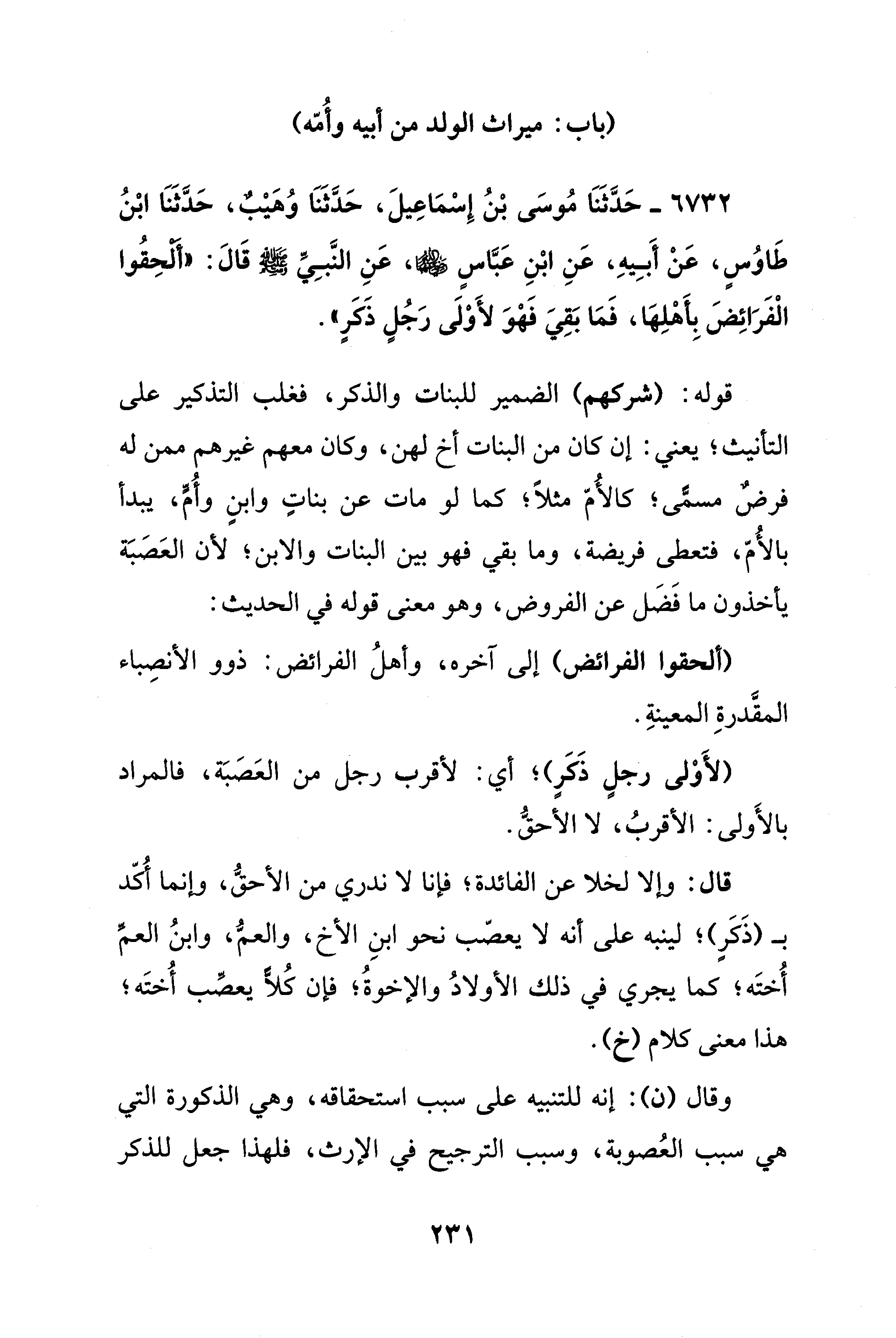 6732 - حَدَّثَنَا مُوسَى بْنُ إِسْمَاعِيلَ، حَدَّثَنَا وُهَيْبٌ، حَدَّثَنَا ابْنُ طَاوُسٍ، عَنْ أَبِيهِ، عَنِ ابنِ عَبَّاسٍ - رضي الله عنهما -، عَنِ النَّبِيِّ - صلى الله عليه وسلم - قَالَ: "أَلْحِقُوا الْفَرَائِضَ بِأَهْلِهَا، فَمَا بَقِيَ فَهْوَ لأَوْلَى رَجُلٍ ذَكَرٍ".