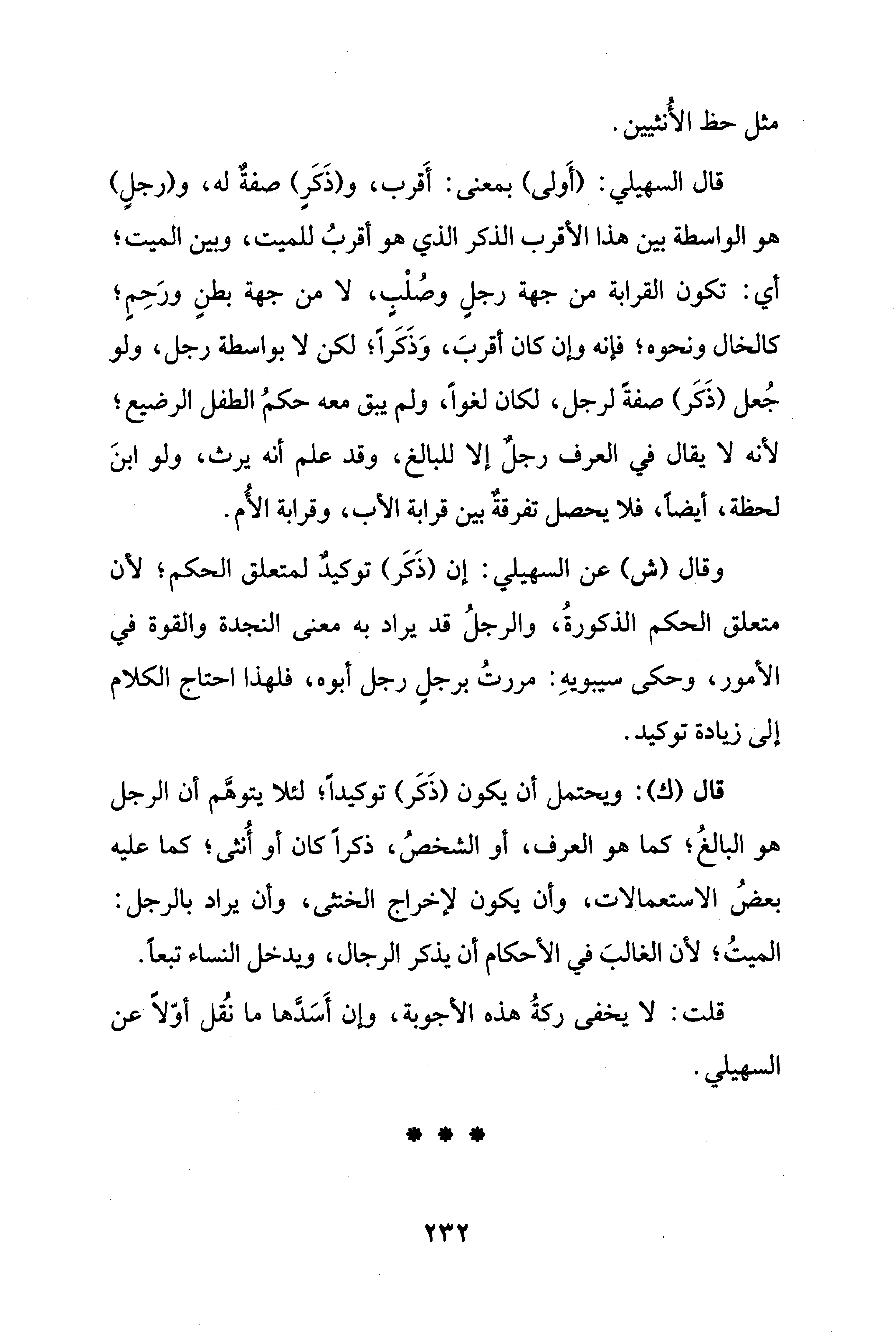 وقال (ش) عن السهيلي: إن (ذَكَر) توكيدٌ لمتعلّق الحكم؛ لأن متعلّق الحكم الذكورةُ، والرجلُ قد يراد به معنى النجدة والقوة في الأمور، وحكى سيبويهِ: مررتُ برجلٍ رجل أبوه، فلهذا احتاج الكلام إلى زيادة توكيد.