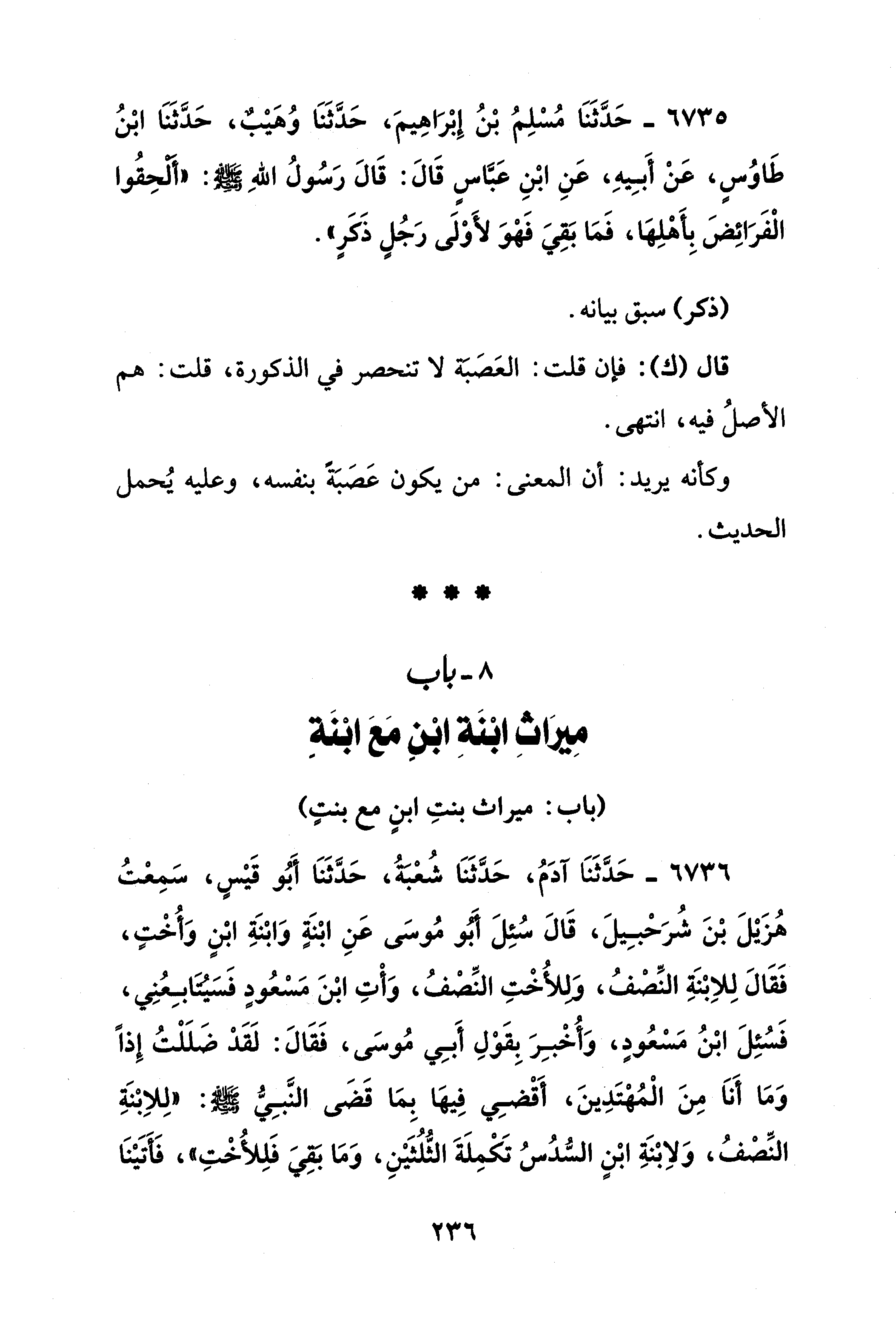 6735 - حَدَّثَنَا مُسْلِمُ بْنُ إِبْرَاهِيمَ، حَدَّثَنَا وُهَيْبٌ، حَدَّثَنَا ابْنُ طَاوُسٍ، عَنْ أَبِيهِ، عَنِ ابْنِ عَبَّاسٍ قَالَ: قَالَ رَسُولُ اللهِ - صلى الله عليه وسلم -: "ألْحِقُوا الْفَرَائِضَ بِأَهْلِهَا، فَمَا بَقِيَ فَهْوَ لأَوْلَى رَجُلٍ ذَكَرٍ".