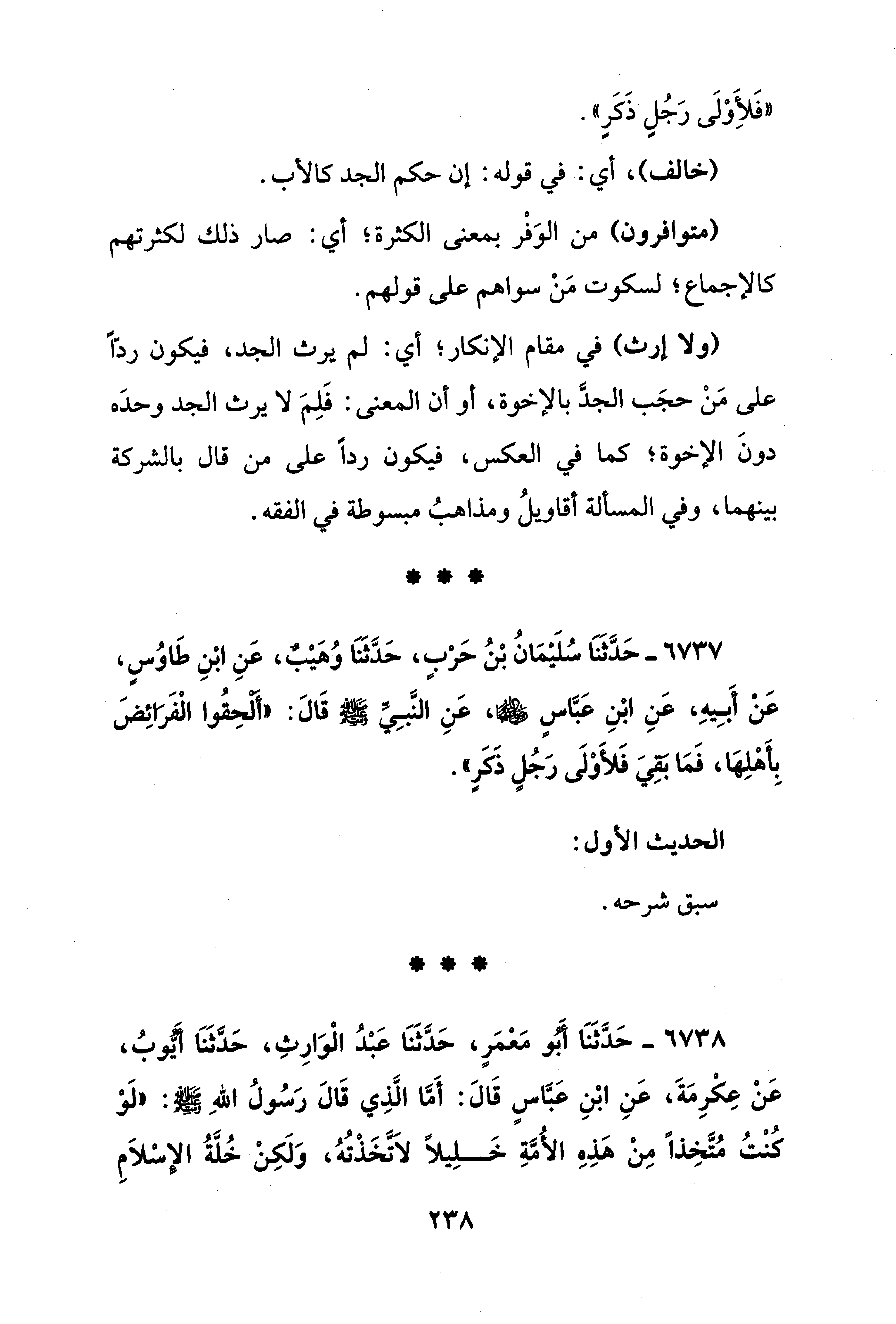6737 - حَدَّثَنَا سُلَيْمَانُ بْنُ حَرْبٍ، حَدَّثنا وُهَيْبٌ، عَنِ ابْنِ طَاوُسٍ، عَنْ أَبِيهِ، عَنِ ابْنِ عَبَّاسٍ - رضي الله عنهما -، عَنِ النَّبِيِّ - صلى الله عليه وسلم - قَالَ: "ألْحِقُوا الْفَرَائِضَ بِأَهْلِهَا، فَمَا بَقِيَ فَلأَوْلَى رَجُلٍ ذَكَرٍ".