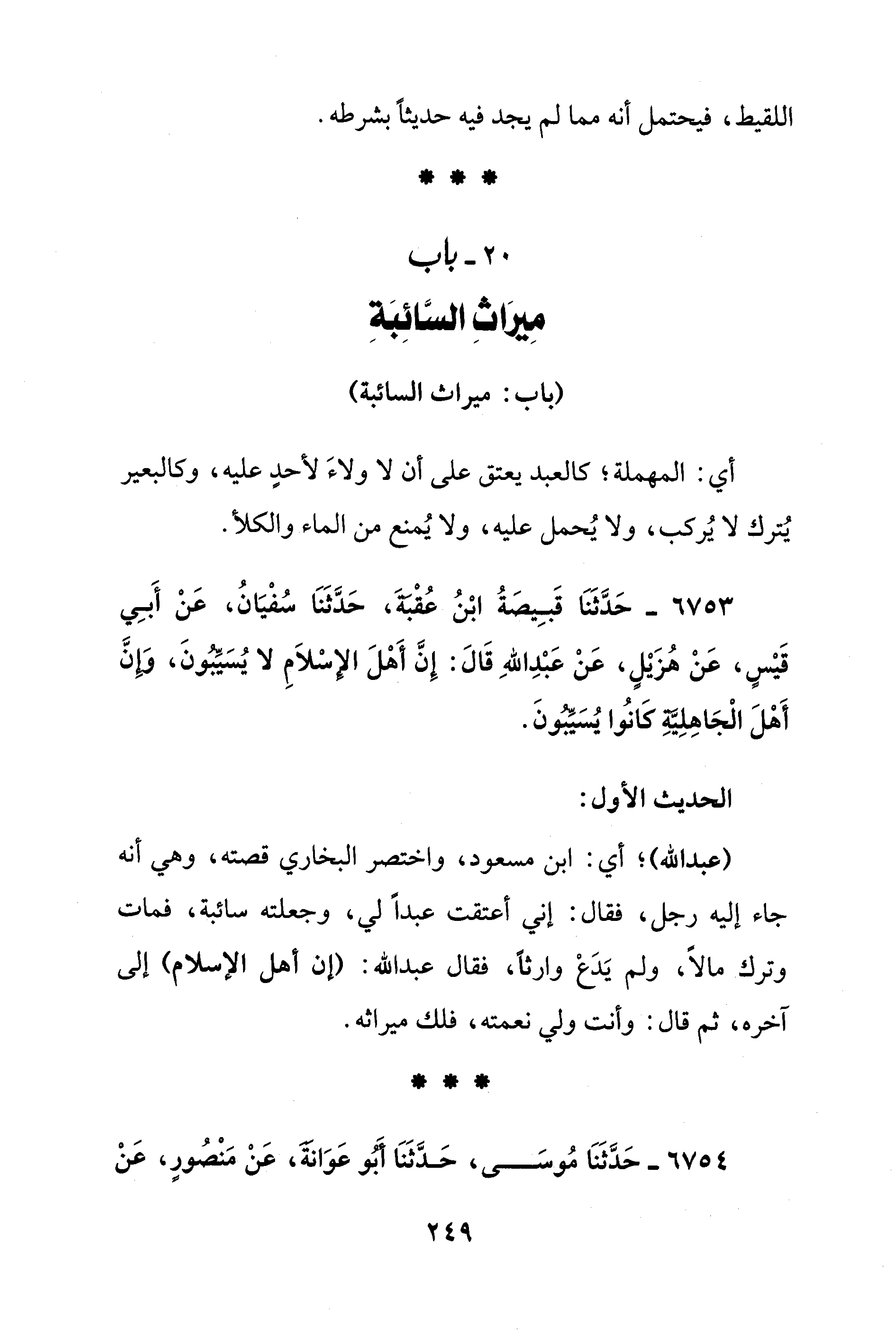 6753 - حَدَّثَنَا قَبِيصَةُ بْنُ عُقْبَةَ، حَدَّثَنَا سُفْيَانُ، عَنْ أَبِي قَيْسٍ، عَنْ هُزَيْلٍ، عَنْ عَبْدِ اللهِ قَالَ: إِنَّ أَهْلَ الإِسلَامِ لا يُسَيِّبُونَ، وَإِنَّ أَهْلَ الْجَاهِلِيَّةِ كَانُوا يُسَيِّبُونَ.