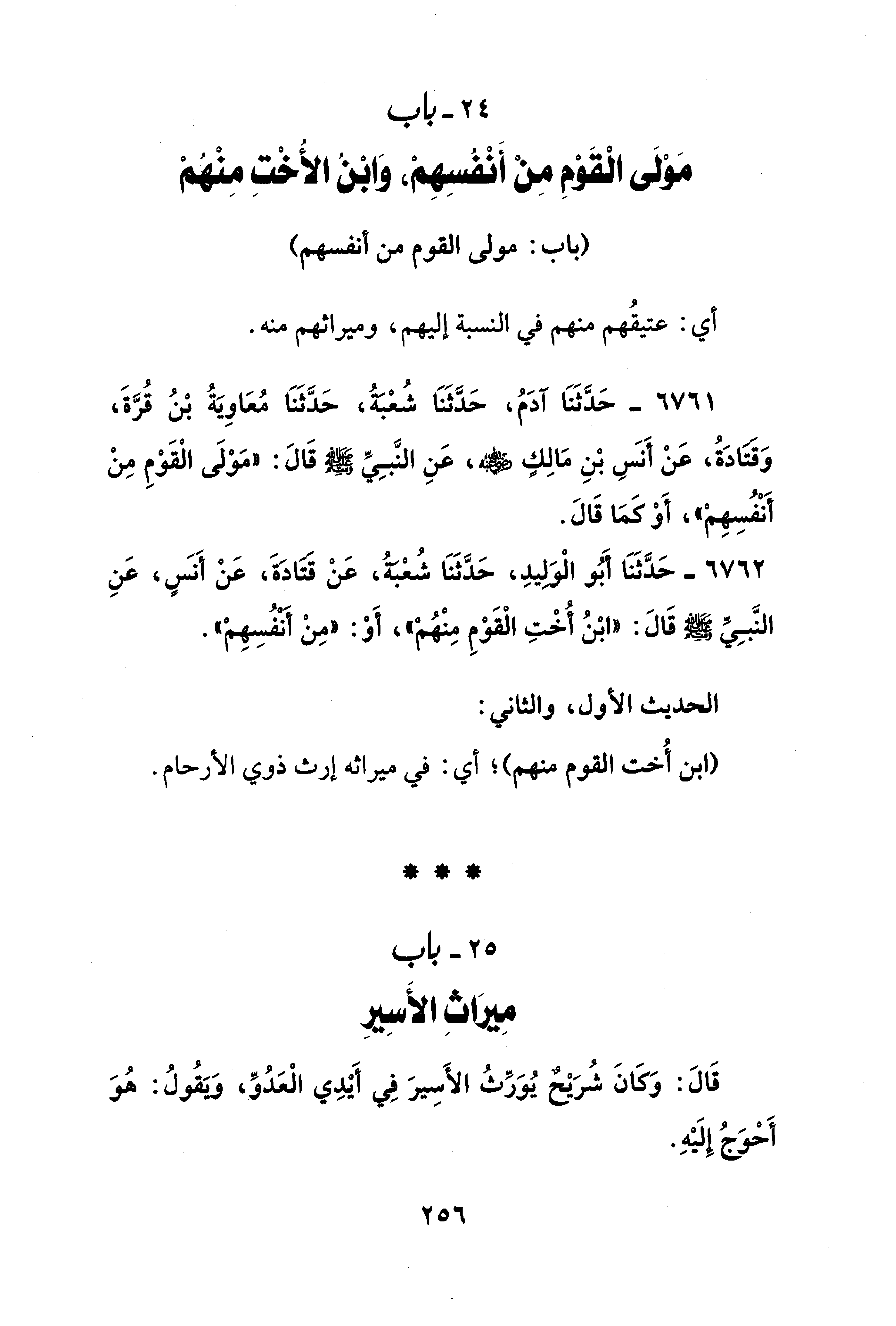 6761 - حَدَّثَنَا آدَمُ، حَدَّثَنَا شُعْبَةُ، حَدَّثَنَا مُعَاوِيَةُ بْنُ قُرَّةَ، وَقتادَةُ، عَنْ أَنسِ بْنِ مَالِكٍ - رضي الله عنه -، عَنِ النَّبِيِّ - صلى الله عليه وسلم - قَالَ: "مَوْلَى الْقَوْمِ مِنْ أَنْفُسِهِمْ"، أَوْ كَمَا قَالَ.