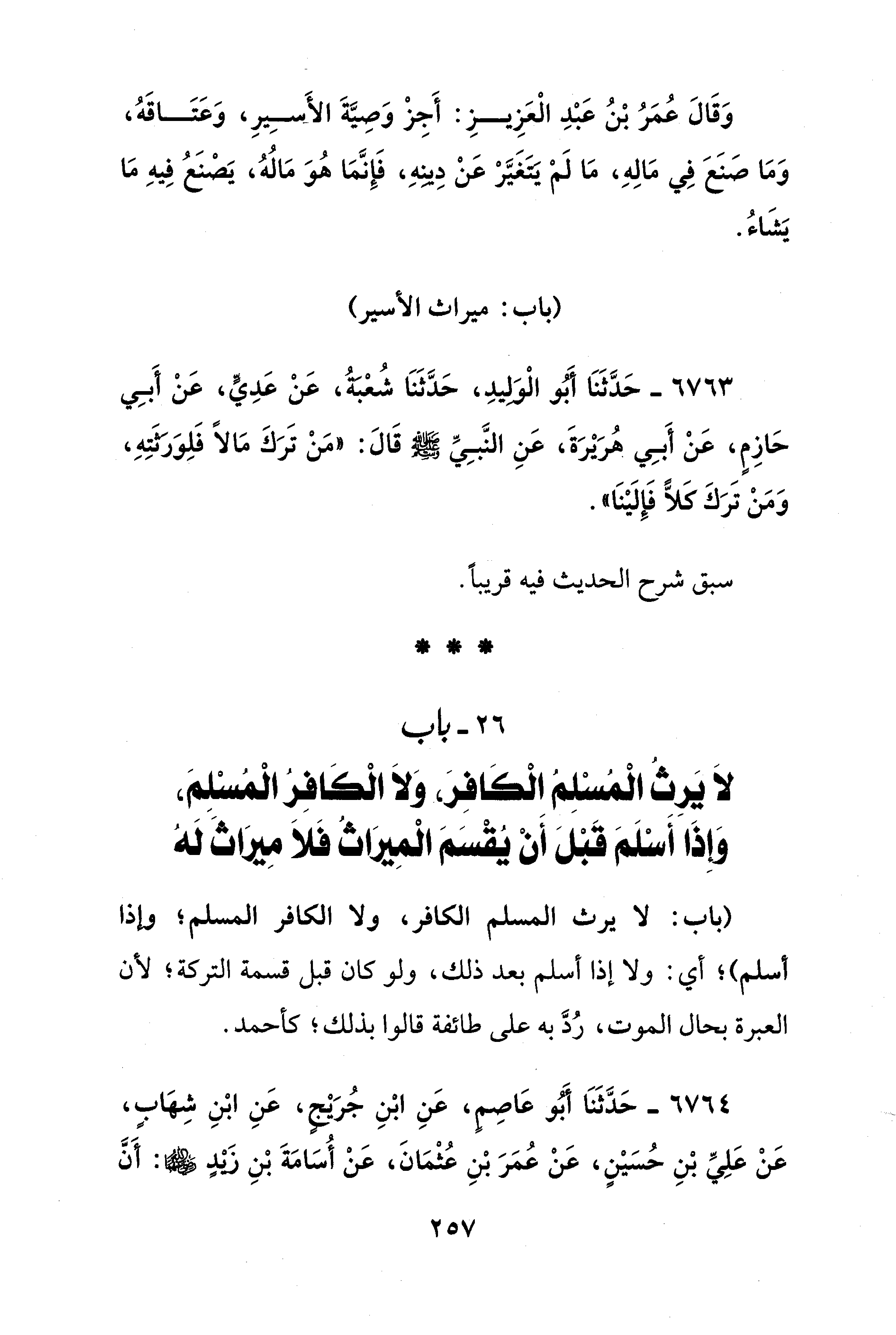 26 - باب لَا يَرِثُ الْمُسْلِمُ الْكَافِرَ، وَلَا الْكَافِرُ الْمُسْلِمَ، وَإِذَا أَسْلَمَ قَبْلَ أَنْ يُقْسَمَ الْمِيرَاثُ فَلَا مِيرَاثَ لَهُ
