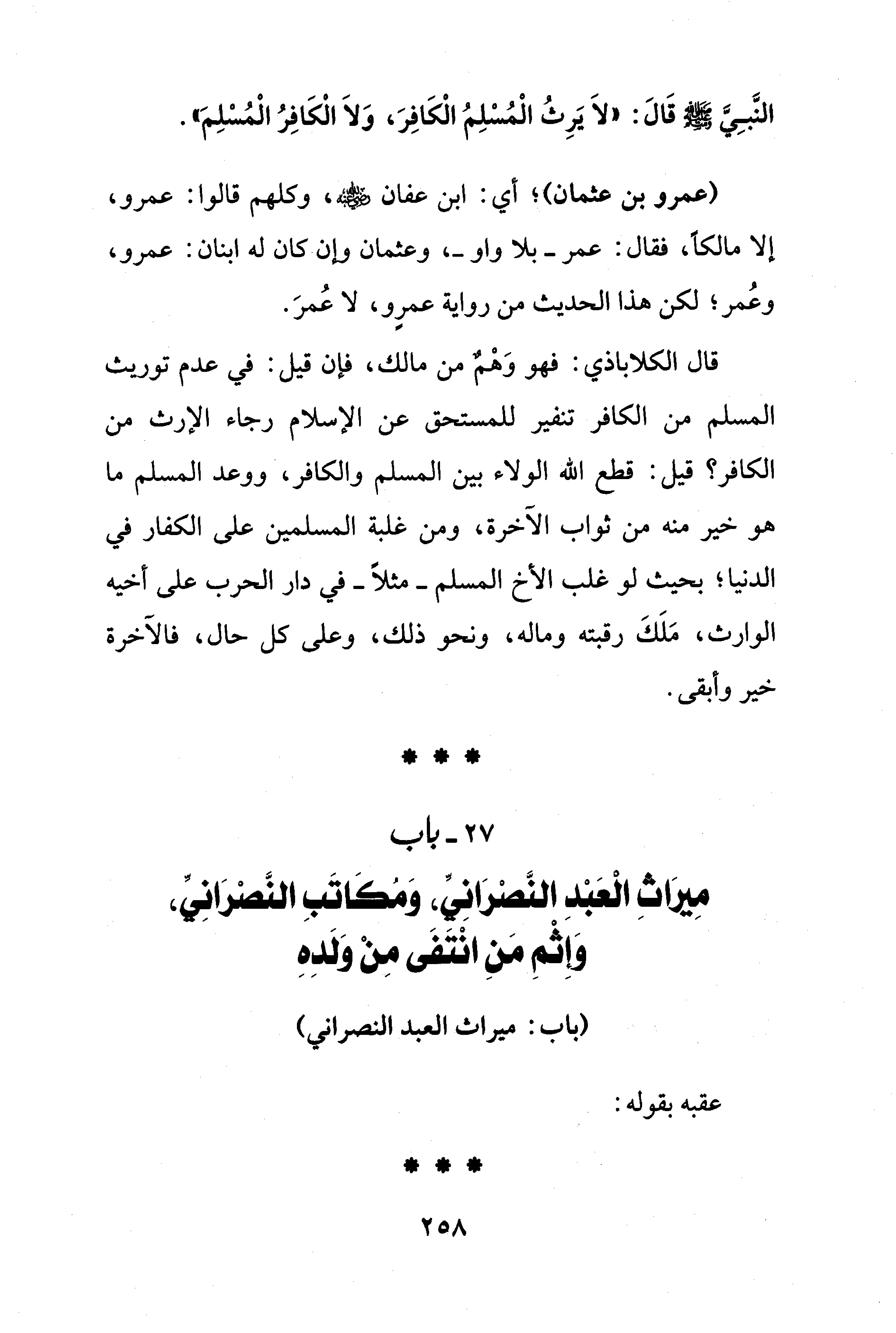 النَّبِيِّ - صلى الله عليه وسلم - قَالَ: "لَا يَرِثُ الْمُسْلِمُ الْكَافِرَ، وَلَا الْكَافِرُ الْمُسْلِمَ".