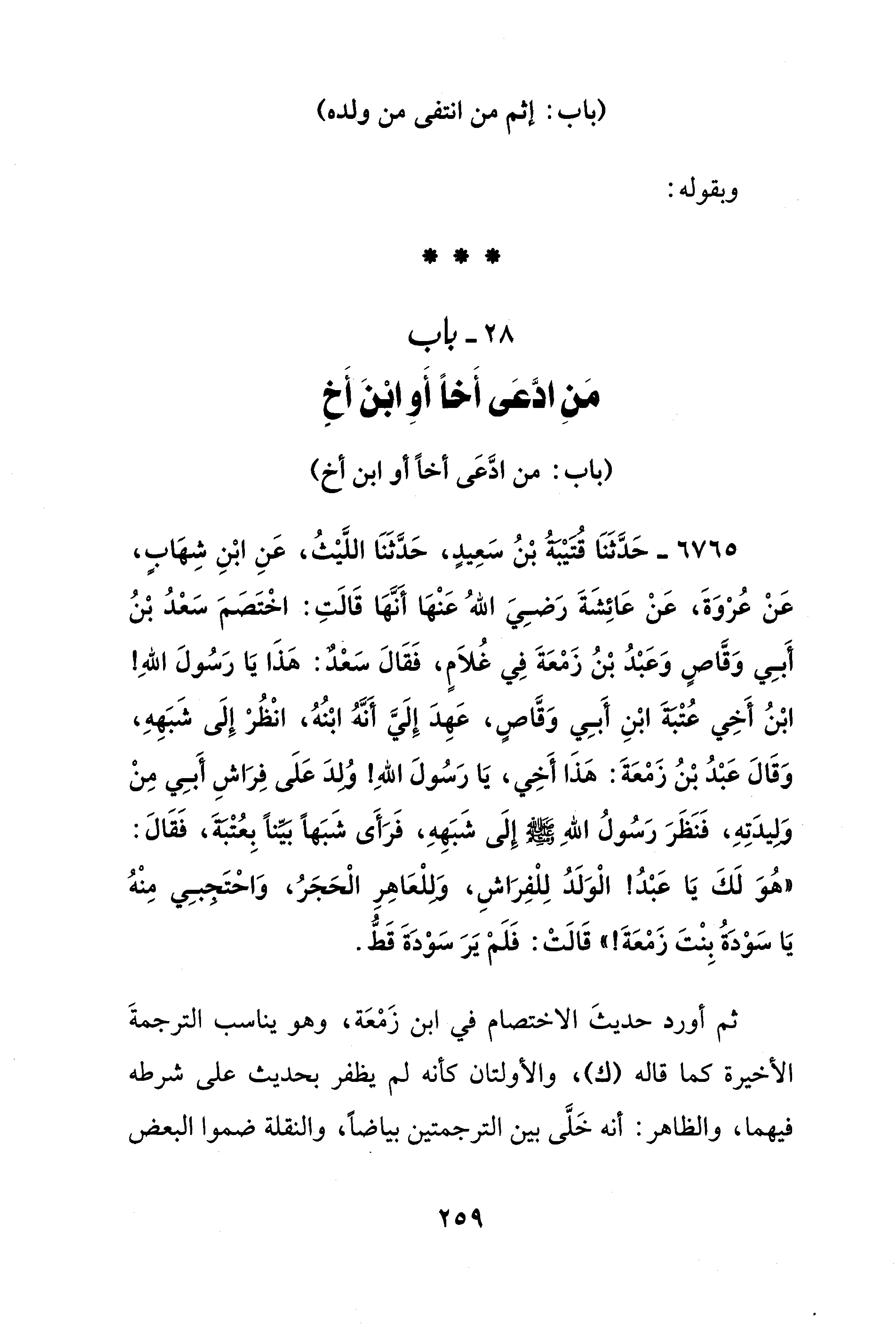 6765 - حَدَّثَنَا قتيْبَةَ بْنُ سَعِيدٍ، حَدَّثَنَا اللَّيْثُ، عَنِ ابْنِ شِهَابٍ، عَنْ عُرْوَةَ، عَنْ عَائِشَةَ رَضِيَ اللهُ عَنْهَا أنَّهَا قَالَتِ: اخْتَصَمَ سَعْدُ بْنُ أَبِي وَقَّاصٍ وَعَبْدُ بْنُ زَمْعَةَ فِي غُلَامٍ، فَقَالَ سَعْدٌ: هَذَا يَا رَسُولَ اللهِ! ابْنُ أَخِي عُتْبَةَ ابْنِ أَبِي وَقَّاصٍ، عَهِدَ إِلَيَّ أَنَّهُ ابْنُهُ، انْظُرْ إِلَى شَبَهِهِ، وَقَالَ عَبْدُ بْنُ زَمْعَةَ: هَذَا أَخِي، يَا رَسُولَ اللهِ! وُلِدَ عَلَى فِرَاشِ أَبِي مِنْ وَلِيدَتِهِ، فَنَظَرَ رَسُولُ اللهِ - صلى الله عليه وسلم - إِلَى شَبَهِهِ، فَرَأَى شَبَهًا بيِّنًا بِعُتْبَةَ، فَقَالَ: "هُوَ لَكَ يَا عَبْدُ! الْوَلَدُ لِلْفِرَاشِ، وَلِلْعَاهِرِ الْحَجَرُ، وَاحْتَجبِي مِنْهُ يَا سَوْدَةُ بِنْتَ زَمْعَةَ! " قَالَتْ: فَلَمْ يَرَ سَوْدَةَ قَطُّ.
