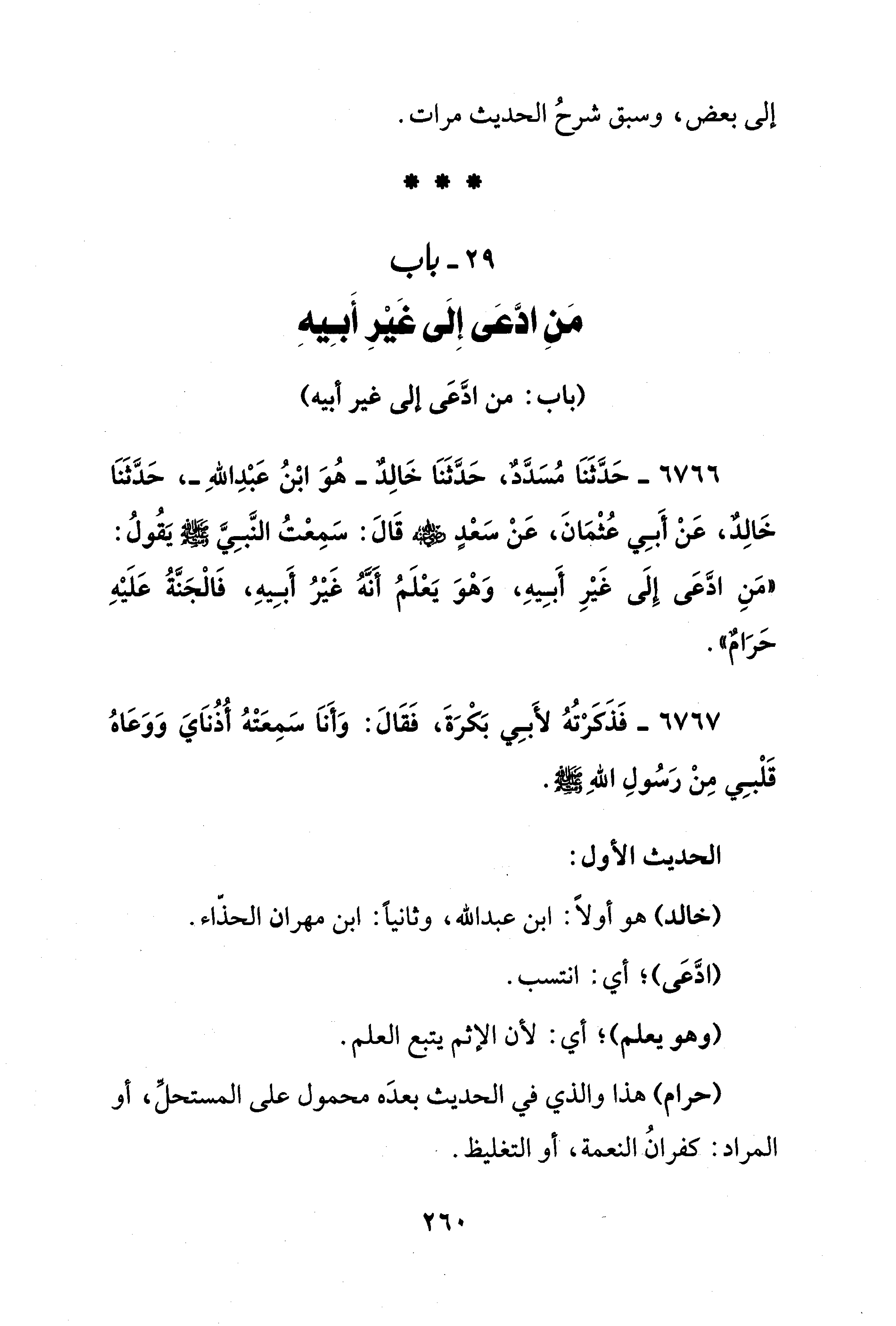 6766 - حَدَّثَنَا مُسَدَّدٌ، حَدَّثَنَا خَالِدٌ -هُوَ ابْنُ عَبْدِ اللهِ-، حَدَّثَنَا خَالِدٌ، عَنْ أَبِي عُثْمَانَ، عَنْ سَعْدٍ - رضي الله عنه - قَالَ: سَمِعْتُ النَّبِيَّ - صلى الله عليه وسلم - يَقُولُ: "مَنِ ادَّعَى إِلَى غَيْرِ أَبِيهِ، وَهْوَ يَعْلَمُ أنَّهُ غَيْرُ أَبِيهِ، فَالْجَنَّةُ عَلَيْهِ حَرَامٌ".