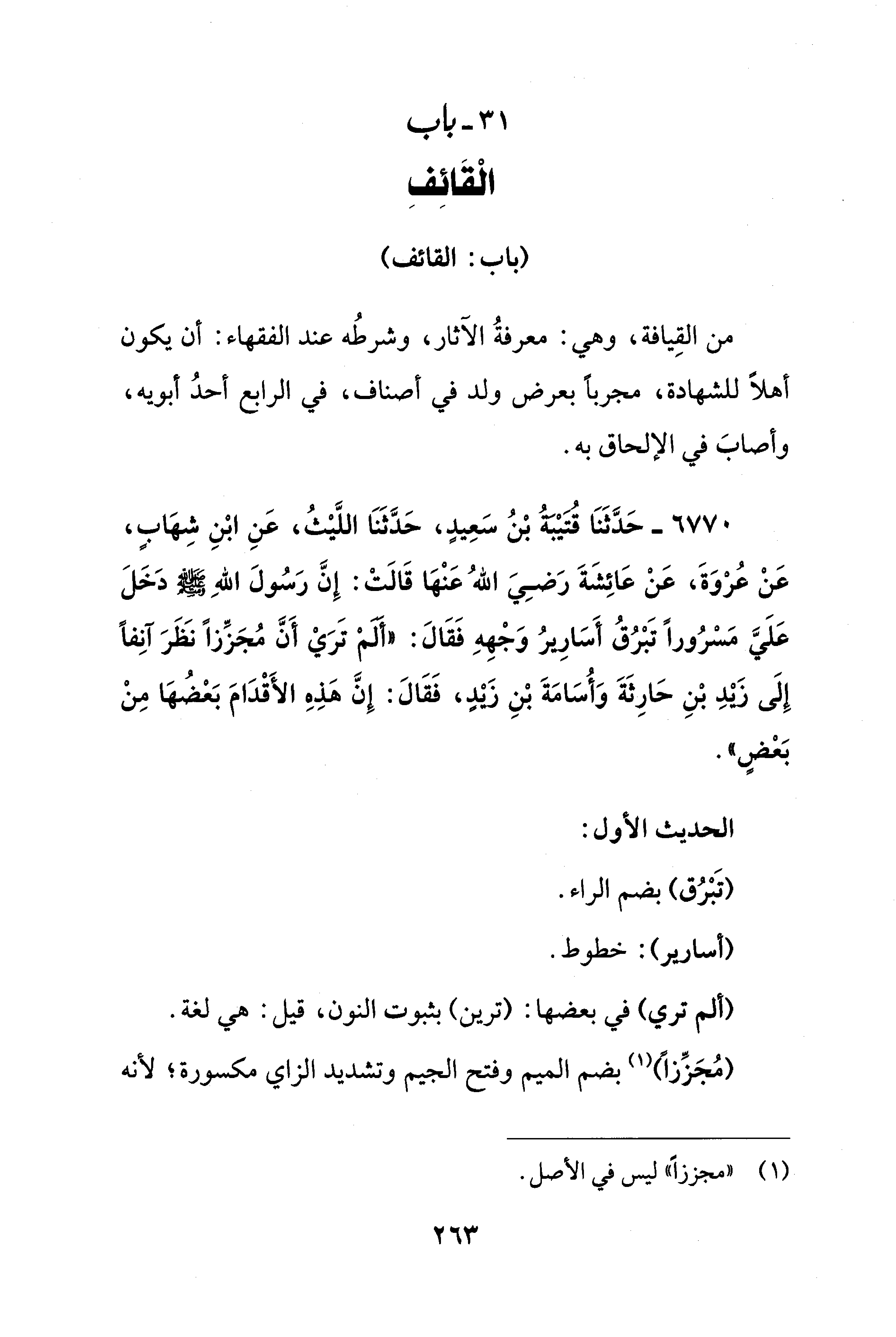 6770 - حَدَّثَنَا قُتَيْبَةُ بْنُ سَعِيدٍ، حَدَّثَنَا اللَّيْثُ، عَنِ ابْنِ شِهَابٍ، عَنْ عُرْوَةَ، عَنْ عَائِشَةَ رَضِيَ اللهُ عَنْهَا قَالَتْ: إِنَّ رَسُولَ اللهِ - صلى الله عليه وسلم - دَخَلَ عَلَيَّ مَسْرُورًا تَبْرُقُ أَسَارِيرُ وَجْهِهِ فَقَالَ: "أَلَمْ تَرَيْ أَنَّ مُجَزِّزًا نظًرَ آنِفًا إِلَى زيدِ بْنِ حَارِثَةَ وَأُسَامَةَ بْنِ زيدٍ، فَقَالَ: إِنَّ هَذِهِ الأَقْدَامَ بَعْضُهَا مِنْ بَعْض".