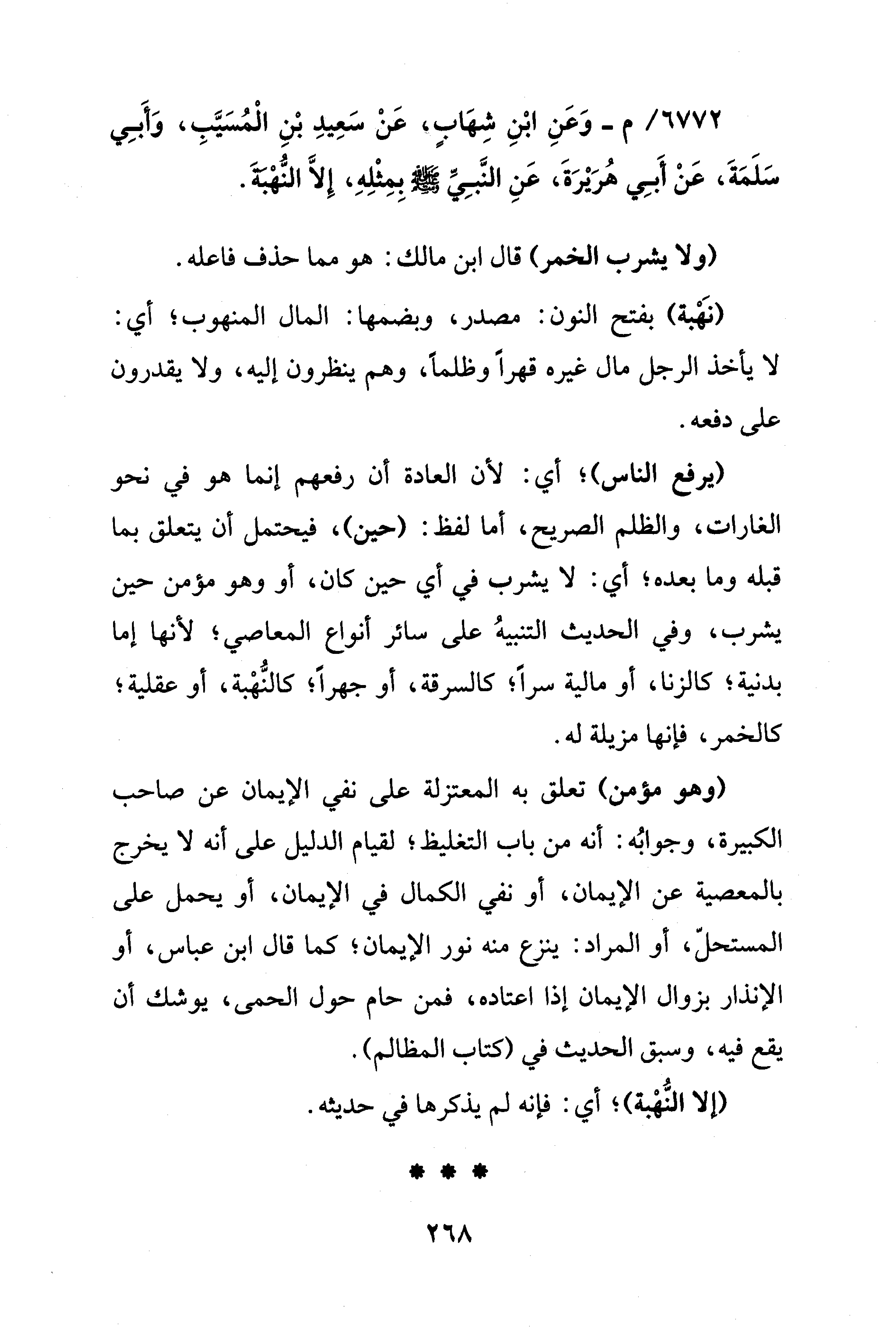 6772 / -م - وَعَنِ ابْنِ شِهَابٍ، عَنْ سَعِيدِ بْنِ الْمُسَيَّبِ، وَأَبِي سَلَمَةَ، عَنْ أَبِي هُرَيرَةَ، عَنِ النَّبِيِّ - صلى الله عليه وسلم - بِمِثْلِهِ، إلا النُّهْبَةَ.