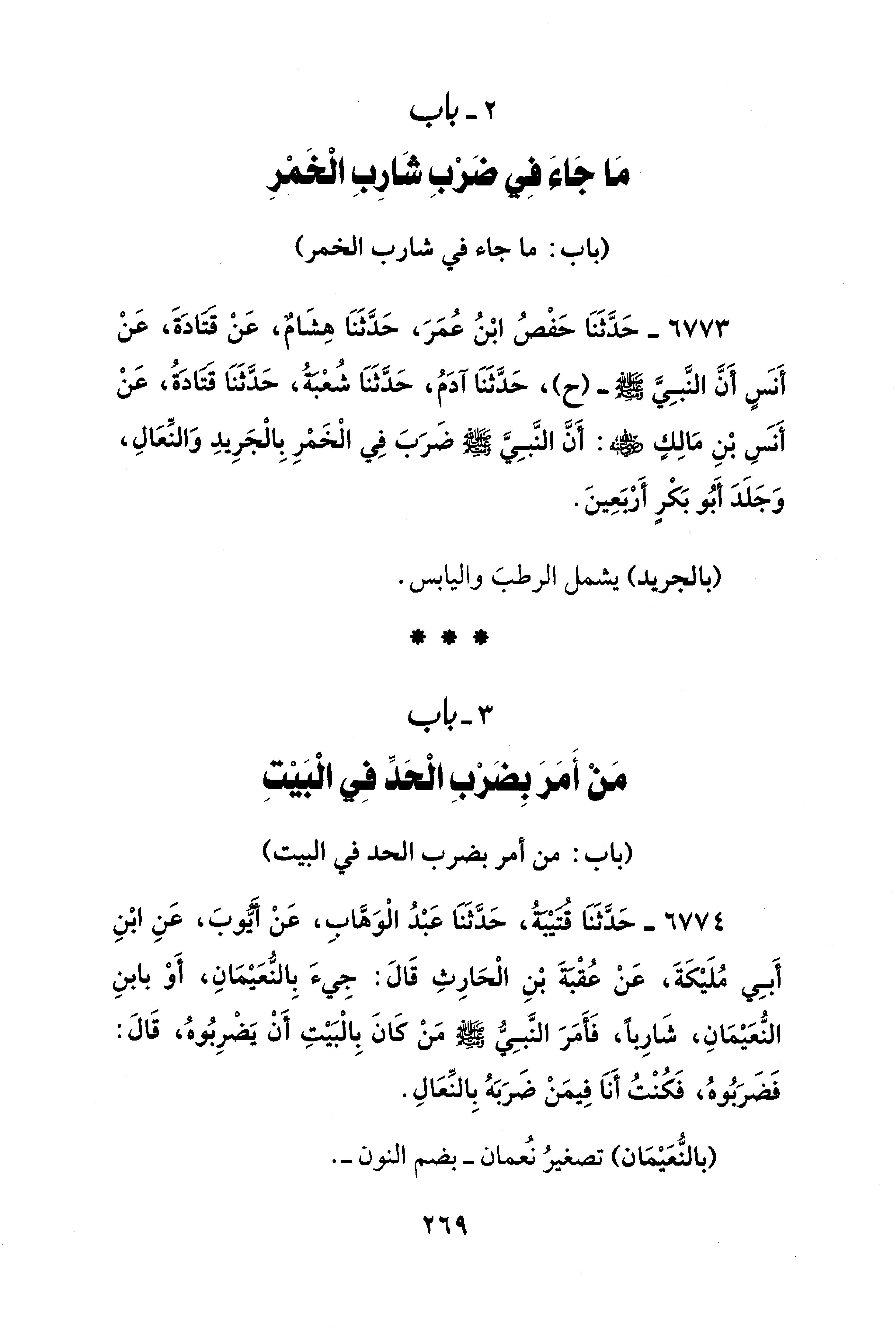 6774 - حَدَّثَنَا قُتَيْبَةُ، حَدَّثَنَا عَبْدُ الْوَهَّابِ، عَنْ أَيُّوبَ، عَنِ ابْنِ أَبِي مُلَيْكَةَ، عَنْ عُقْبَةَ بْنِ الْحَارِثِ قَالَ: جِيءَ بِالنُّعَيْمَانِ، أَوْ بابنِ النُّعَيْمَانِ، شَارِبًا، فَأَمَرَ النَّبِيُّ - صلى الله عليه وسلم - مَنْ كَانَ بِالْبَيتِ أَنْ يَضْرِبُوهُ، قَالَ: فَضَرَبُوهُ، فَكُنْتُ أَنَا فِيمَنْ ضَرَبَهُ بِالنِّعَالِ.
