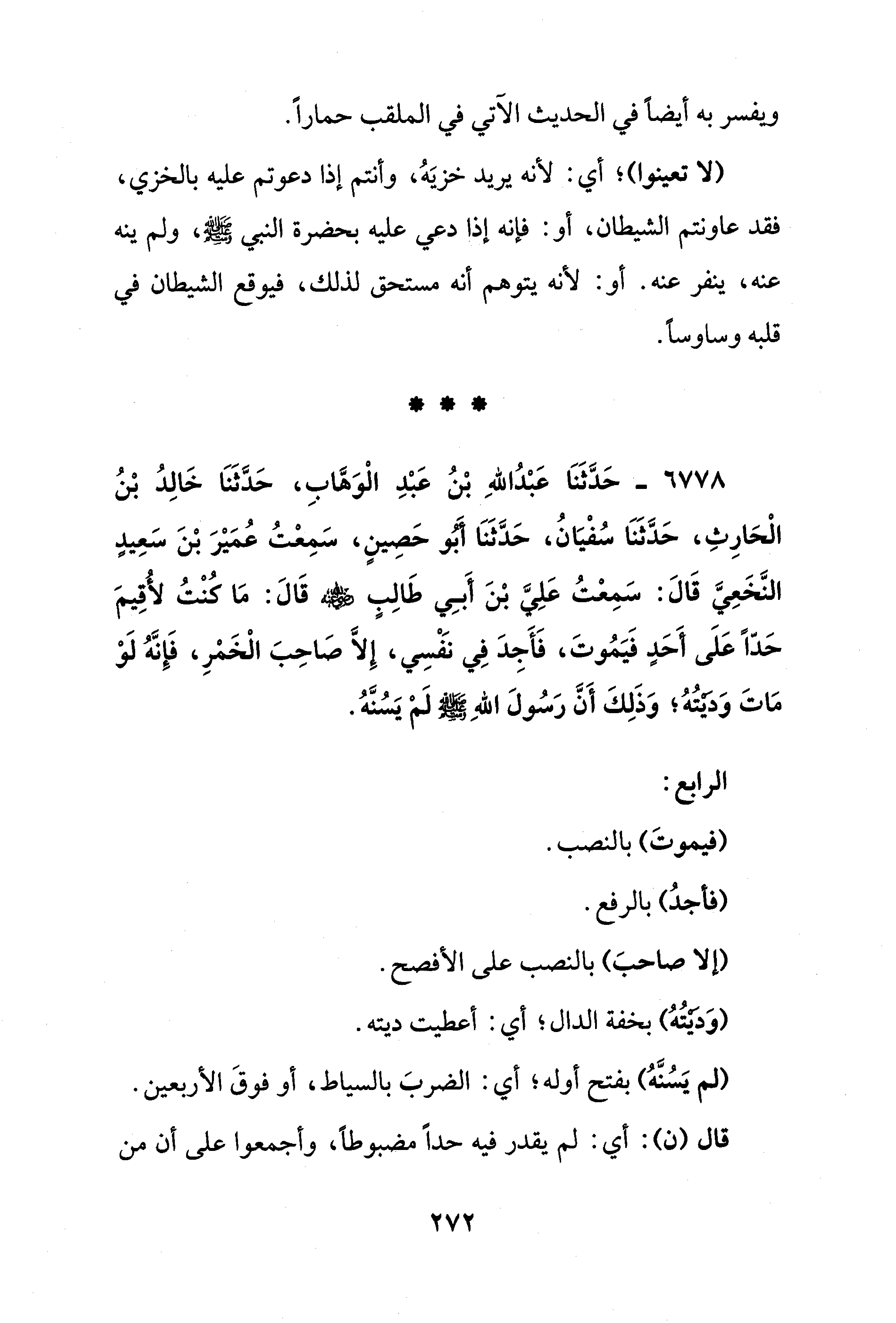 6778 - حَدَّثَنَا عَبْدُ اللهِ بْنُ عَبْدِ الْوَهَّابِ، حَدَّثَنَا خَالِدُ بْنُ الْحَارِثِ، حَدَّثَنَا سُفْيَانُ، حَدَّثَنَا أَبُو حَصِينٍ، سَمِعْتُ عُمَيْرَ بْنَ سَعِيدٍ النَّخَعِيَّ قَالَ: سَمِعْتُ عَلِيَّ بْنَ أَبِي طَالِبٍ - رضي الله عنه - قَالَ: مَا كُنْتُ لأُقِيمَ حَدًّا عَلَى أَحَدٍ فَيَمُوتَ، فَأَجِدَ فِي نفسِي، إلا صَاحِبَ الْخَمْرِ، فإنَّهُ لَوْ مَاتَ وَدَيْتُهُ؛ وَذَلِكَ أَنَّ رَسُولَ اللهِ - صلى الله عليه وسلم - لَمْ يَسُنَّهُ.