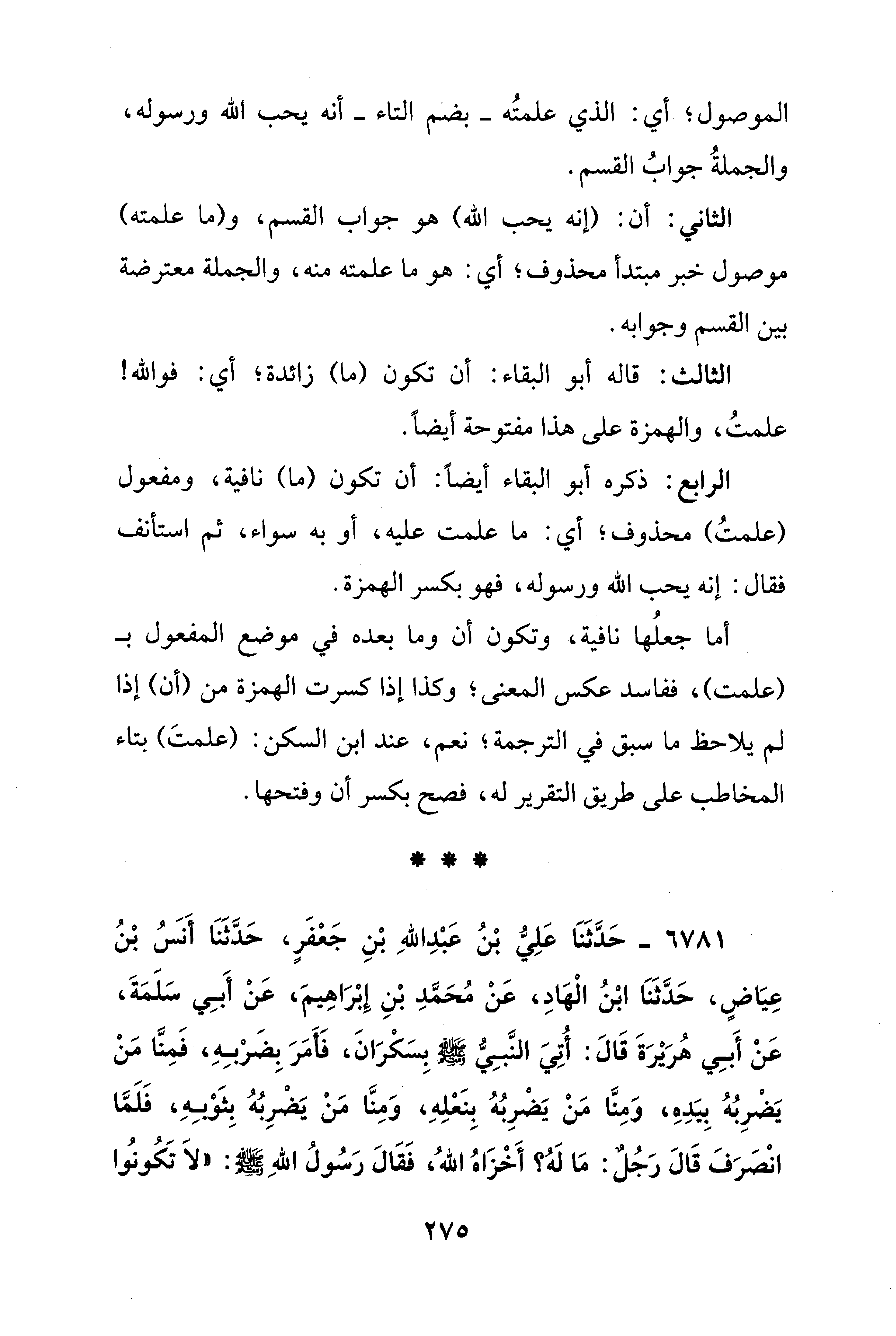 الرّابع: ذكره أبو البقاء أيضًا: أن تكون (ما) نافية، ومفعول (علمتُ) محذوف؛ أي: ما علمت عليه، أو به سواء، ثمّ استأنف فقال: إنّه يحب الله ورسوله، فهو بكسر الهمزة.