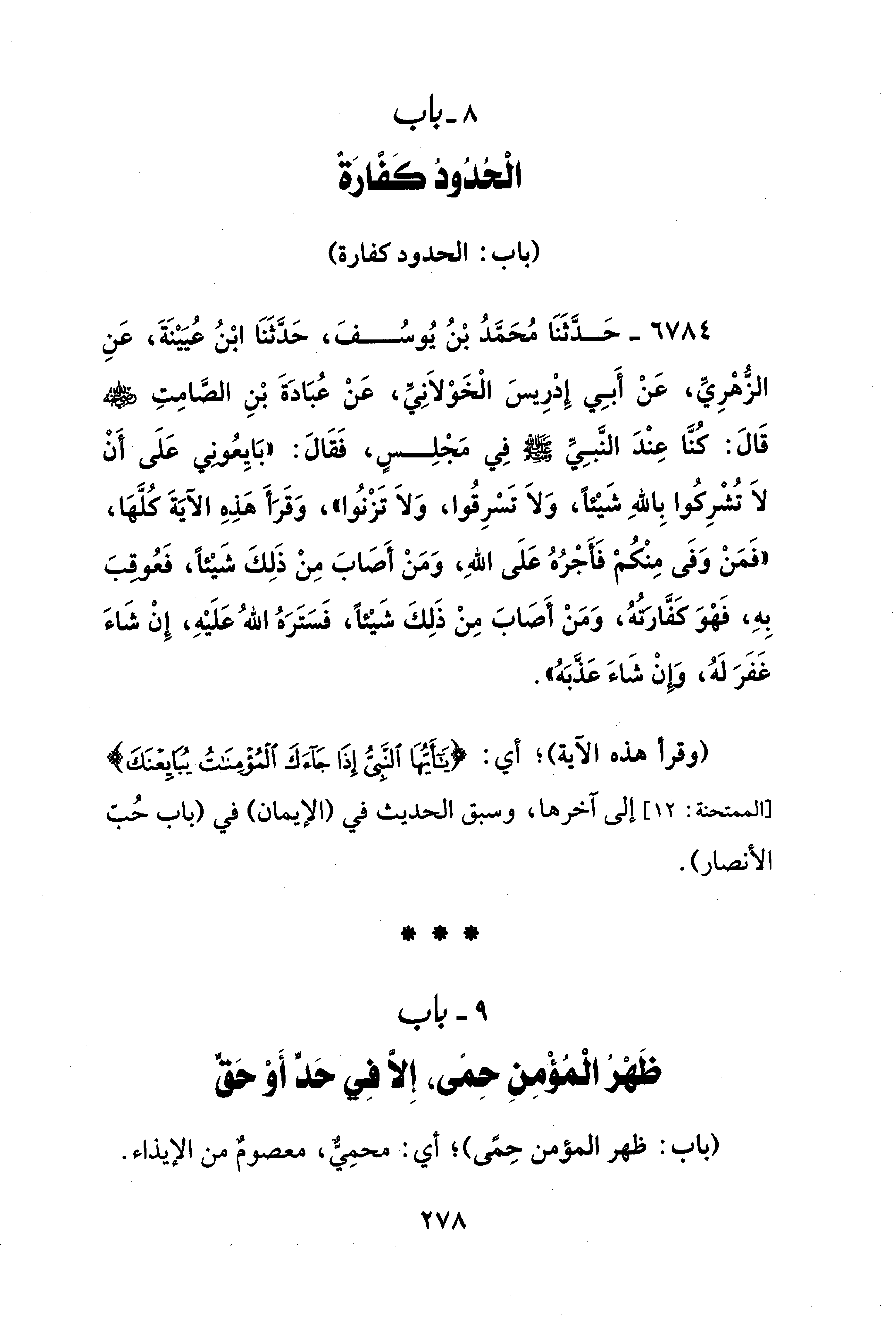 6784 - حَدَّثَنَا مُحَمَّدُ بْنُ يُوسُفَ، حَدَّثَنَا ابْنُ عُيَيْنَةَ، عَنِ الزُّهْرِيِّ، عَنْ أَبِي إِدْرِيسَ الْخَوْلَانِيِّ، عَنْ عُبَادَةَ بْنِ الصَّامِتِ - رضي الله عنه - قَالَ: كنَّا عِنْدَ النَّبِيِّ - صلى الله عليه وسلم - فِي مَجْلِسٍ، فَقَالَ: "بَايِعُوني عَلَى أَنْ لَا تُشْرِكُوا بِاللهِ شَيْئًا، وَلَا تَسْرِقُوا، وَلَا تَزْنُوا"، وَقَرَأَ هَذِهِ الآيَةَ كُلَّهَا، "فَمَنْ وَفَى مِنْكُمْ فَأَجْرُهُ عَلَى اللهِ، وَمَنْ أَصَابَ مِنْ ذَلِكَ شَيْئًا، فَعُوقبَ بِهِ، فَهْوَ كَفَّارَتُهُ، وَمَنْ أَصَابَ مِنْ ذَلِكَ شَيْئًا، فَسَتَرَهُ اللهُ عَلَيْهِ، إِنْ شَاءَ غَفَرَ لَهُ، وَإِنْ شَاءَ عَذَّبَهُ".