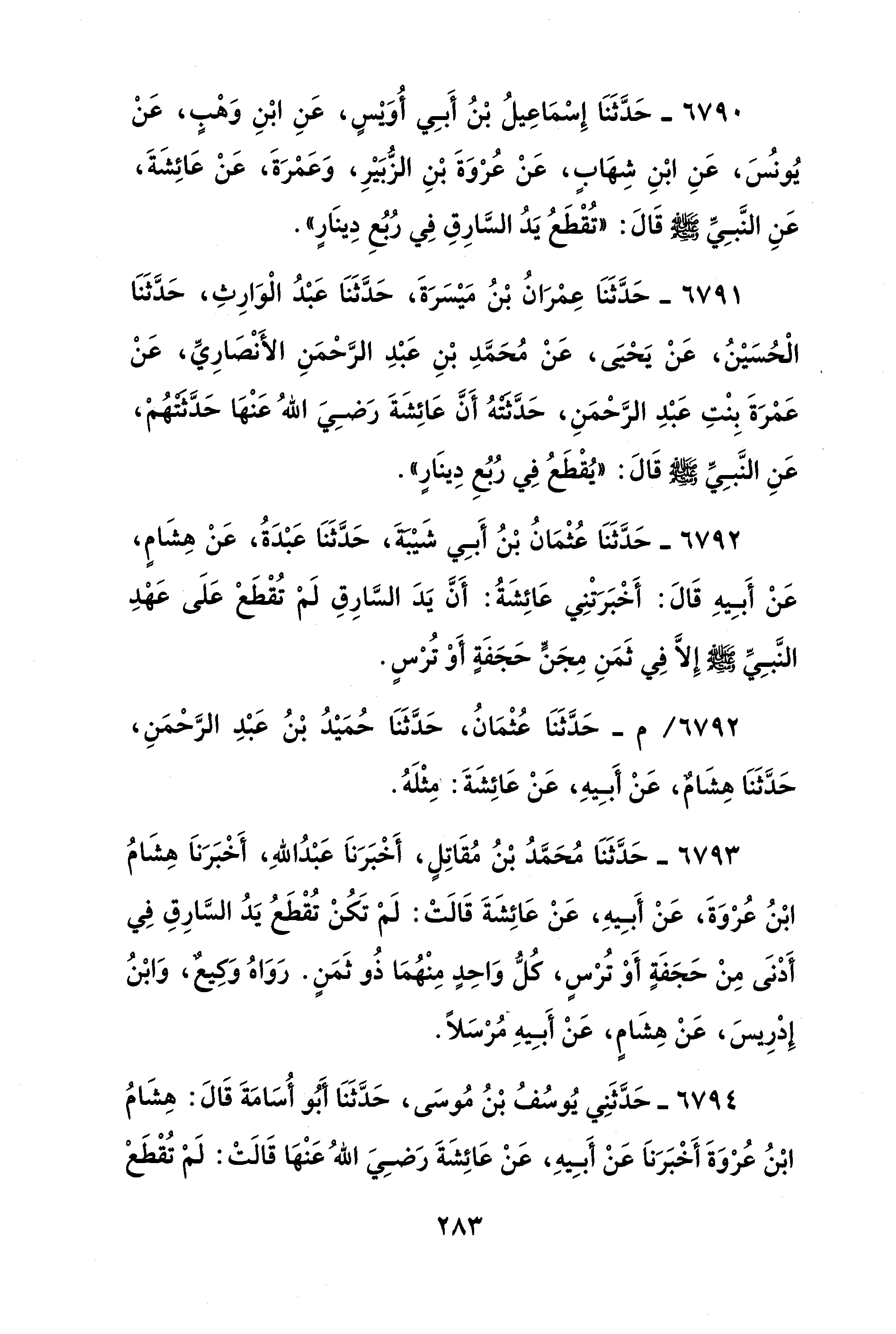 6791 - حَدَّثَنَا عِمْرَانُ بْنُ مَيْسَرَةَ، حَدَّثَنَا عَبْدُ الْوَارِثِ، حَدَّثَنَا الْحُسَيْنُ، عَنْ يَحْيَى، عَنْ مُحَمَّدِ بْنِ عَبْدِ الرَّحْمَنِ الأَنْصَارِيِّ، عَنْ عَمْرَةَ بِنْتِ عَبْدِ الرَّحْمَنِ، حَدَّثَتْهُ أَنَّ عَائِشَةَ رَضِيَ اللهُ عَنْهَا حَدَّثتهُمْ، عَنِ النَّبِيِّ - صلى الله عليه وسلم - قَالَ: "يُقْطَعُ فِي رُبُعِ دِينَارٍ".
