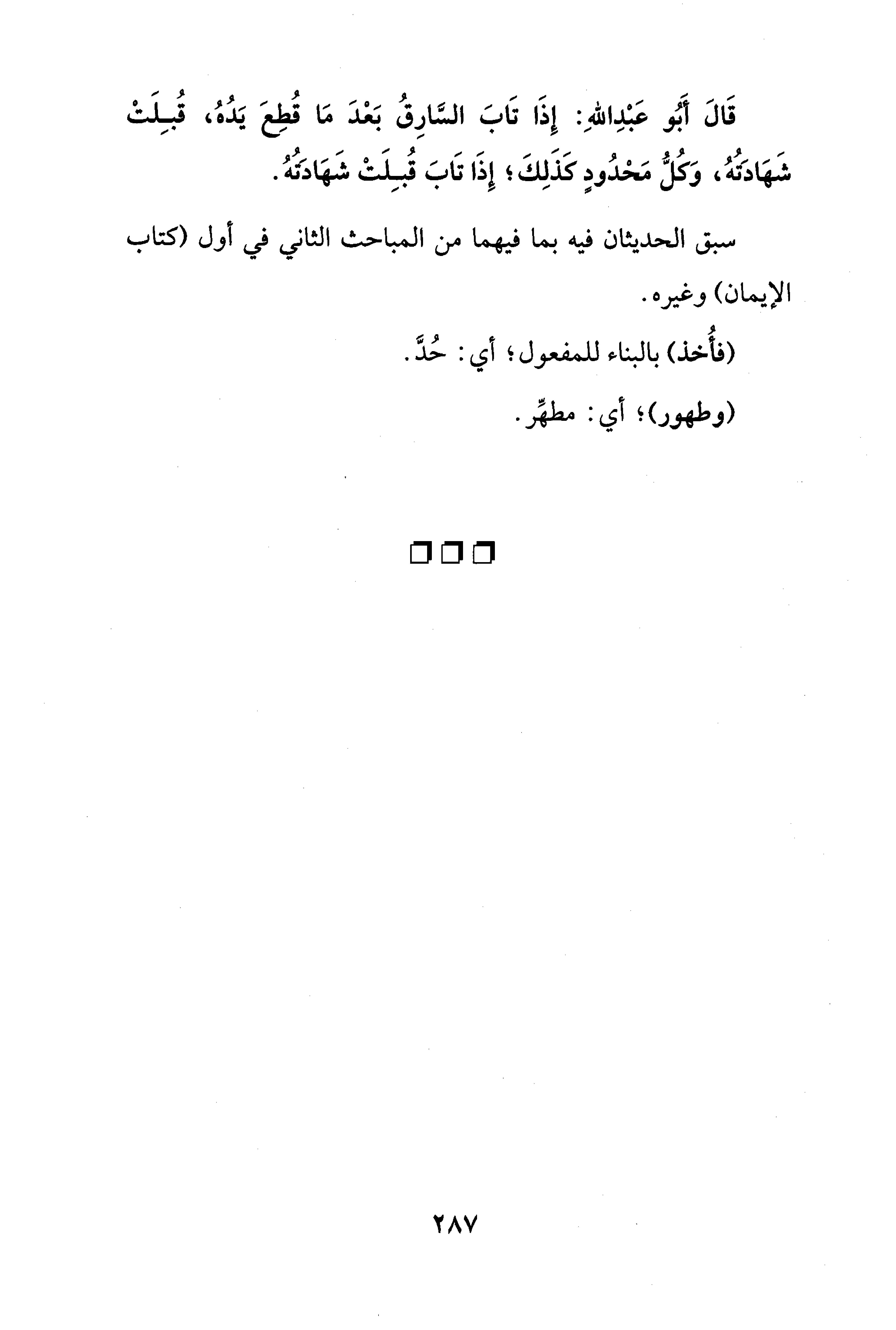 قَالَ أَبُو عَبْدِ اللهِ: إِذَا تَابَ السَّارِقُ بَعْدَ مَا قُطِعَ يَدُهُ، قُبِلَتْ شَهَادَتُهُ، وَكُلُّ مَحْدُودٍ كَذَلِكَ؛ إِذَا تَابَ قُبِلَتْ شَهَادَتُهُ.