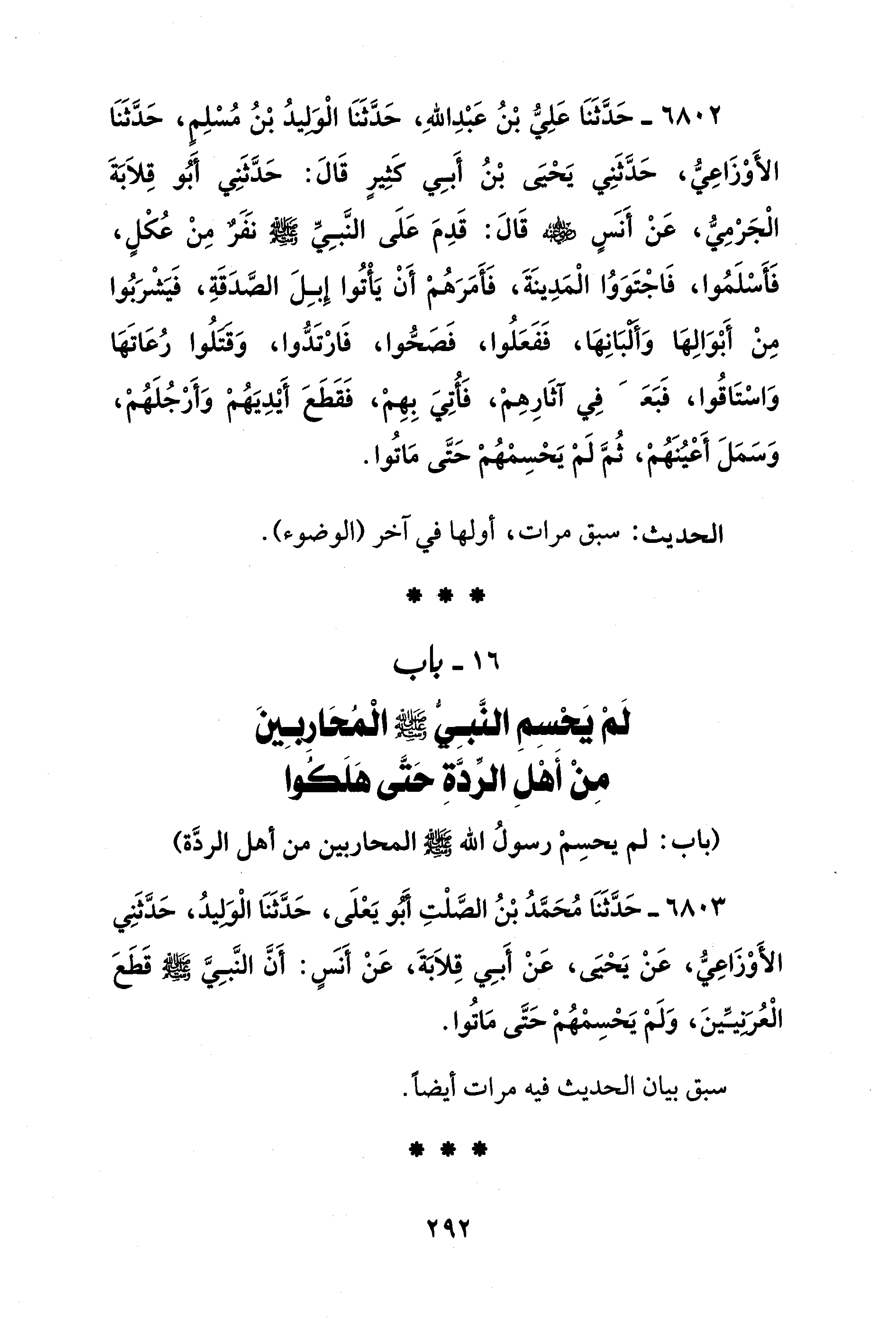 6803 - حَدَّثَنَا مُحَمَّدُ بْنُ الصَّلْتِ أَبُو يَعْلَى، حَدَّثَنَا الْوَلِيدُ، حَدَّثَنِي الأَوْزَاعِيُّ، عَنْ يَحْيَى، عَنْ أَبِي قِلاَبَةَ، عَنْ أَنَسٍ: أَنَّ النَّبِيَّ - صلى الله عليه وسلم - قَطَعَ الْعُرَنِيِّينَ، وَلَمْ يَحْسِمْهُمْ حَتَّى مَاتُوا.