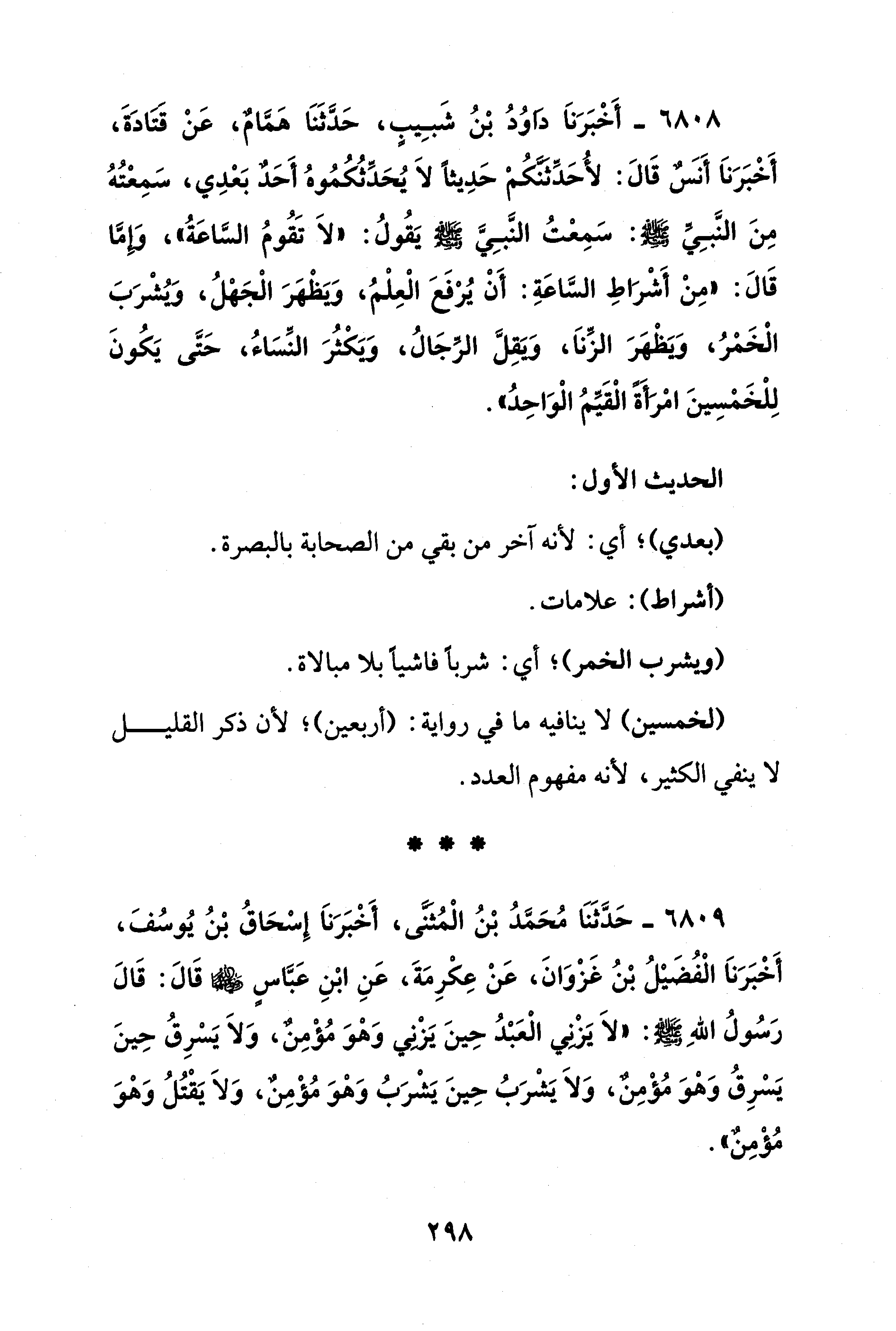 6808 - أَخْبَرَنَا دَاوُدُ بْنُ شَبِيبٍ، حَدَّثَنَا هَمَامٌ، عَنْ قَتَادَةَ، أَخْبَرَنَا أَنَسٌ قَالَ: لأُحَدِّثَنَّكُمْ حَدِيثًا لَا يُحَدِّثُكُمُوهُ أَحَدٌ بَعْدِي، سَمِعْتُهُ مِنَ النَّبِيِّ - صلى الله عليه وسلم -: سَمِعْتُ النَّبِيَّ - صلى الله عليه وسلم - يَقُولُ: "لَا تَقُومُ السَّاعَةُ"، وَإِمَّا قَالَ: "مِنْ أَشْرَاطِ السَّاعَةِ: أَنْ يُرْفَعَ الْعِلْمُ، وَيَظْهَرَ الْجَهْلُ، وَيُشْرَبَ الْخَمْرُ، وَيَظْهَرَ الزِّنَا، وَيَقِلَّ الرِّجَالُ، وَيَكْثُرَ النِّسَاءُ، حَتَّى يَكُونَ لِلْخَمْسِينَ امْرَأَةً الْقَيِّمُ الْوَاحِدُ".