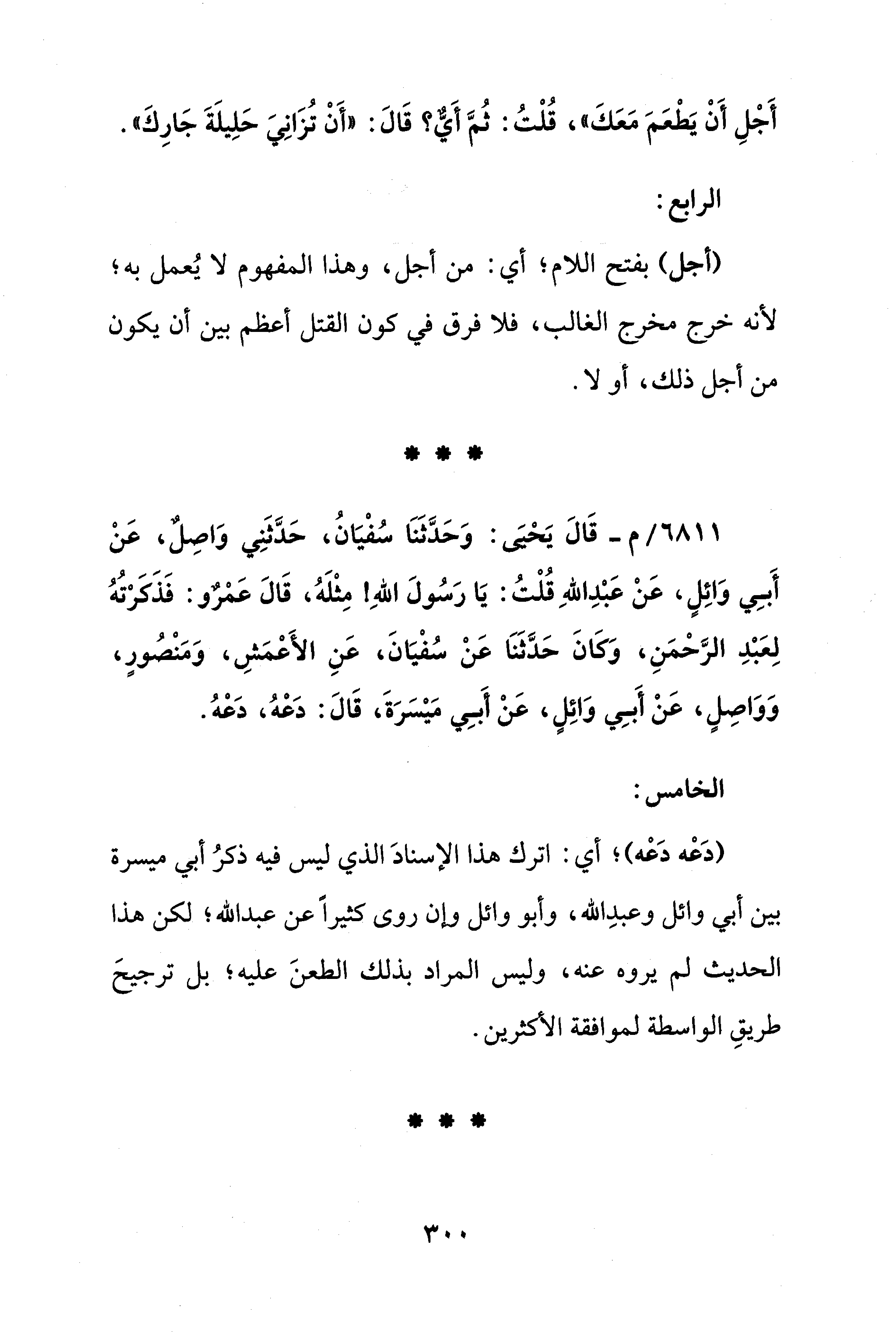 6811 / -م - قَالَ يَحْيَى: وَحَدَّثَنَا سُفْيَانُ، حَدَّثَنِي وَاصِلٌ، عَنْ أَبِي وَائِلٍ، عَنْ عَبْدِ اللهِ قُلْتُ: يَا رَسُولَ اللهِ! مِثْلَهُ، قَالَ عَمْرُو: فَذَكَرْتُهُ لِعَبْدِ الرَّحْمَنِ، وَكَانَ حَدَّثَنَا عَنْ سُفْيَانَ، عَنِ الأَعْمَشِ، وَمَنْصُورٍ، وَوَاصِلٍ، عَنْ أَبِي وَائِلٍ، عَنْ أَبِي مَيْسَرَةَ، قَالَ: دَعْهُ، دَعْهُ.