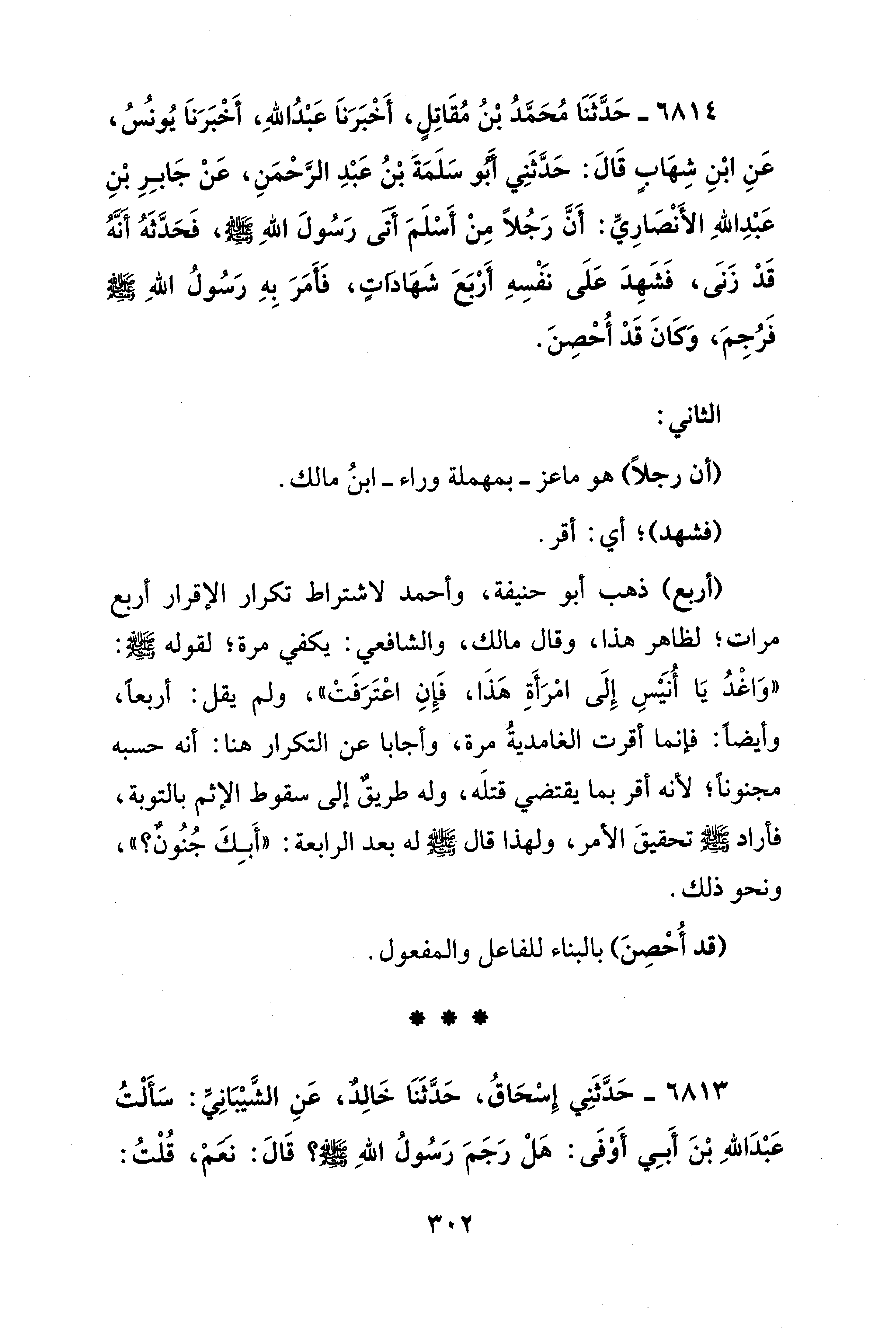 6813 - حَدَّثَنِي إِسْحَاقُ، حَدَّثَنَا خَالِدٌ، عَنِ الشَّيْبَانِيِّ: سَأَلْتُ عَبْدَ اللهِ بْنَ أَبِي أَوْفَى: هَلْ رَجَمَ رَسُولُ اللهِ - صلى الله عليه وسلم - قَالَ: نَعَمْ، قُلْتُ: