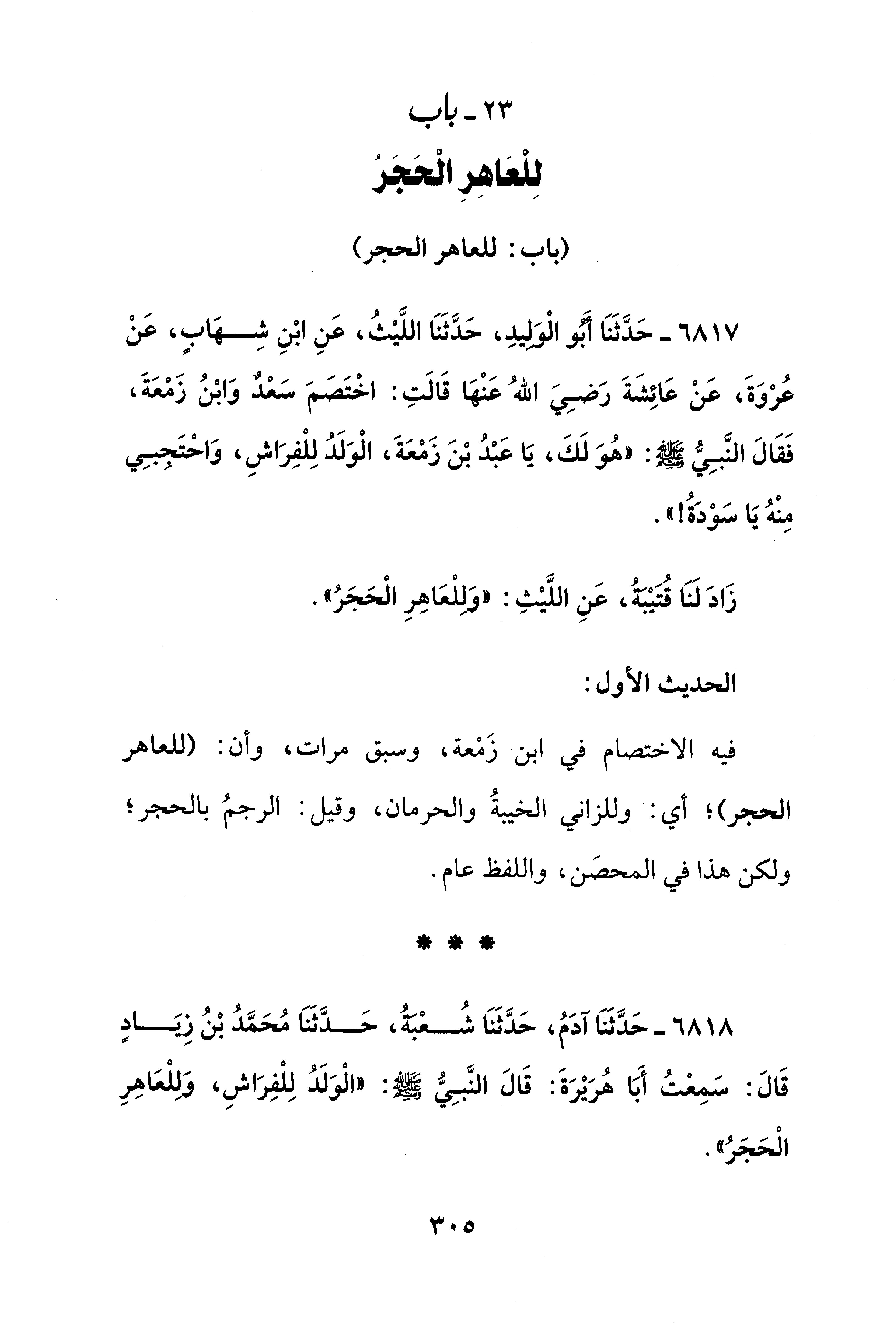 6818 - حَدَّثَنَا آدَمُ، حَدَّثَنَا شُعْبَةُ، حَدَّثَنَا مُحَمَّدُ بْنُ زِيَادٍ قَالَ: سَمِعْتُ أَبَا هُرَيْرَةَ: قَالَ النَّبِيُّ - صلى الله عليه وسلم -: "الْوَلَدُ لِلْفِرَاشِ، وَلِلْعَاهِرِ الْحَجَرُ".