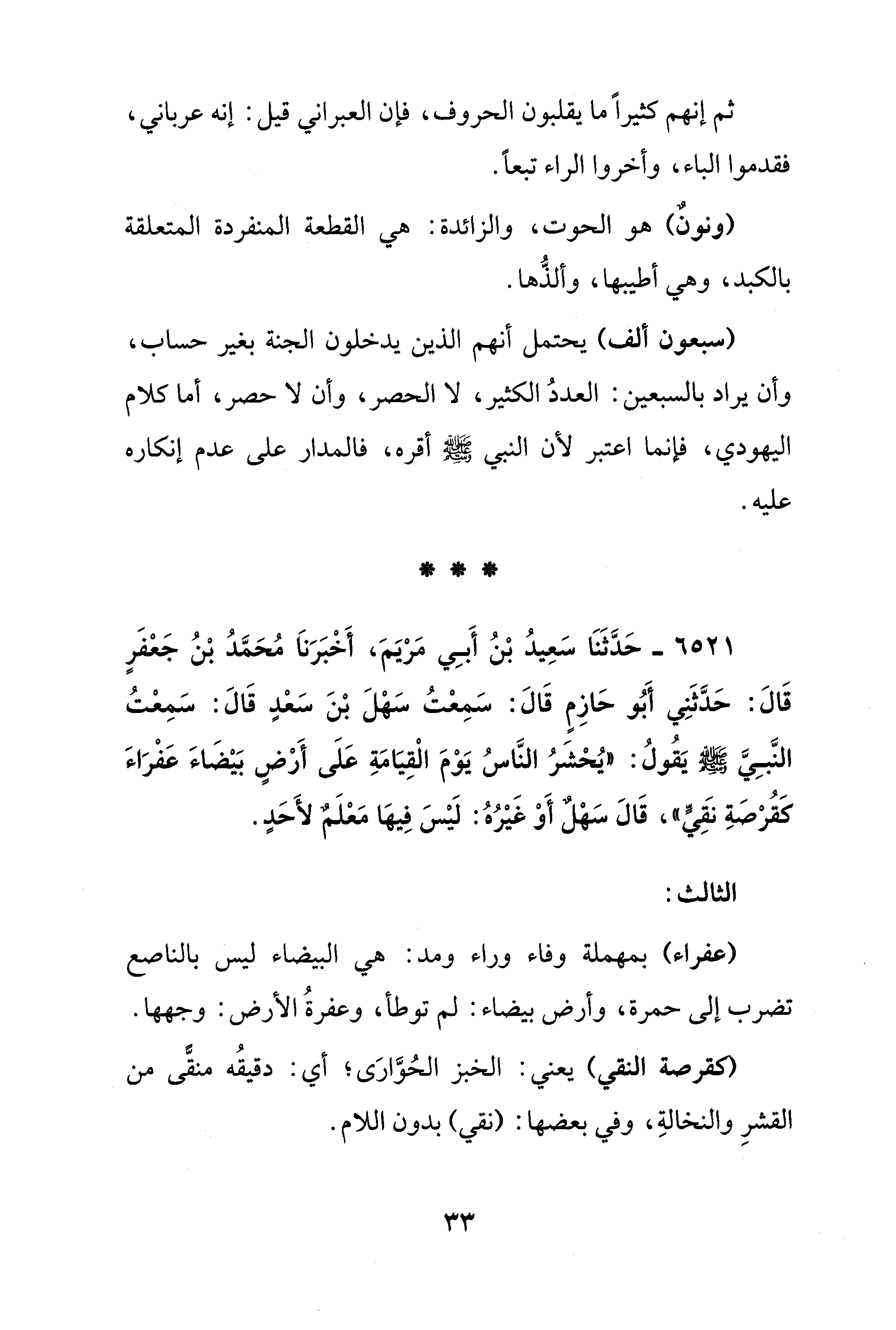 6521 - حَدَّثَنَا سَعِيدُ بْنُ أَبِي مَرْيَمَ، أَخْبَرَنَا مُحَمَّدُ بْنُ جَعْفَرٍ قَالَ: حَدَّثَنِي أَبُو حَازِمٍ قَالَ: سَمِعْتُ سَهْلَ بْنَ سَعْدٍ قَالَ: سَمِعْتُ النَّبِيَّ - صلى الله عليه وسلم - يَقُولُ: "يُحْشَرُ النَّاسُ يَوْمَ الْقِيَامَةِ عَلَى أَرْضٍ بَيْضَاءَ عَفْرَاءَ كقُرْصَةِ نَقِيٍّ"، قَالَ سَهْلٌ أَوْ غَيْرُهُ: لَيْسَ فِيهَا مَعْلَمٌ لأَحَدٍ.