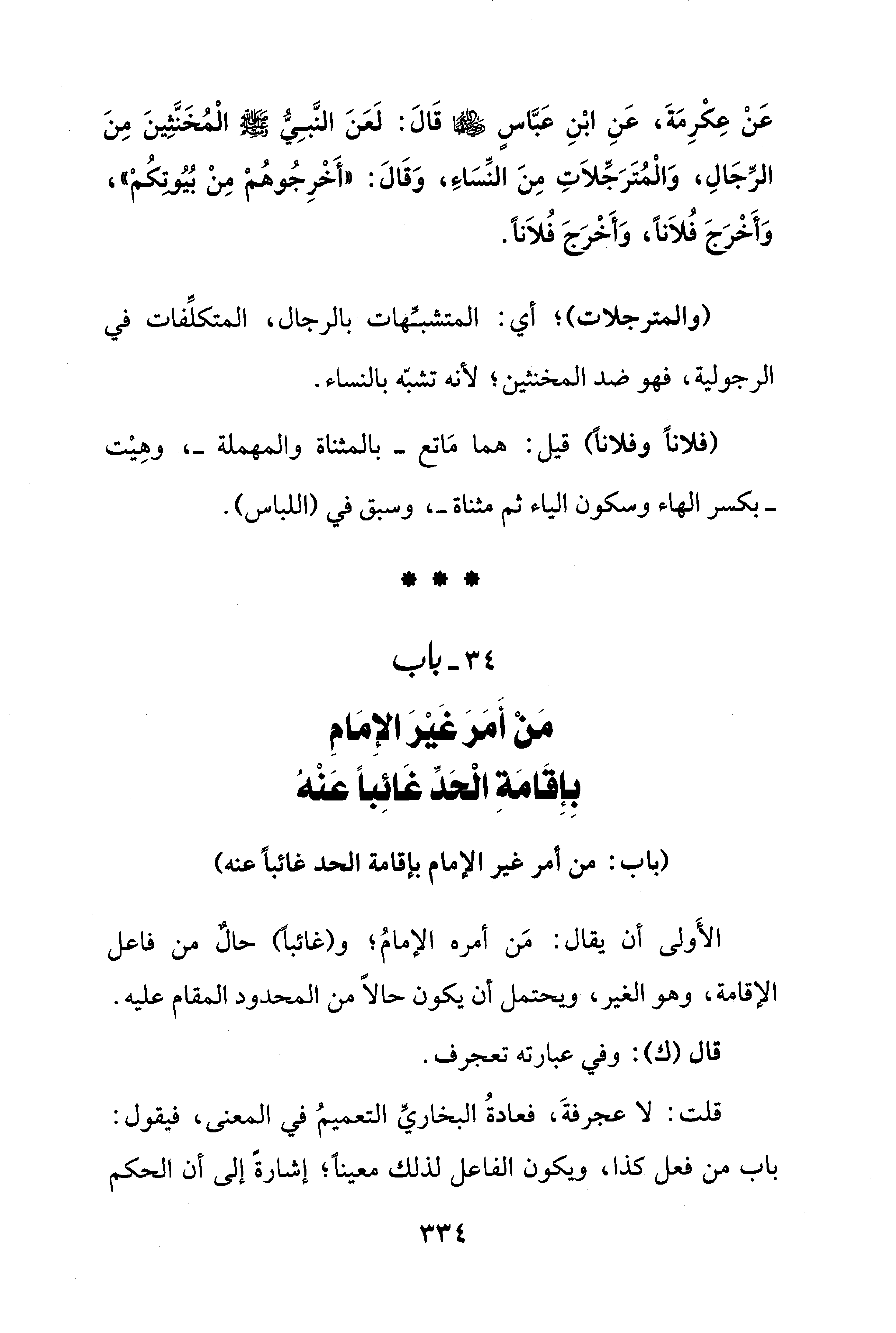 عَنْ عِكْرِمَةَ، عَنِ ابْنِ عَبَّاسٍ - رضي الله عنهما - قَالَ: لَعَنَ النَّبِيُّ - صلى الله عليه وسلم - الْمُخَنَّثِينَ مِنَ الرِّجَالِ، وَالْمُتَرَجِّلاَتِ مِنَ النِّسَاءِ، وَقَالَ: "أَخْرِجُوهُمْ مِنْ بُيُوتكُمْ"، وَأَخْرَجَ فُلاَنًا، وَأَخْرَجَ فلاَنًا.