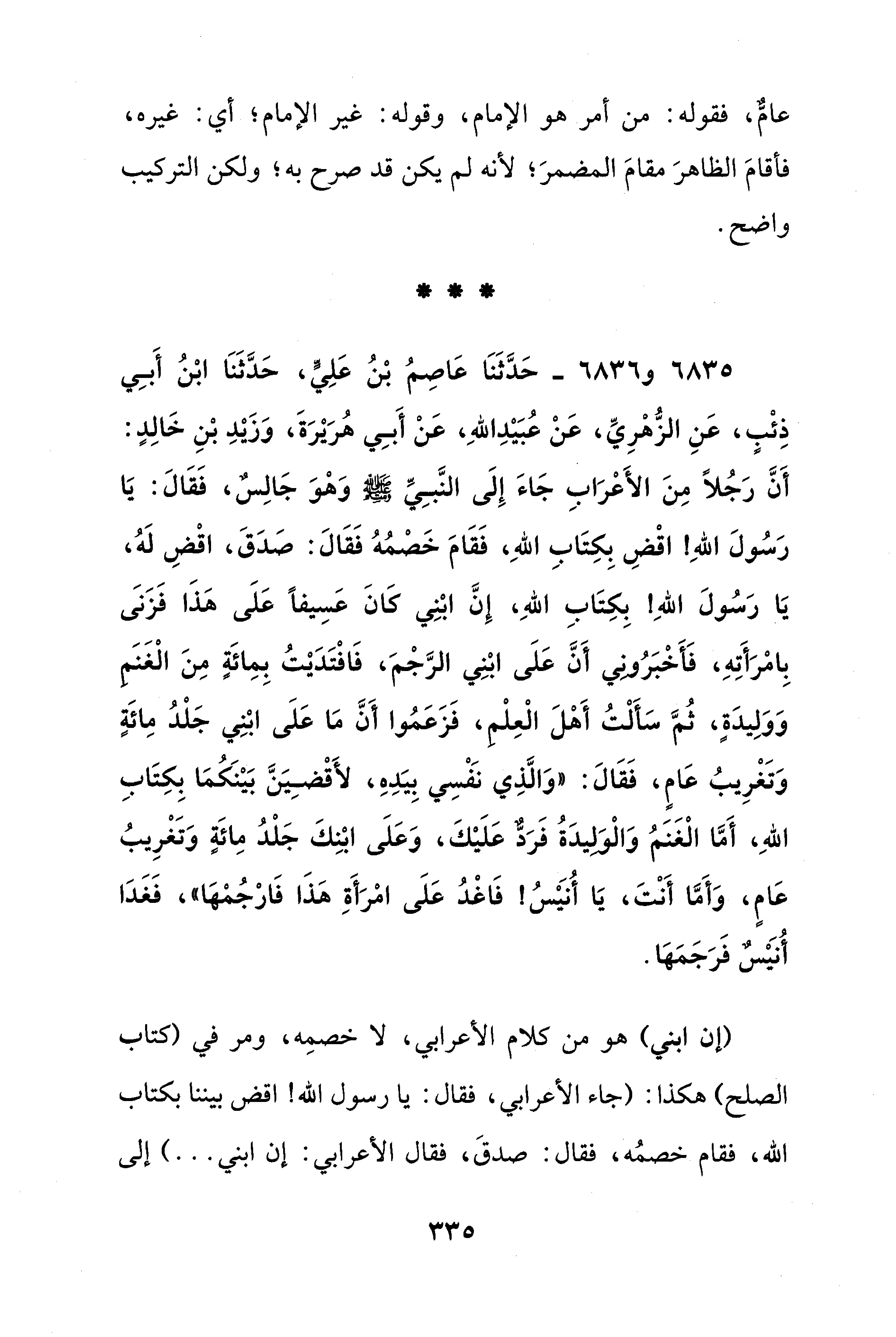 6835 - و 6836 - حَدَّثَنَا عَاصِمُ بْنُ عَلِيٍّ، حَدَّثَنَا ابْنُ أَبِي ذِئْبٍ، عَنِ الزُّهْرِيِّ، عَنْ عُبَيْدِ اللهِ، عَنْ أَبِي هُرَيْرَةَ، وَزَيْدِ بْنِ خَالِدٍ: أَنَّ رَجُلًا مِنَ الأَعْرَابِ جَاءَ إِلَى النَّبِيِّ - صلى الله عليه وسلم - وَهْوَ جَالِسٌ، فَقَالَ: يَا رَسُولَ اللهِ! اقْضِ بِكِتَابِ اللهِ، فَقَامَ خَصْمُهُ فَقَالَ: صَدَقَ، اقْضِ لَهُ، يَا رَسُولَ اللهِ! بِكِتَابِ اللهِ، إِنَّ ابْنِي كَانَ عَسِيفًا عَلَى هَذَا فَزَنىَ بِامْرَأَتِهِ، فَأَخْبَرُونِي أَنَّ عَلَى ابْنِي الرَّجْمَ، فَافْتَدَيْتُ بِمِائَةٍ مِنَ الْغَنَمِ وَوَلِيدَةٍ، ثُمَّ سَأَلْتُ أَهْلَ الْعِلْم، فَزَعَمُوا أَنَّ مَا عَلَى ابْنِي جَلْدُ مِائَةٍ وَتَغْرِيبُ عَامٍ، فَقَالَ: "وَالَّذِي نَفْسِي بِيَدِهِ، لأَقْضِيَنَّ بَيْنَكُمَا بِكِتَابِ اللهِ، أَمَّا الْغَنَمُ وَالْوَلِيدَةُ فَرَدٌّ عَلَيْكَ، وَعَلَى ابْنِكَ جَلْدُ مِائَةٍ وَتَغْرِيبُ عَامٍ، وَأَمَّا أَنْتَ، يَا أُنيسُ! فَاغْدُ عَلَى امْرَأَةِ هَذَا فَارْجُمْهَا"، فَغَدَا أُنَيْسٌ فَرَجَمَهَا.