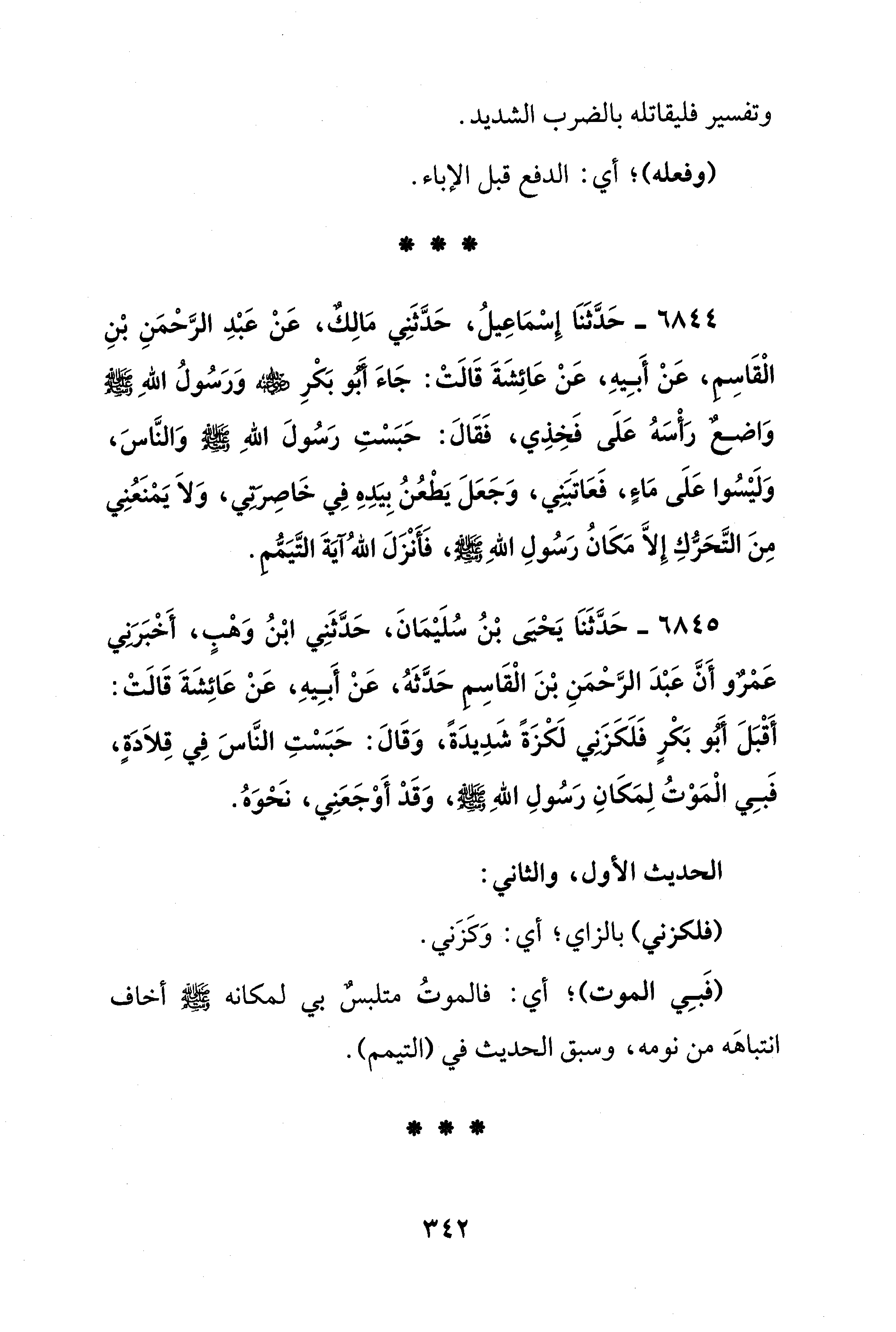 6845 - حَدَّثَنَا يَحْيَى بْنُ سُلَيْمَانَ، حَدَّثَنِي ابْنُ وَهْبٍ، أَخْبَرَنِي عَمْرٌو أَنَّ عَبْدَ الرَّحْمَنِ بْنَ الْقَاسِم حَدَّثَهُ، عَنْ أَبِيهِ، عَنْ عَائِشَةَ قَالَتْ: أَقْبَلَ أَبُو بَكْرٍ فَلَكَزَنِي لَكْزَةً شَدِيدَةً، وَقَالَ: حَبَسْتِ النَّاسَ فِي قِلاَدَةٍ، فَبِي الْمَوْتُ لِمَكَانِ رَسُولِ اللهِ - صلى الله عليه وسلم -، وَقَدْ أَوْجَعَنِي، نَحْوَهُ.
