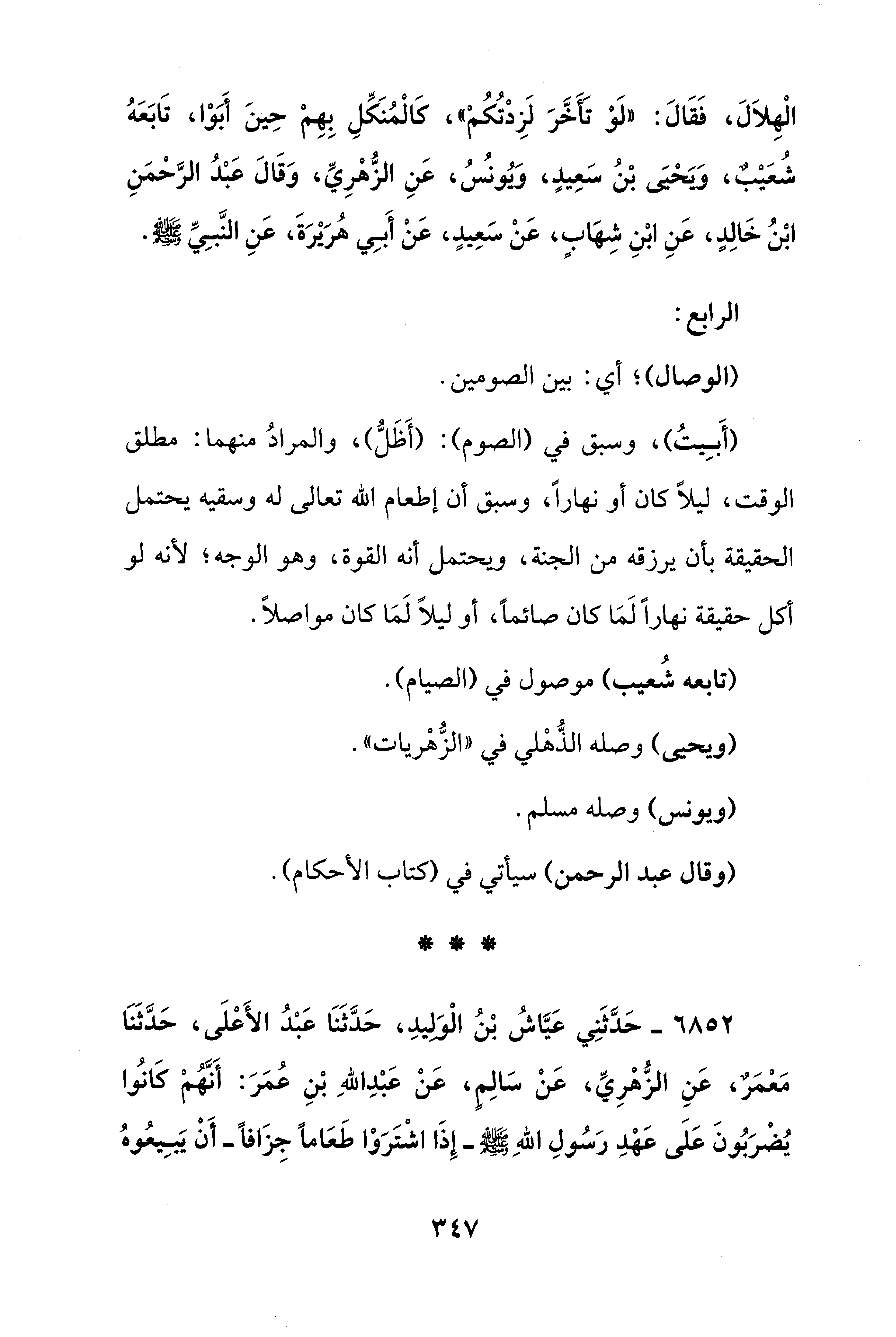الْهِلاَلَ، فَقَالَ: "لَوْ تَأَخَّرَ لَزِدْتُكُمْ"، كَالْمُنَكِّلِ بِهِمْ حِينَ أَبَوْا، تَابَعَهُ شُعَيْبٌ، وَيَحْيَى بْنُ سَعِيدٍ، ويُونُسُ، عَنِ الزُّهْرِيِّ، وَقَالَ عَبْدُ الرَّحْمَنِ بْنُ خَالِدٍ، عَنِ ابْنِ شِهَابٍ، عَنْ سَعِيدٍ، عَنْ أَبِي هُرَيْرَةَ، عَنِ النَّبِيِّ - صلى الله عليه وسلم -.