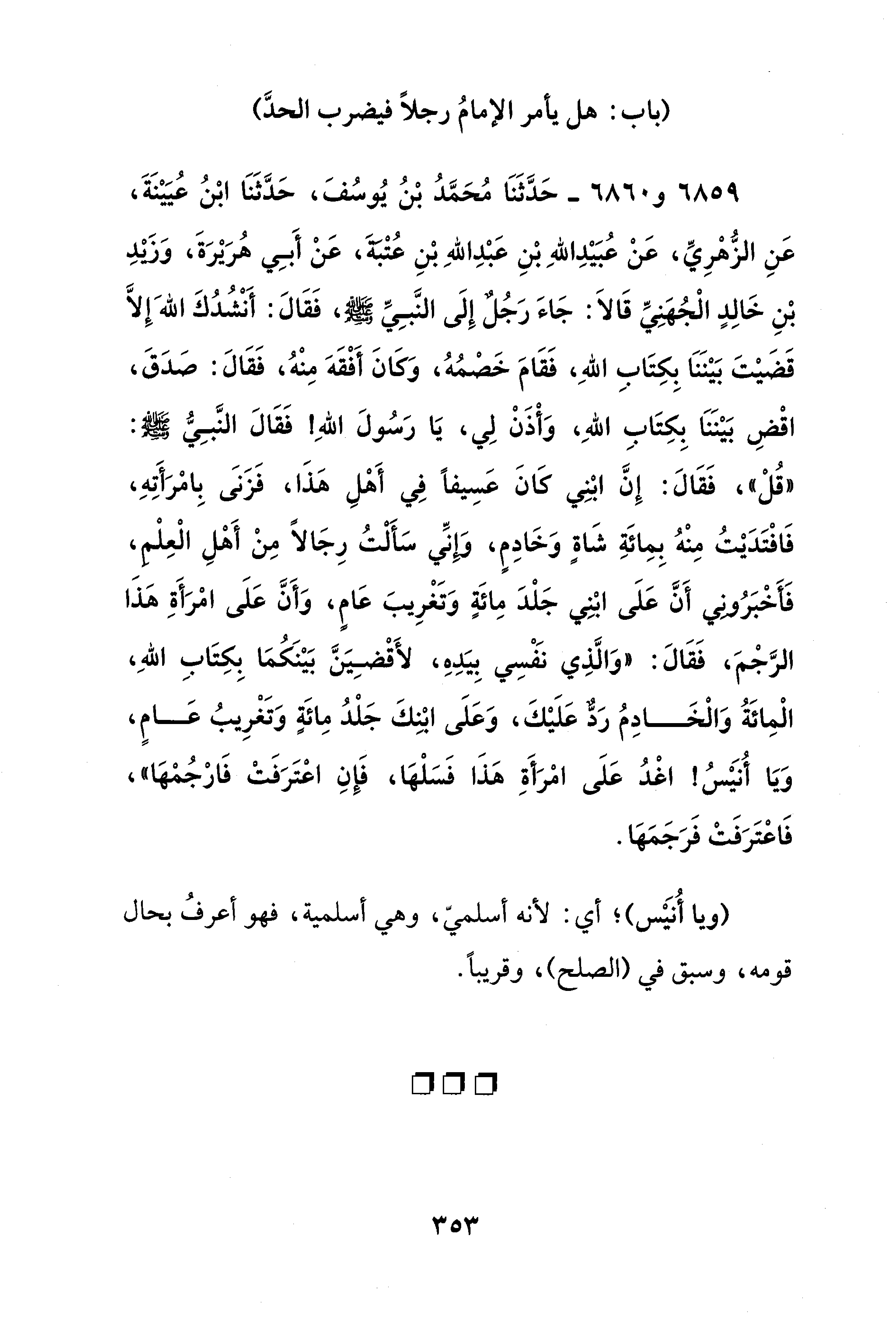 6859 - و 6860 - حَدَّثَنَا مُحَمَّدُ بْنُ يُوسُفَ، حَدَّثَنَا ابْنُ عُيَيْنَةَ، عَنِ الزُّهْرِيِّ، عَنْ عُبَيْدِ اللهِ بْنِ عَبْدِ اللهِ بْنِ عُتْبَةَ، عَنْ أَبِي هُرَيْرَةَ، وَزَيْدِ بْنِ خَالِدٍ الْجُهَنِيِّ قَالَا: جَاءَ رَجُلٌ إِلَى النَّبِيِّ - صلى الله عليه وسلم -، فَقَالَ: أَنْشُدُكَ اللهَ إِلَّا قَضَيْتَ بَيْنَنَا بِكِتَابِ اللهِ، فَقَامَ خَصْمُهُ، وَكَانَ أَفْقَهَ مِنْهُ، فَقَالَ: صَدَقَ، اقْضِ بَيْنَنَا بِكِتَابِ اللهِ، وَأْذَنْ لِي، يَا رَسُولَ اللهِ! فَقَالَ النَّبِيُّ - صلى الله عليه وسلم -: "قُلْ"، فَقَالَ: إِنَّ ابْنِي كَانَ عَسِيفًا فِي أَهْلِ هَذَا، فَزَنىَ بِامْرَأَتِهِ، فَافْتَدَيْتُ مِنْهُ بِمِائَةِ شَاةٍ وَخَادِمٍ، وَإِنِّي سَأَلْتُ رِجَالًا مِنْ أَهْلِ الْعِلْمِ، فَأَخْبَرُونِي أَنَّ عَلَى ابْنِي جَلْدَ مِائَةٍ وَتَغْرِيبَ عَامٍ، وَأَنَّ عَلَى امْرَأَةِ هَذَا الرَّجْمَ، فَقَالَ: "وَالَّذِي نَفْسِي بِيَدِهِ، لأَقْضِيَنَّ بَيْنَكُمَا بِكِتَابِ اللهِ، الْمِائَةُ وَالْخَادِمُ رَدٌّ عَلَيْكَ، وَعَلَى ابْنِكَ جَلْدُ مِائَةٍ وَتَغْرِيبُ عَامٍ، وَيَا أُنَيْسُ! اغْدُ عَلَى امْرَأَةِ هَذَا فَسَلْهَا، فَإنِ اعْتَرَفَتْ فَارْجُمْهَا"، فَاعْتَرَفَتْ فَرَجَمَهَا.