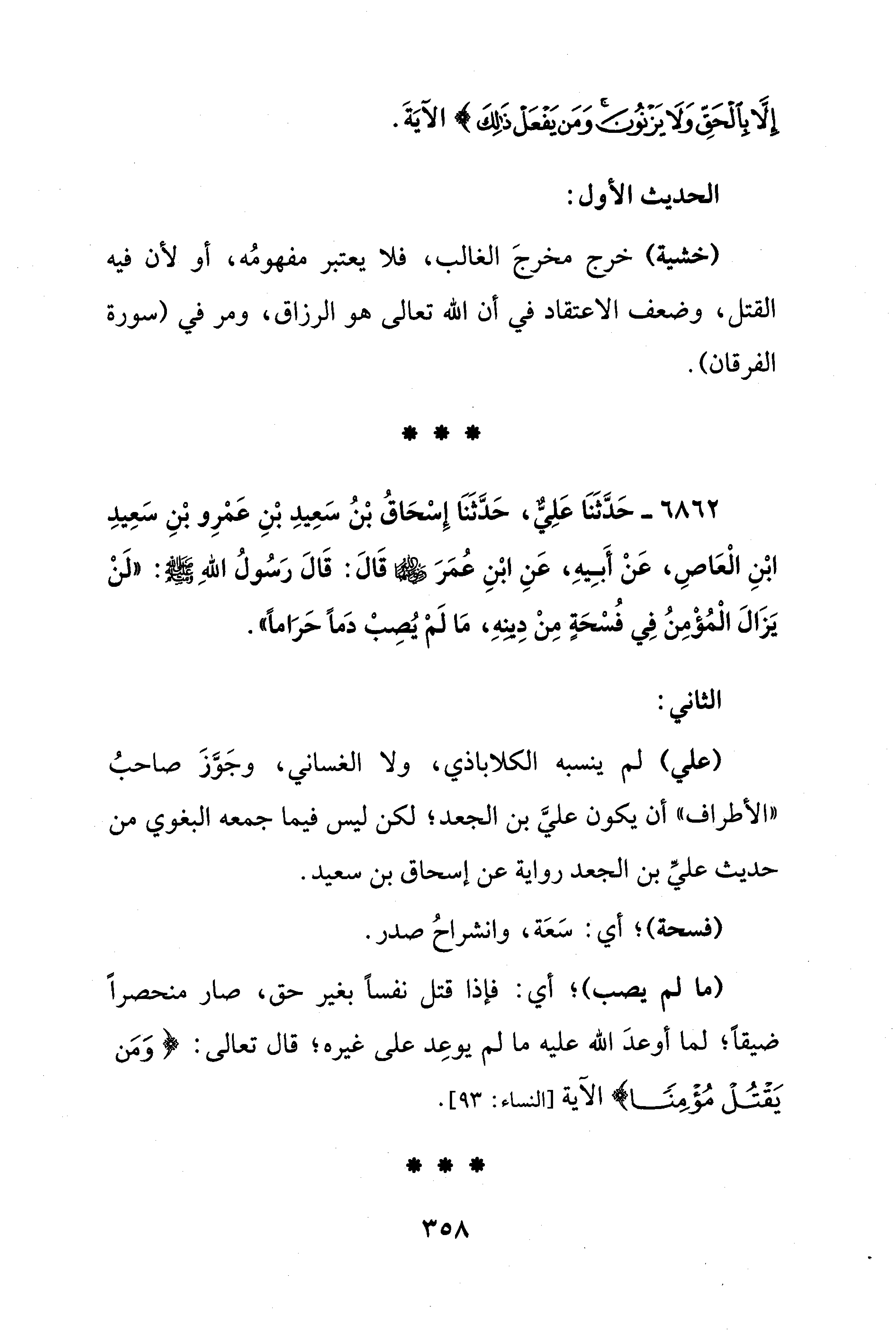 6862 - حَدَّثَنَا عَلِيٌّ، حَدَّثَنَا إِسْحَاقُ بْنُ سَعِيدِ بْنِ عَمْرِو بْنِ سَعِيدِ بْنِ الْعَاصِ، عَنْ أَبِيهِ، عَنِ ابْنِ عُمَرَ - رضي الله عنهما - قَالَ: قَالَ رَسُولُ اللهِ - صلى الله عليه وسلم -: "لَنْ يَزَالَ الْمُؤْمِنُ فِي فُسْحَةٍ مِنْ دِيِنهِ مَا لَمْ يُصِبْ دَمًا حَرَامًا".