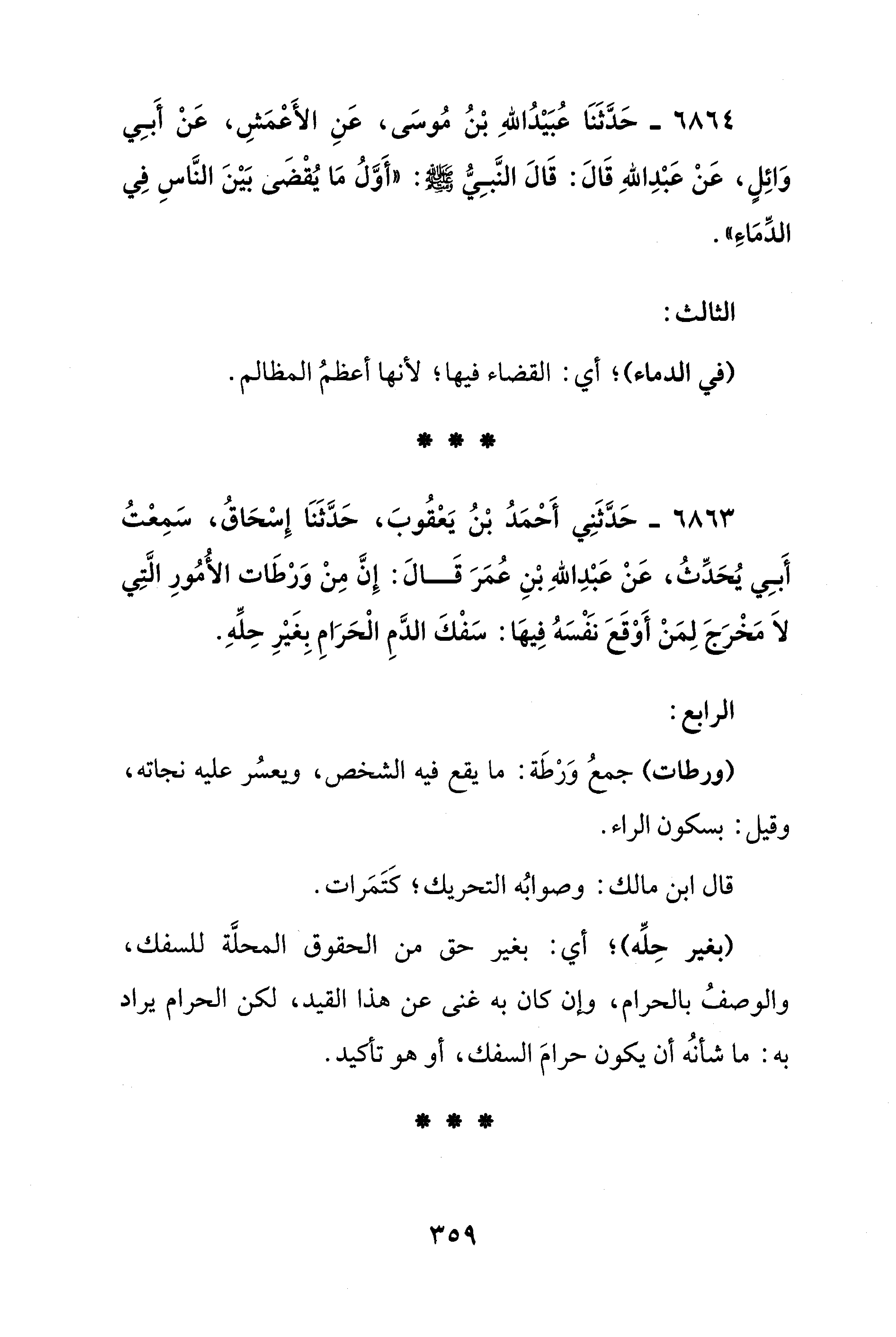 6864 - حَدَّثَنَا عُبَيْدُ اللهِ بْنُ مُوسَى، عَنِ الأَعْمَشِ، عَنْ أَبِي وَائِلٍ، عَنْ عَبْدِ اللهِ قَالَ: قَالَ النَّبِيُّ - صلى الله عليه وسلم -: "أَوَّلُ مَا يُقْضَى بَيْنَ النَّاسِ فِي الدِّمَاءِ".