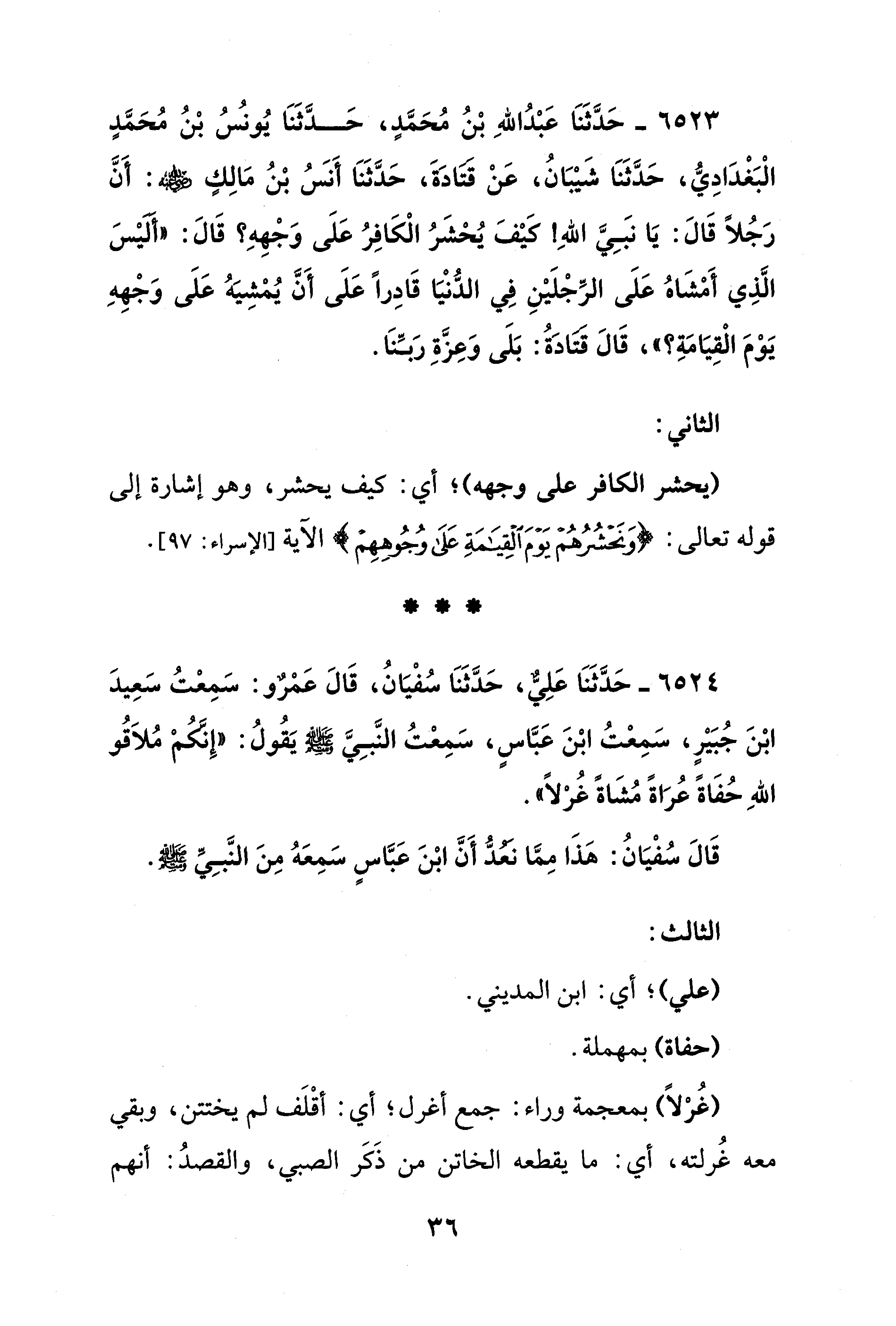 6524 - حَدَّثَنَا عَلِيٌّ، حَدَّثَنَا سُفْيَانُ، قَالَ عَمْرٌو: سَمِعْتُ سَعِيدَ بْنَ جُبَيْرٍ، سَمِعْتُ ابْنَ عَبَّاسٍ، سَمِعْتُ النَّبِيَّ - صلى الله عليه وسلم - يَقُولُ: "إِنَّكُمْ مُلاَقُو اللهِ حُفَاةً عُرَاةً مُشَاةً غُرْلًا".