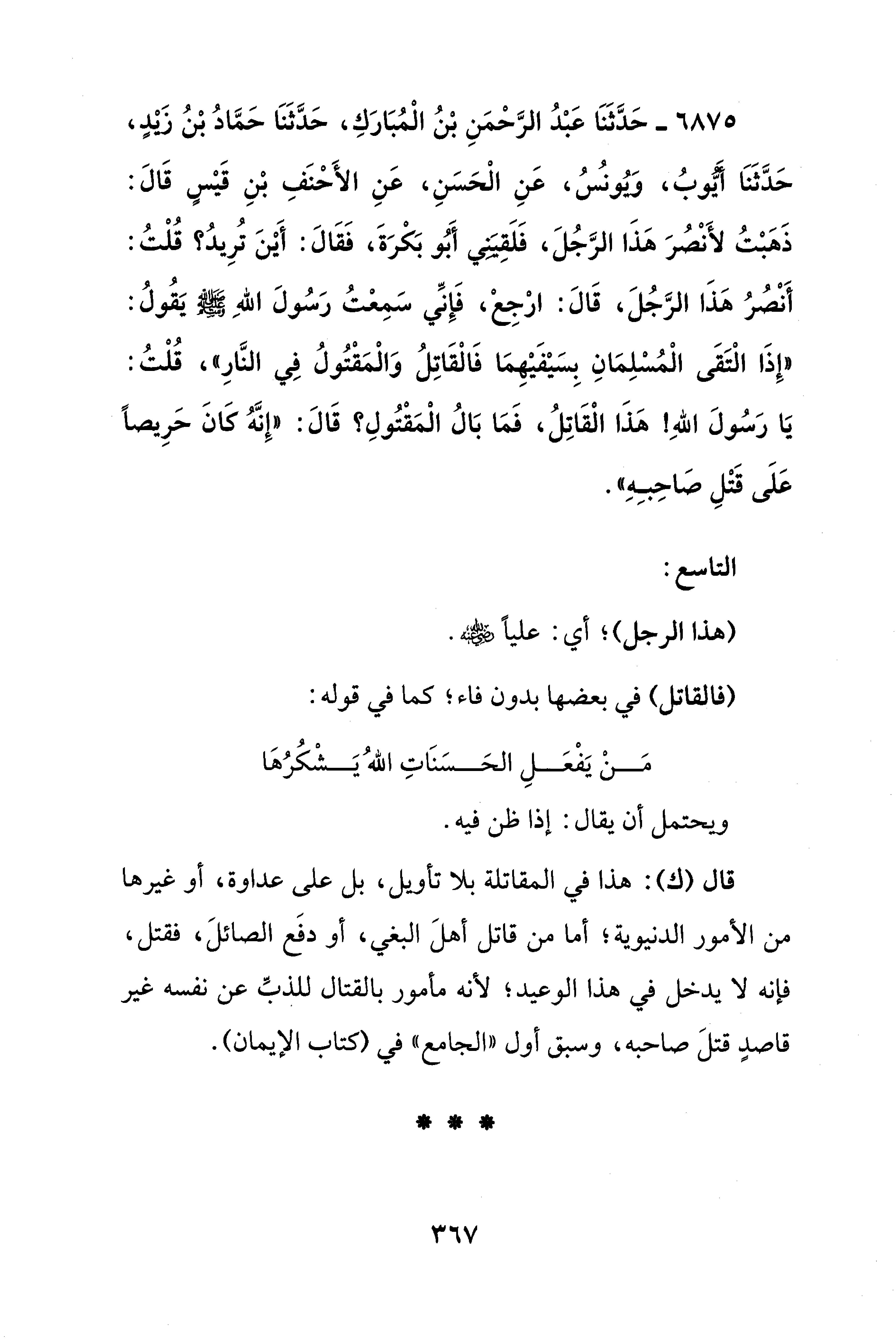 6875 - حَدَّثَنَا عَبْدُ الرَّحْمَنِ بْنُ الْمُبَارَكِ، حَدَّثَنَا حَمَّادُ بْنُ زَيْدٍ، حَدَّثَنَا أَيُّوبُ، وَيُونُسُ، عَنِ الْحَسَنِ، عَنِ الأَحْنَفِ بْنِ قَيْسٍ قَالَ: ذَهبْتُ لأَنْصُرَ هَذَا الرَّجُلَ، فَلَقِيَنِي أَبُو بَكْرَةَ، فَقَالَ: أَيْنَ تُرِيدُ؟ قُلْتُ: أَنْصُرُ هَذَا الرَّجُلَ، قَالَ: ارْجِعْ، فَإنِّي سَمِعْتُ رَسُولَ اللهِ - صلى الله عليه وسلم - يَقُولُ: "إِذَا الْتَقَى الْمُسْلِمَانِ بِسَيْفَيْهِمَا فَالْقَاتِلُ وَالْمَقْتُولُ فِي النَّارِ"، قُلْتُ: يَا رَسُولَ اللهِ! هَذَا الْقَاتِلُ، فَمَا بَالُ الْمَقْتُولِ؟ قَالَ: "إِنَّهُ كَانَ حَرِيصًا عَلَى قَتْلِ صَاحِبِهِ".