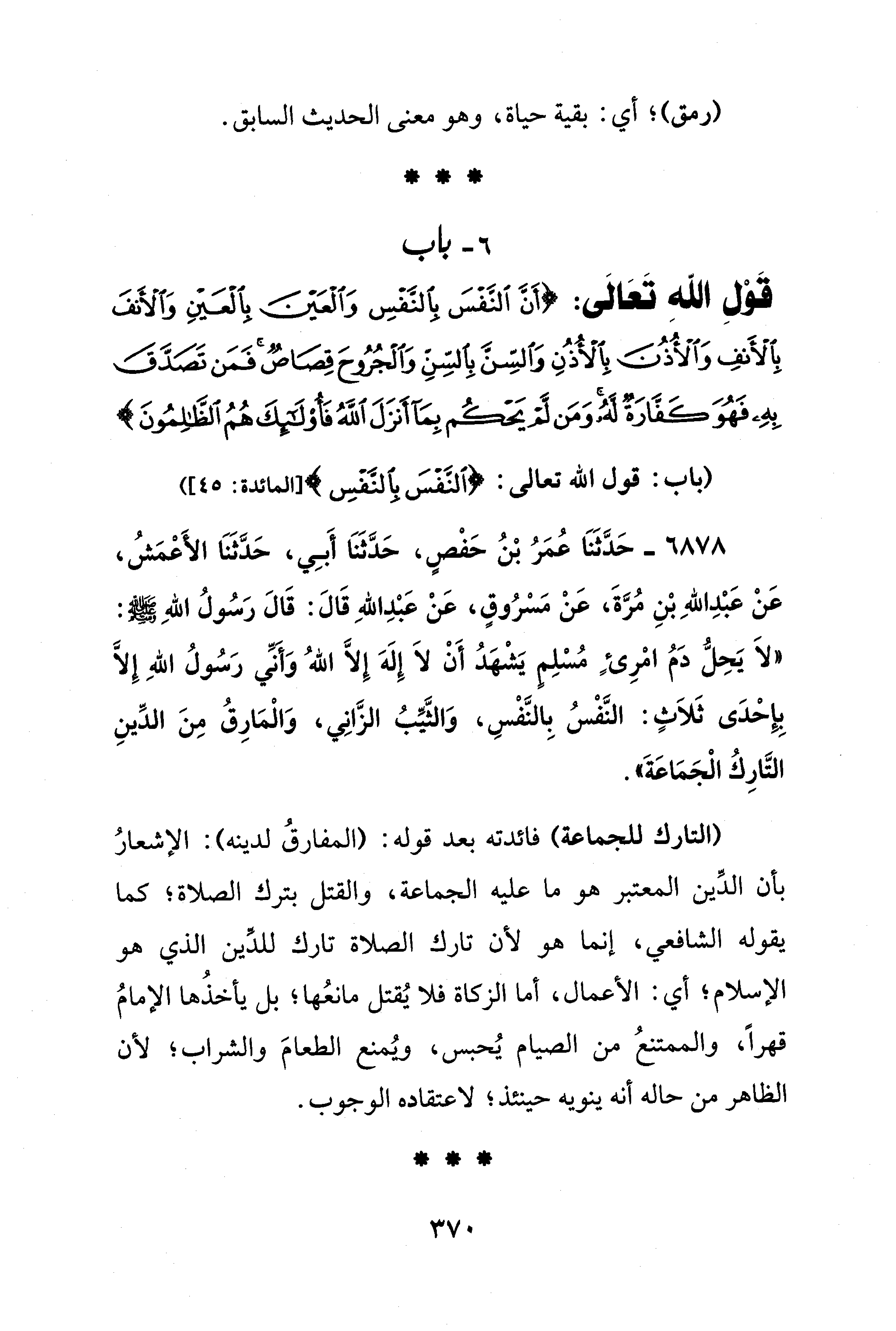 6878 - حَدَّثَنَا عُمَرُ بْنُ حَفْصٍ، حَدَّثَنَا أَبِي، حَدَّثَنَا الأَعْمَشُ، عَنْ عَبْدِ اللهِ بْنِ مُرَّةَ، عَنْ مَسْرُوقٍ، عَنْ عَبْدِ اللهِ قَالَ: قَالَ رَسُولُ اللهِ - صلى الله عليه وسلم -: "لَا يَحِلُّ دَمُ امْرِئٍ مُسْلِمٍ يَشْهَدُ أَنْ لَا إِلَهَ إِلَّا اللهُ وَأَنِّي رَسُولُ اللهِ إِلَّا بِإِحْدَى ثَلاَثٍ: النَّفْسُ بِالنَّفْسِ، وَالثَّيِّبُ الزَّانِي، وَالْمَارِقُ مِنَ الدِّينِ التَّارِكُ الْجَمَاعَةَ".