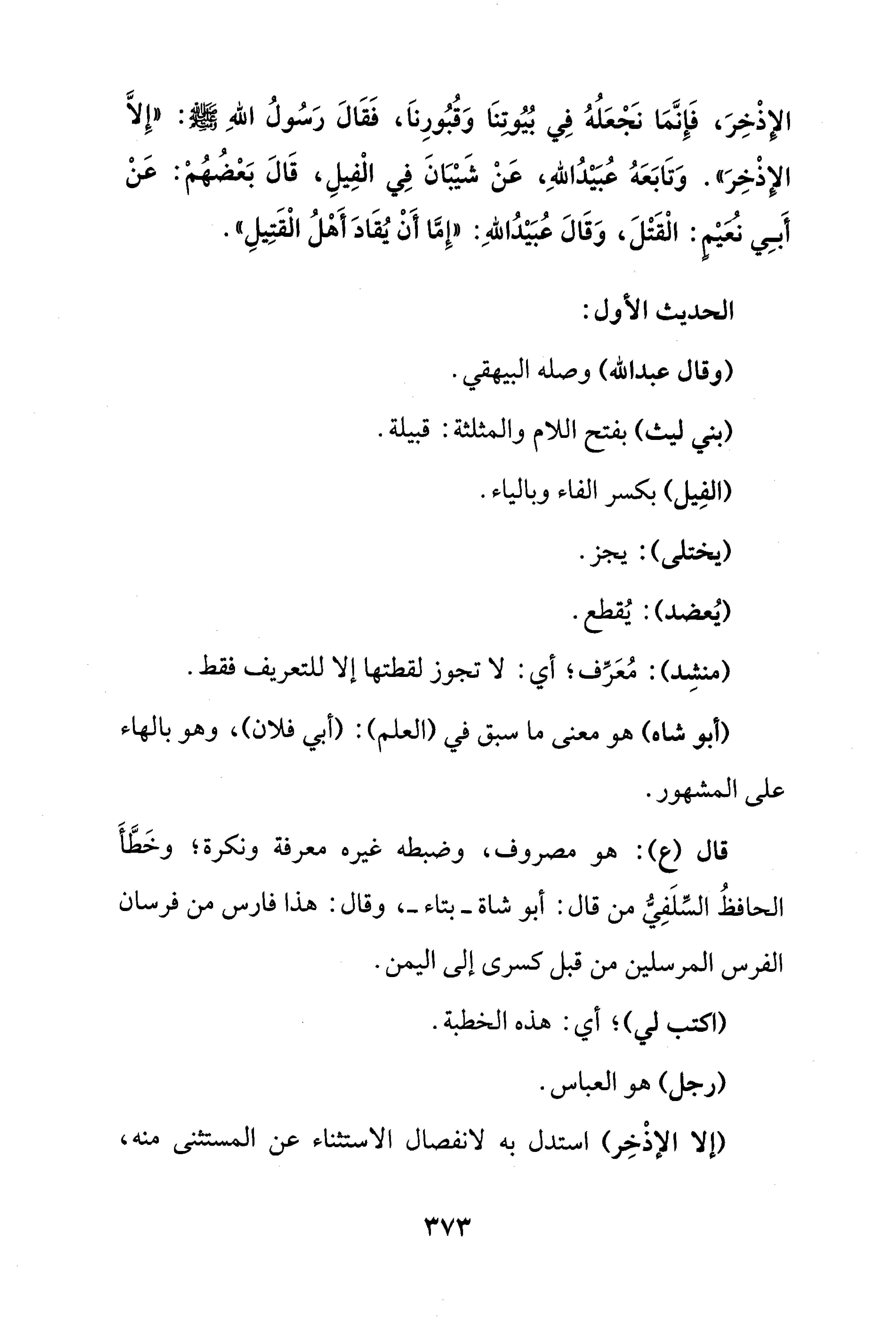 الإذْخِرَ، فَإِنَّمَا نَجْعَلُهُ فِي بُيُوتنَا وَقُبُورِنَا، فَقَالَ رَسُولُ اللهِ - صلى الله عليه وسلم -: "إِلَّا الإِذْخِرَ". وَتَابَعَهُ عُبَيْدُ اللهِ، عَنْ شَيْبَانَ فِي الْفِيلِ، قَالَ بَعْضُهُمْ: عَنْ أَبِي نُعَيْمٍ: الْقَتْلَ، وَقَالَ عُبَيْدُ اللهِ: "إِمَّا أَنْ يُقَادَ أَهْلُ الْقَتِيلِ".