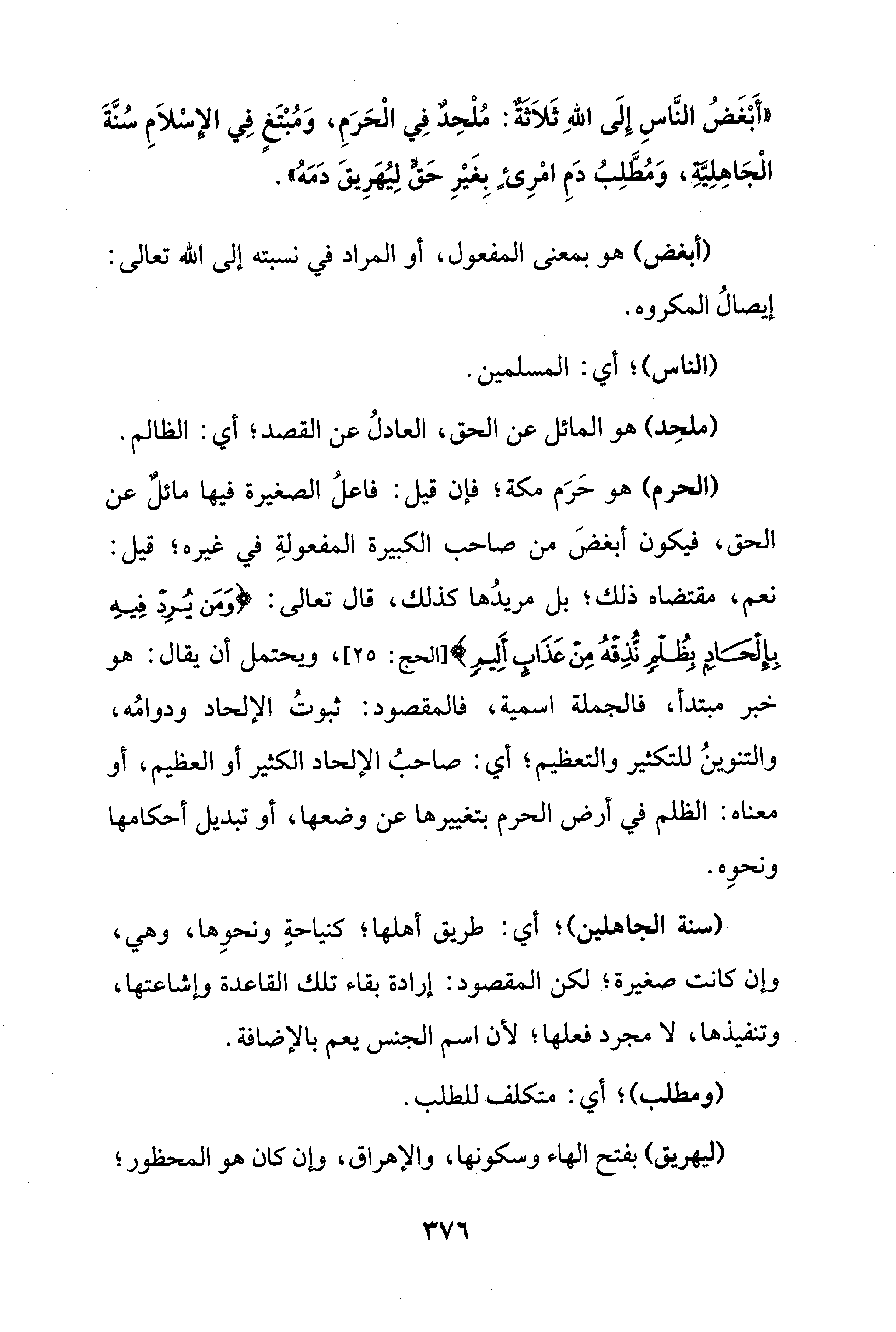 "أَبْغَضُ النَّاسِ إِلَى اللهِ ثَلاَثَةٌ: مُلْحِدٌ فِي الْحَرَمِ، وَمُبْتَغٍ فِي الإِسْلاَمِ سُنَّةَ الْجَاهِلِيَّةِ، وَمُطَّلِبُ دَمِ امْرِئٍ بِغَيْرِ حَقٍّ لِيُهَرِيقَ دَمَهُ".