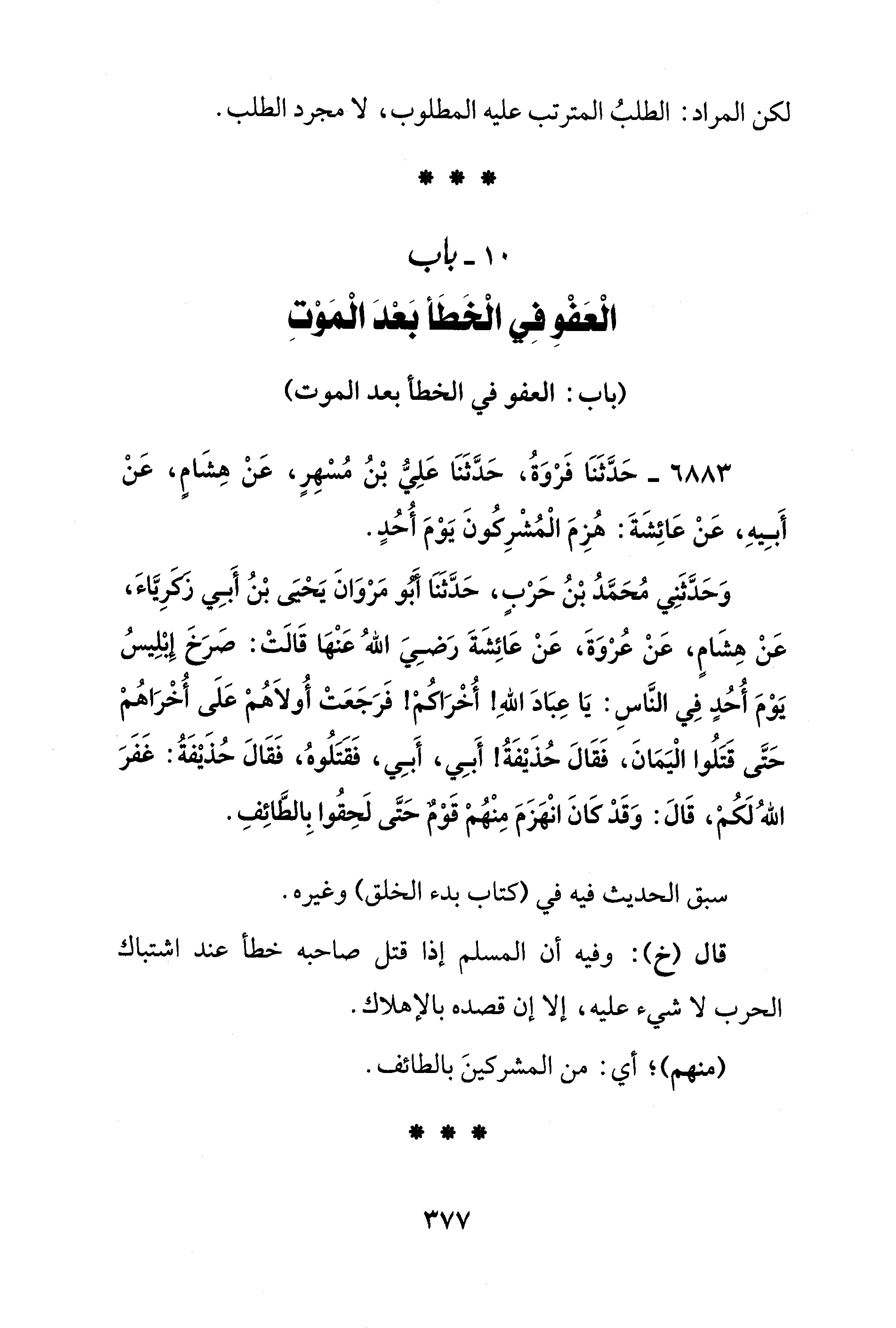 وَحَدَّثَنِي مُحَمَّدُ بْنُ حَرْبٍ، حَدَّثَنَا أَبُو مَرْوَانَ يَحْيَى بْنُ أَبِي زَكَرِيَّاءَ، عَنْ هِشَامٍ، عَنْ عُرْوَةَ، عَنْ عَائِشَةَ رَضِيَ اللهُ عَنْهَا قَالَتْ: صَرَخَ إِبْلِيسُ يَوْمَ أُحُدٍ فِي النَّاسِ: يَا عِبَادَ اللهِ! أُخْرَاكُمْ! فَرَجَعَتْ أُولاَهُمْ عَلَى أُخْرَاهُمْ حَتَّى قَتَلُوا الْيَمَانَ، فَقَالَ حُذَيْفَةُ! أَبِي، أَبِي، فَقَتَلُوهُ، فَقَالَ حُذَيْفَةُ: غَفَرَ اللهُ لَكُمْ، قَالَ: وَقَدْ كَانَ انْهَزَمَ مِنْهُمْ قَوْمٌ حَتَّى لَحِقُوا بِالطَّائِفِ.