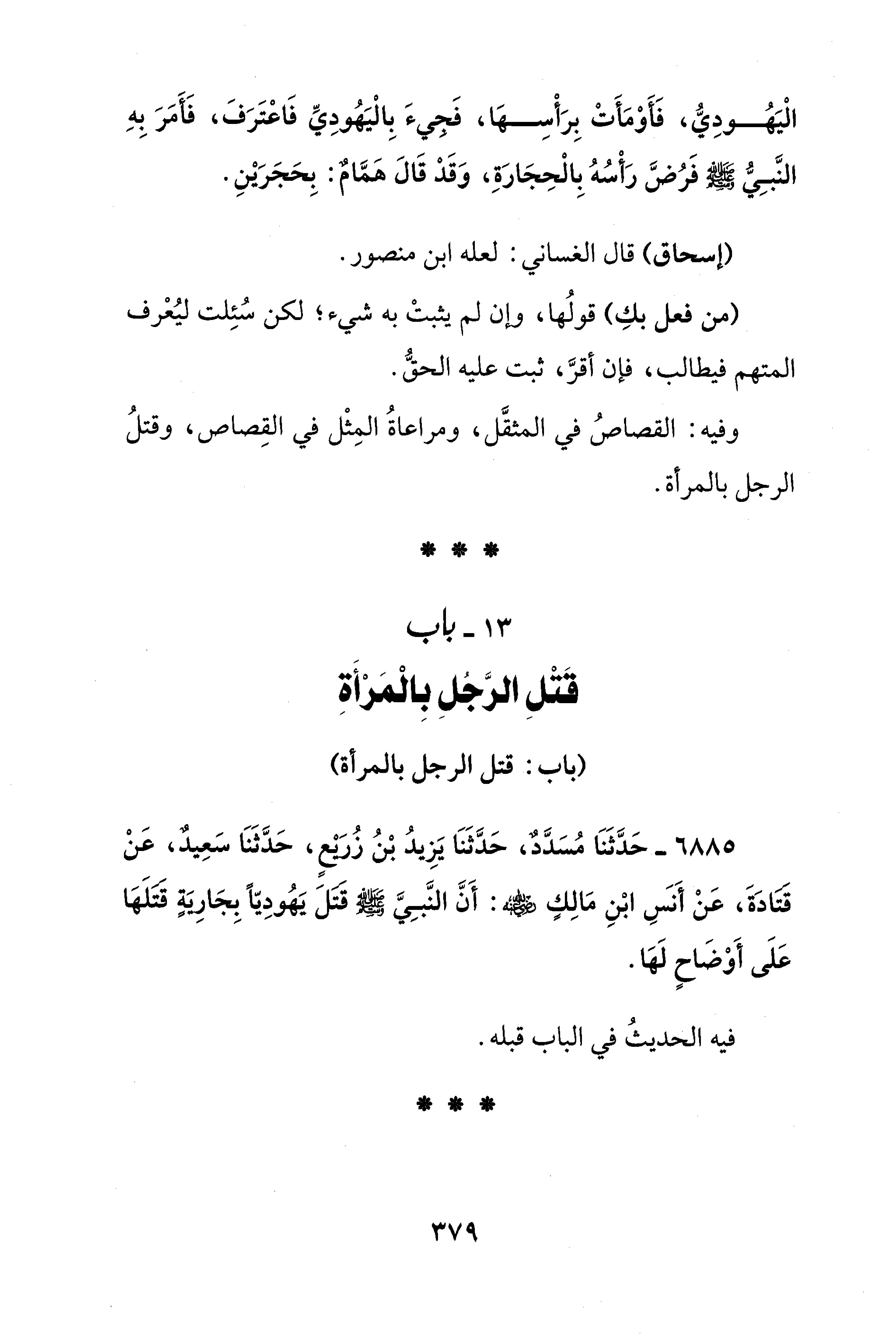 6885 - حَدَّثَنَا مُسَدَّدٌ، حَدَّثَنَا يَزِيدُ بْنُ زُرَيْعٍ، حَدَّثَنَا سَعِيدٌ، عَنْ قَتَادَةَ، عَنْ أَنَسِ بْنِ مَالِكٍ - رضي الله عنه -: أَنَّ النَّبِيَّ - صلى الله عليه وسلم - قَتَلَ يَهُودِيًّا بِجَارِيَةٍ قَتَلَهَا عَلَى أَوْضَاحٍ لَهَا.